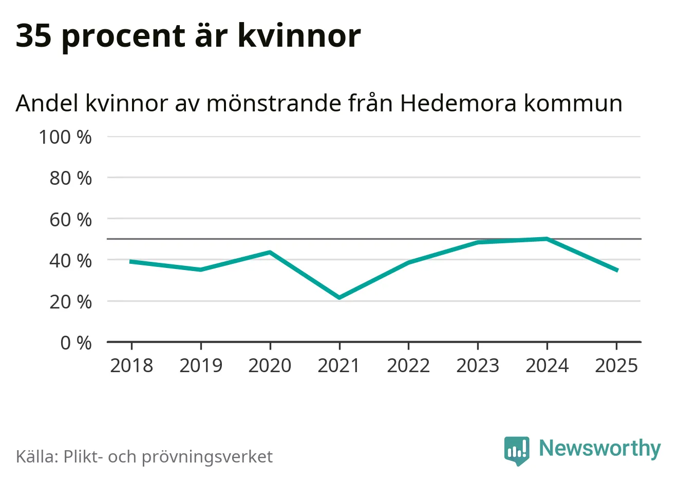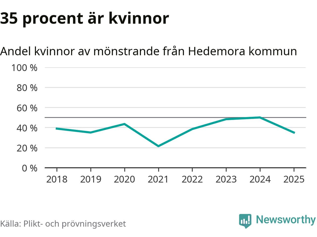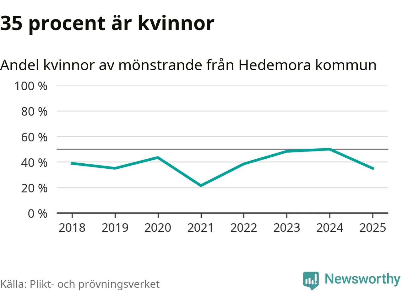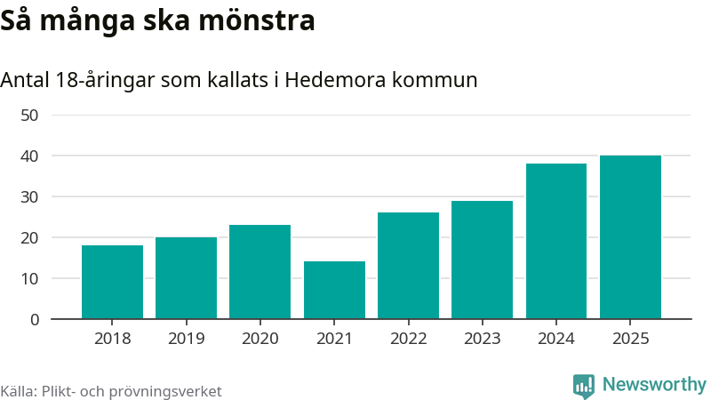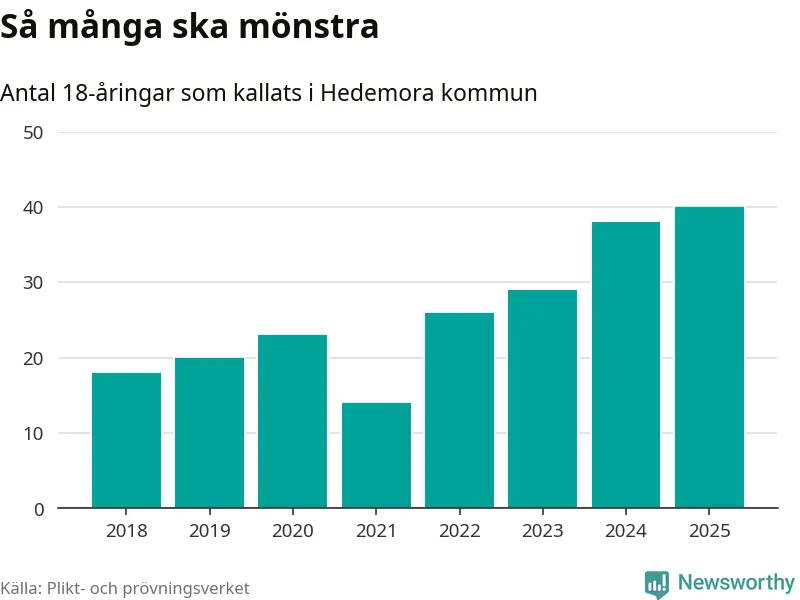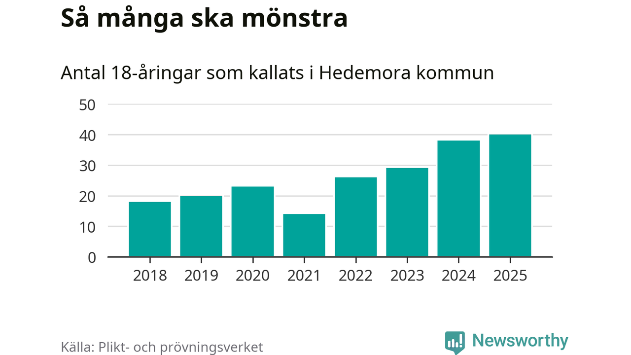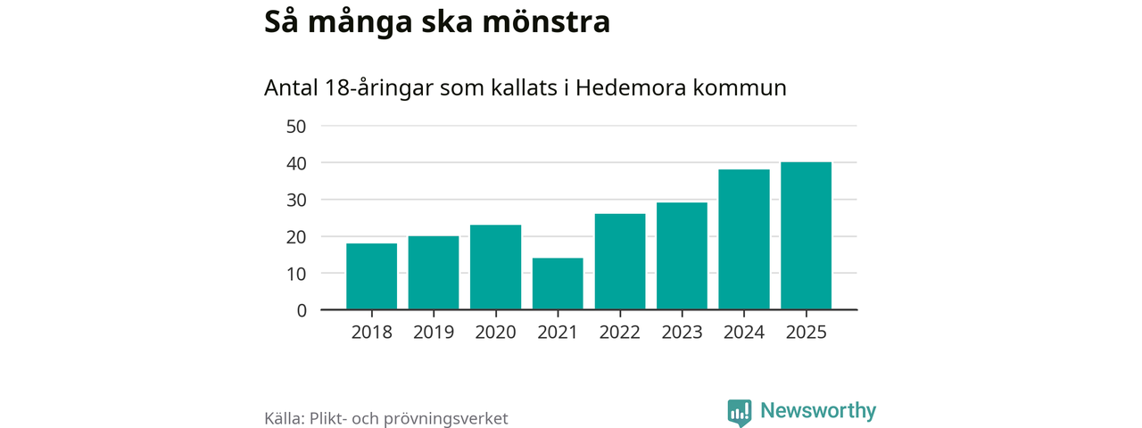 40 personer är det högsta antalet kallade i Hedemora sedan 2018, som är första året med statistik på kommunnivå (värnplikten återinfördes 2017), och två mönstrande fler än 2024. Totalt från Dalarnas län kallas 693 personer i år.