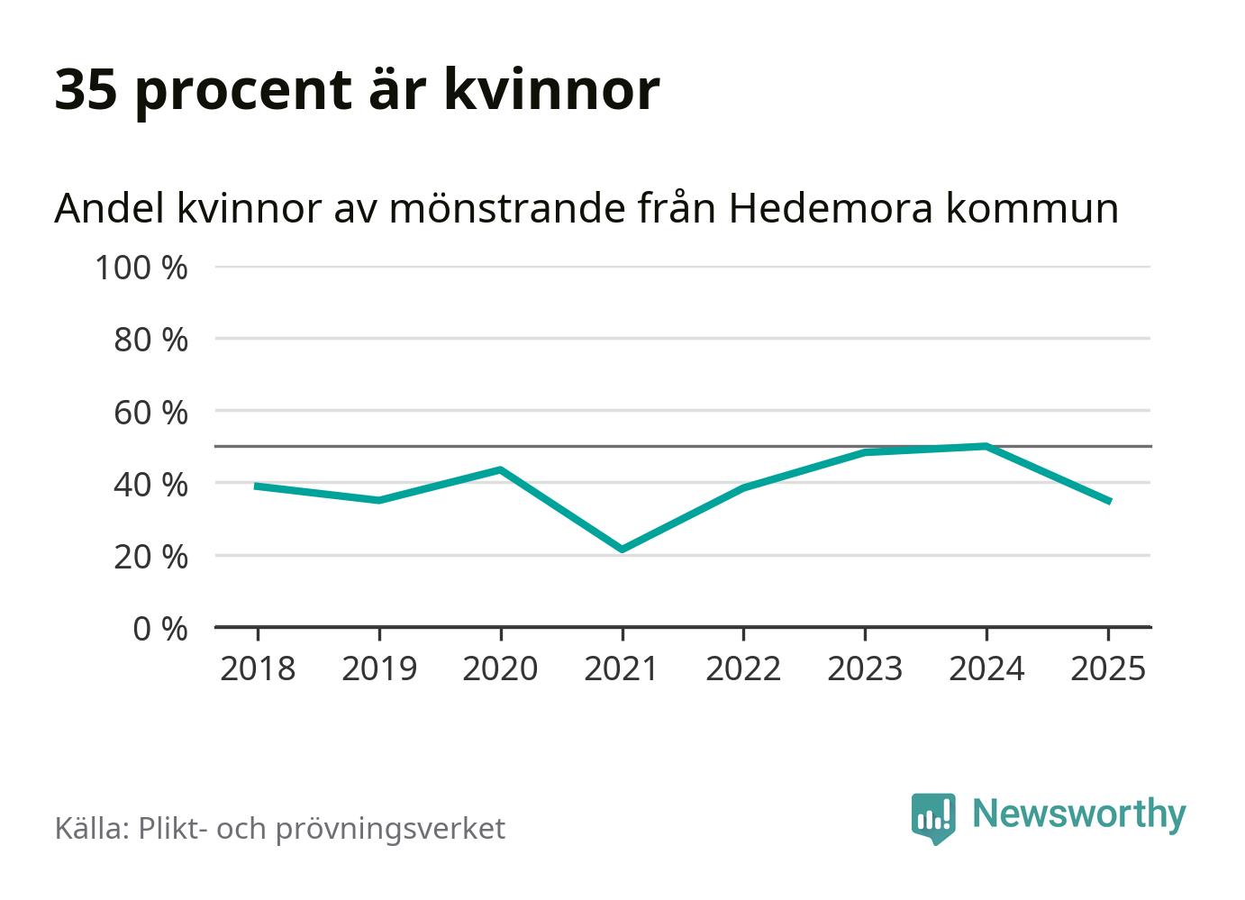 14 av de som kallats till mönstring från Hedemora är kvinnor, vilket motsvarar 35 procent av de mönstrande. Som mest har 19 kvinnor kallats från kommunen (2024). I riket som helhet är 28 procent av de mönstrande tjejer.