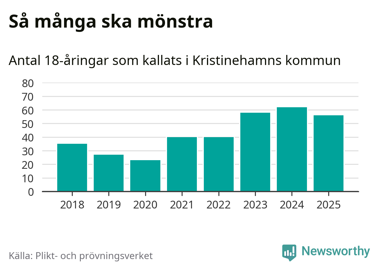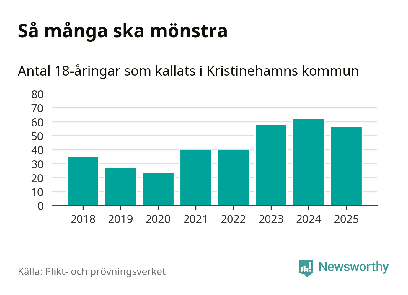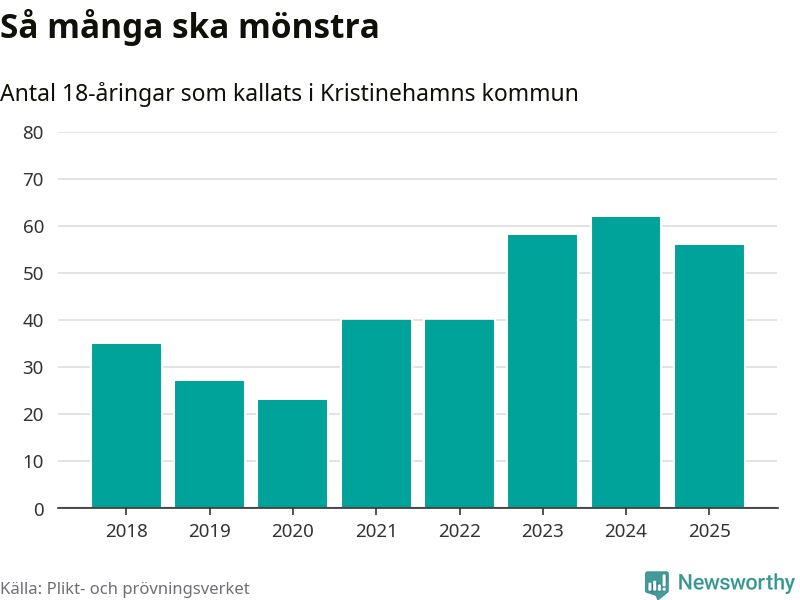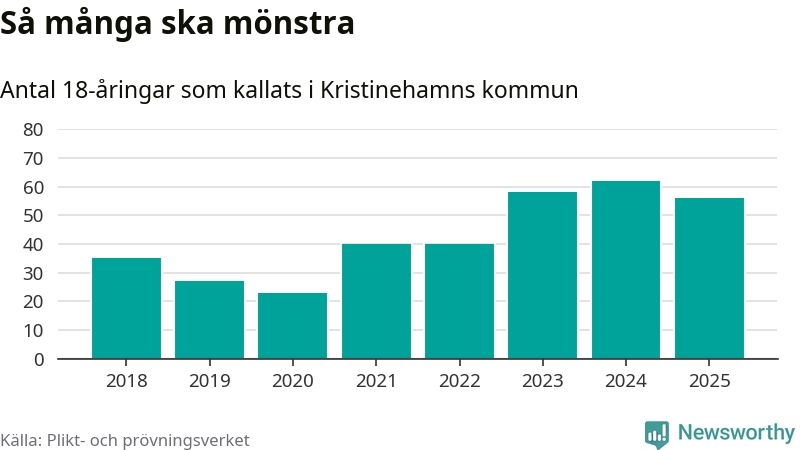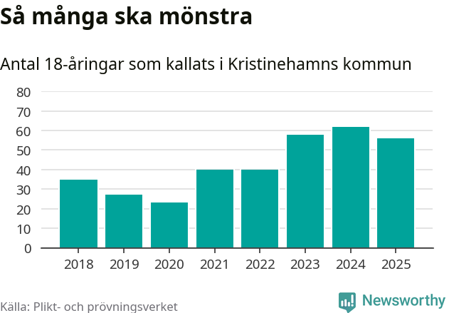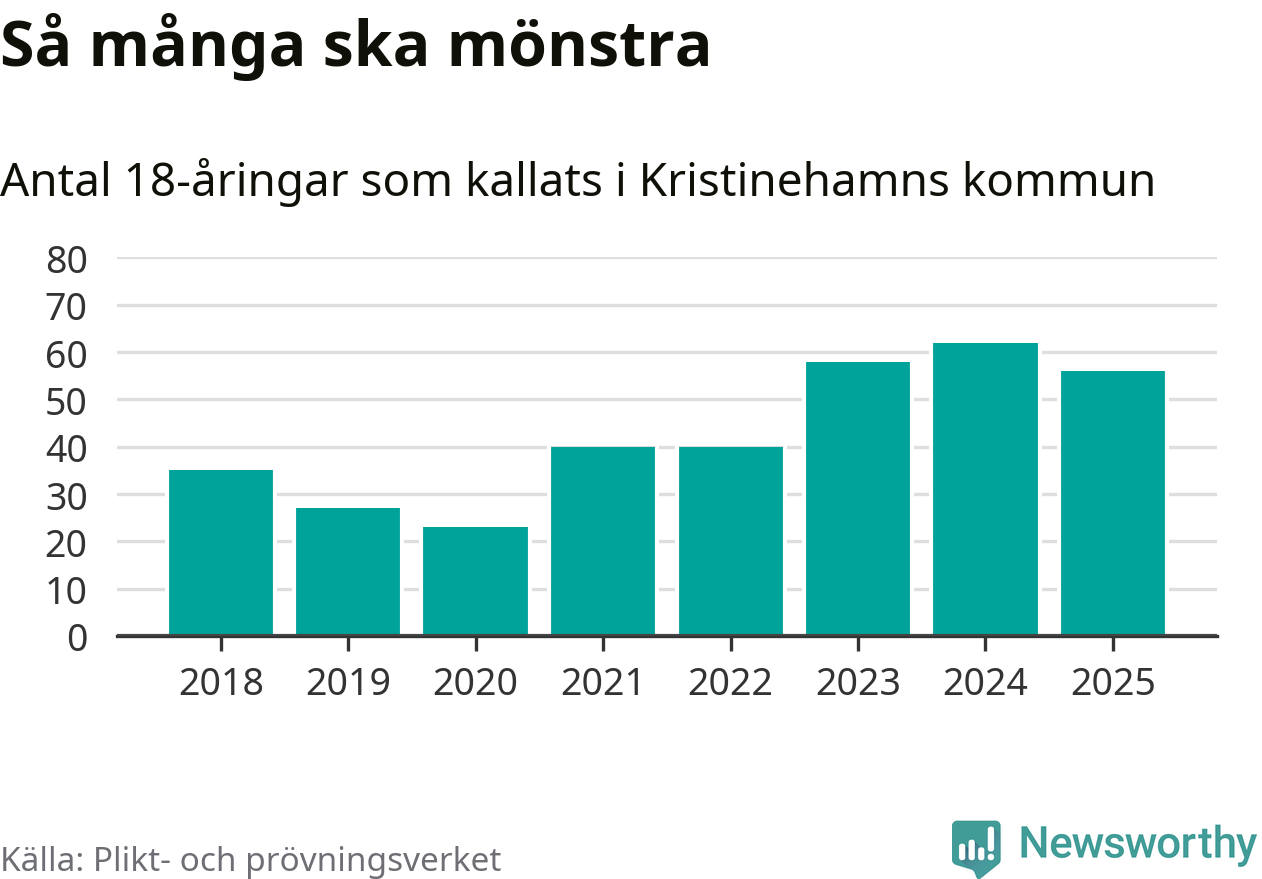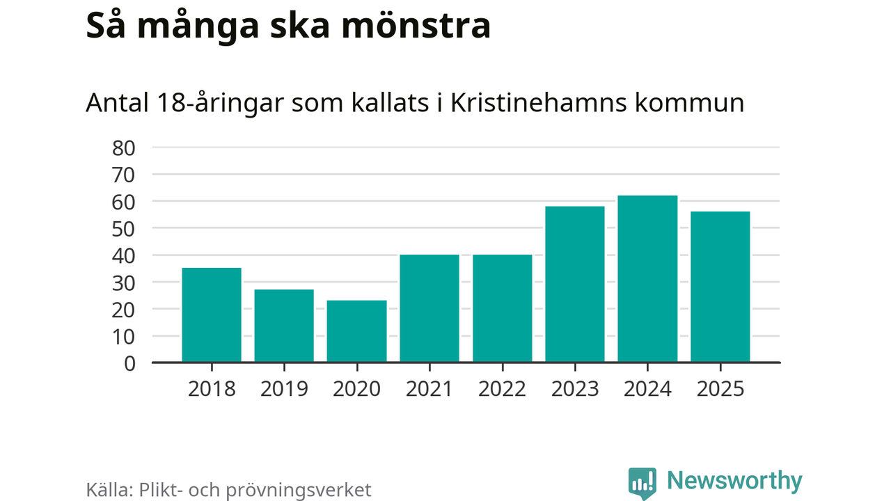 Nu kallas omkring 28 200 svenskar födda 2007 till mönstring. Och 56 av dem kommer från Kristinehamn, enligt ny statistik från Plikt- och prövningsverket. Det innebär att var femte invånare i åldersgruppen i kommunen kallas till mönstring. Det är ungefär lika stor andel som i Värmland totalt. I riket som helhet kallas nästan var fjärde person i årskullen.