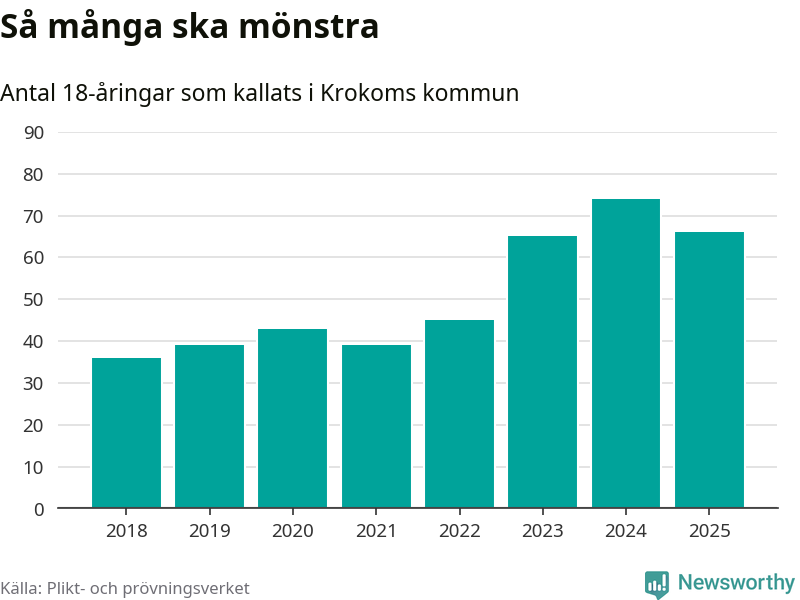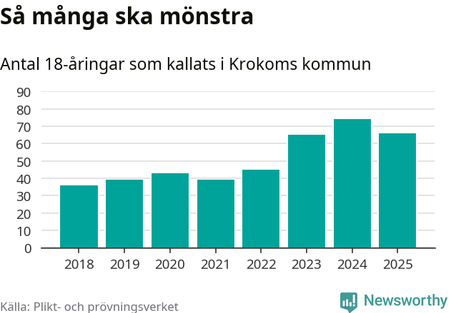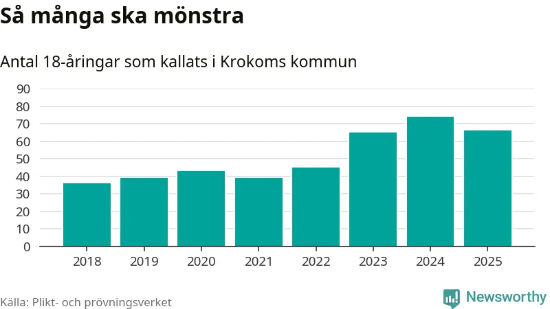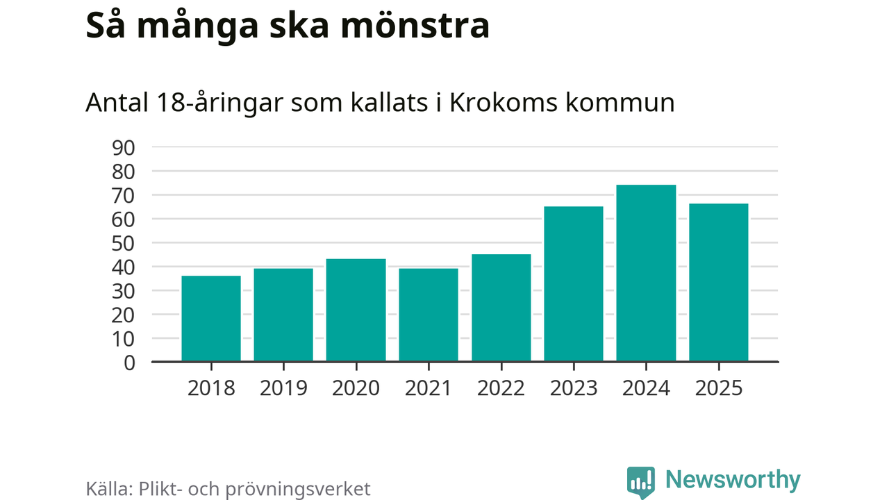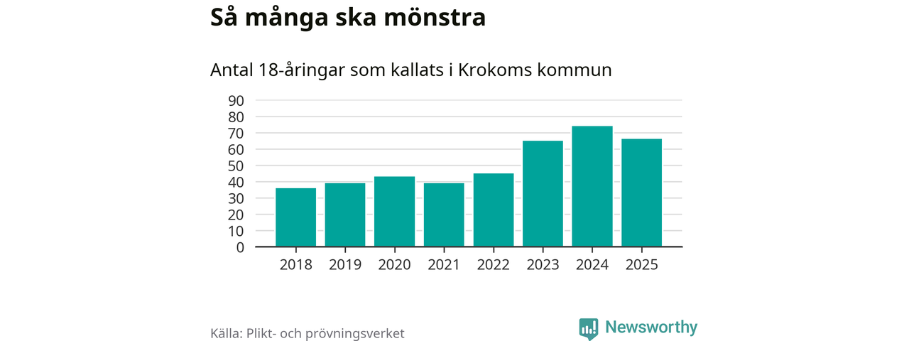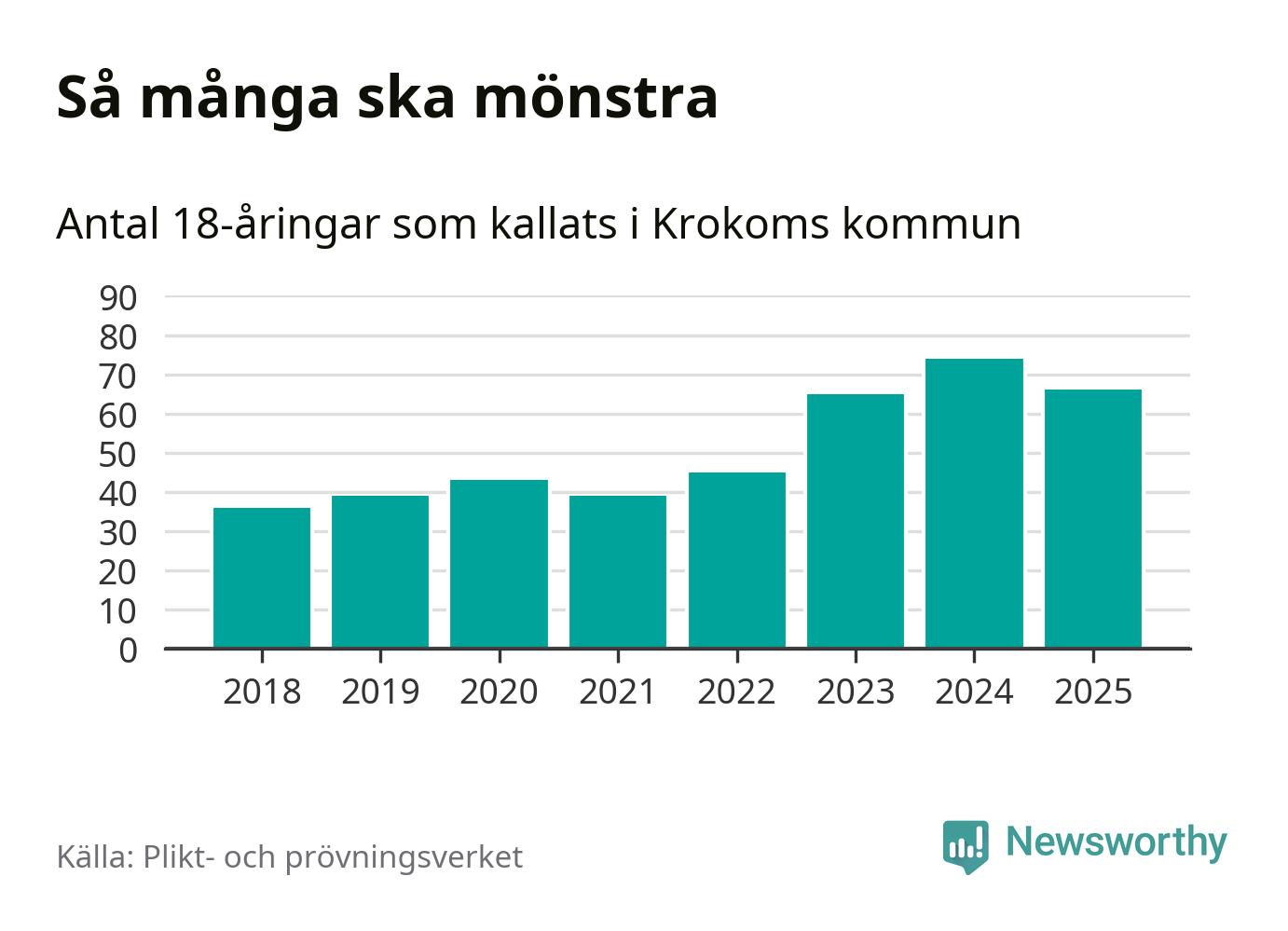 Nu kallas omkring 28 200 svenskar födda 2007 till mönstring. Och 66 av dem kommer från Krokom, enligt ny statistik från Plikt- och prövningsverket. Det innebär att nästan var tredje invånare i åldersgruppen i kommunen kallas till mönstring. Det är ungefär lika stor andel som i Jämtland totalt. I riket som helhet kallas nästan var fjärde person i årskullen.