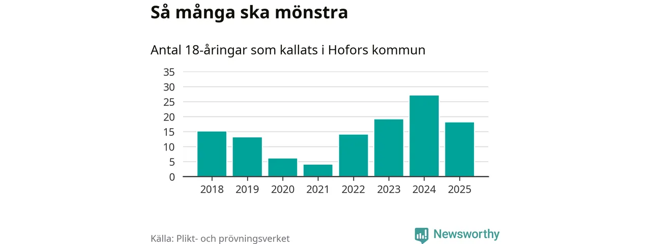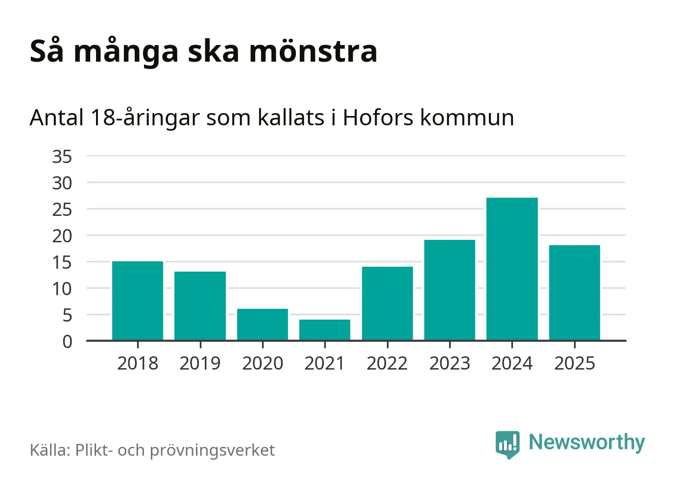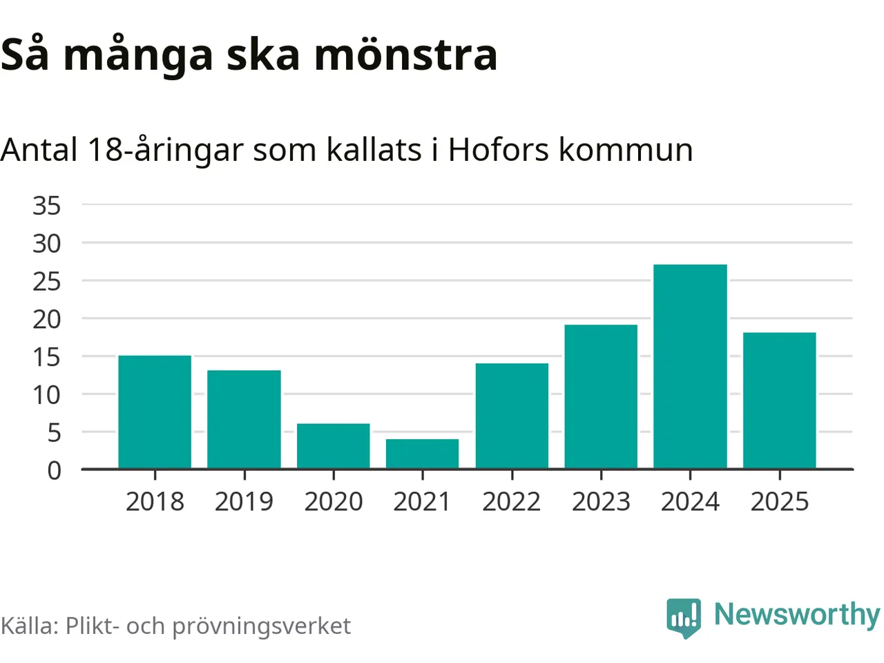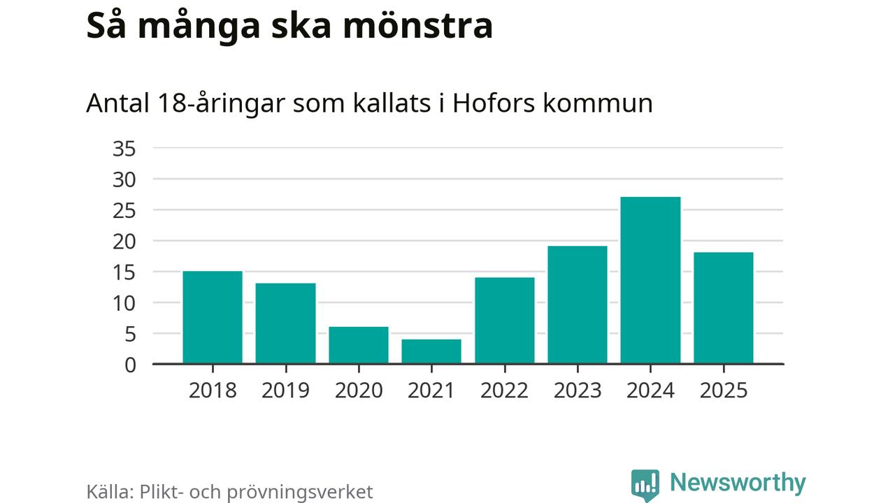 Nu kallas omkring 28 200 svenskar födda 2007 till mönstring. Och 18 av dem kommer från Hofors, enligt ny statistik från Plikt- och prövningsverket. Det innebär att var femte invånare i åldersgruppen i kommunen kallas till mönstring. Det är en lägre andel än i Gävleborg totalt. I riket som helhet kallas nästan var fjärde person i årskullen.