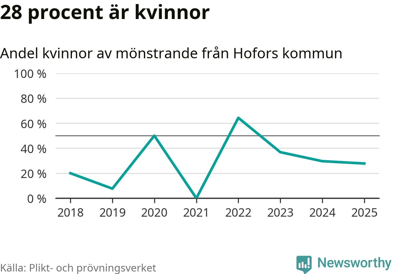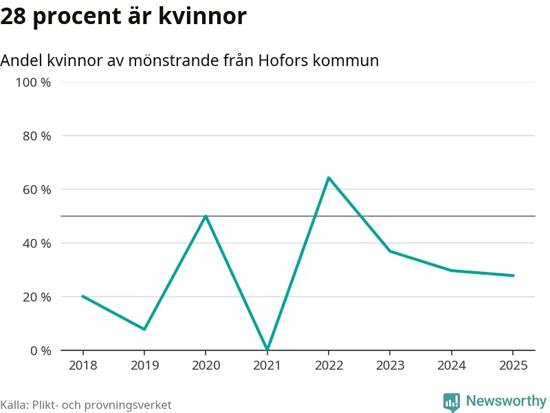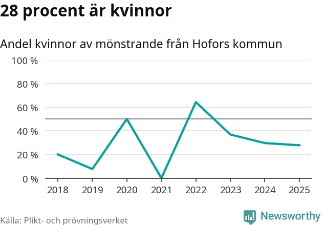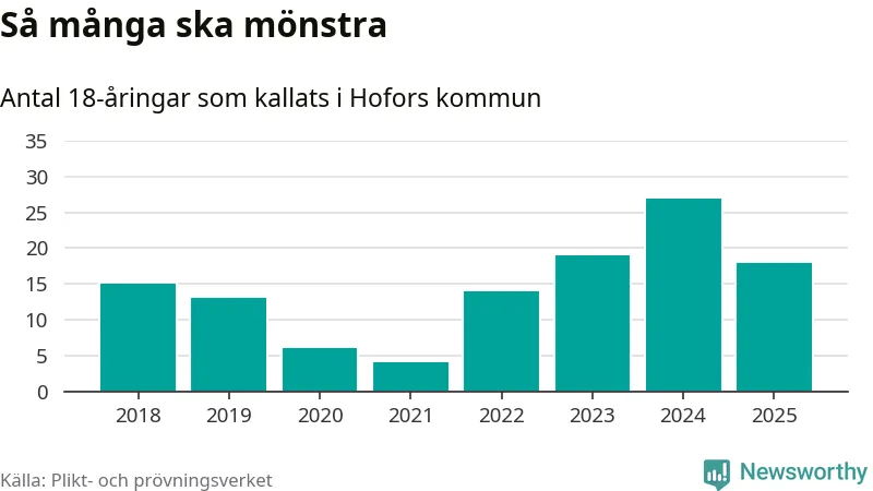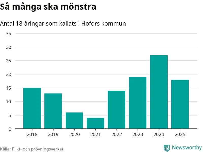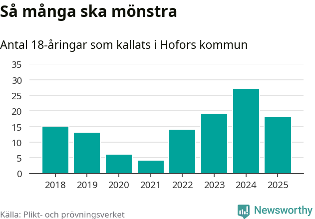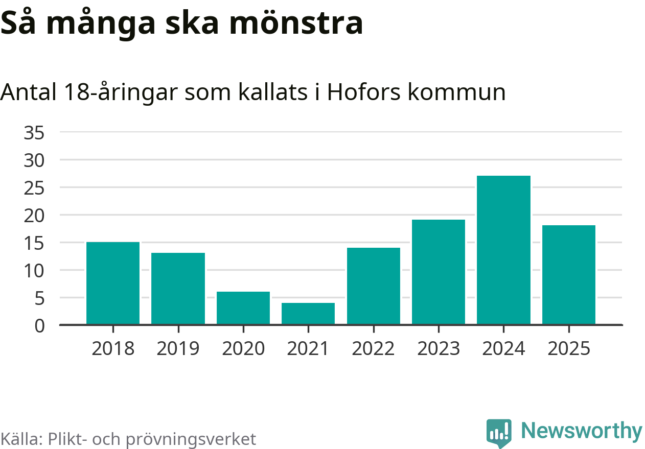 Nu kallas omkring 28 200 svenskar födda 2007 till mönstring. Och 18 av dem kommer från Hofors, enligt ny statistik från Plikt- och prövningsverket. Det innebär att var femte invånare i åldersgruppen i kommunen kallas till mönstring. Det är en lägre andel än i Gävleborg totalt. I riket som helhet kallas nästan var fjärde person i årskullen.