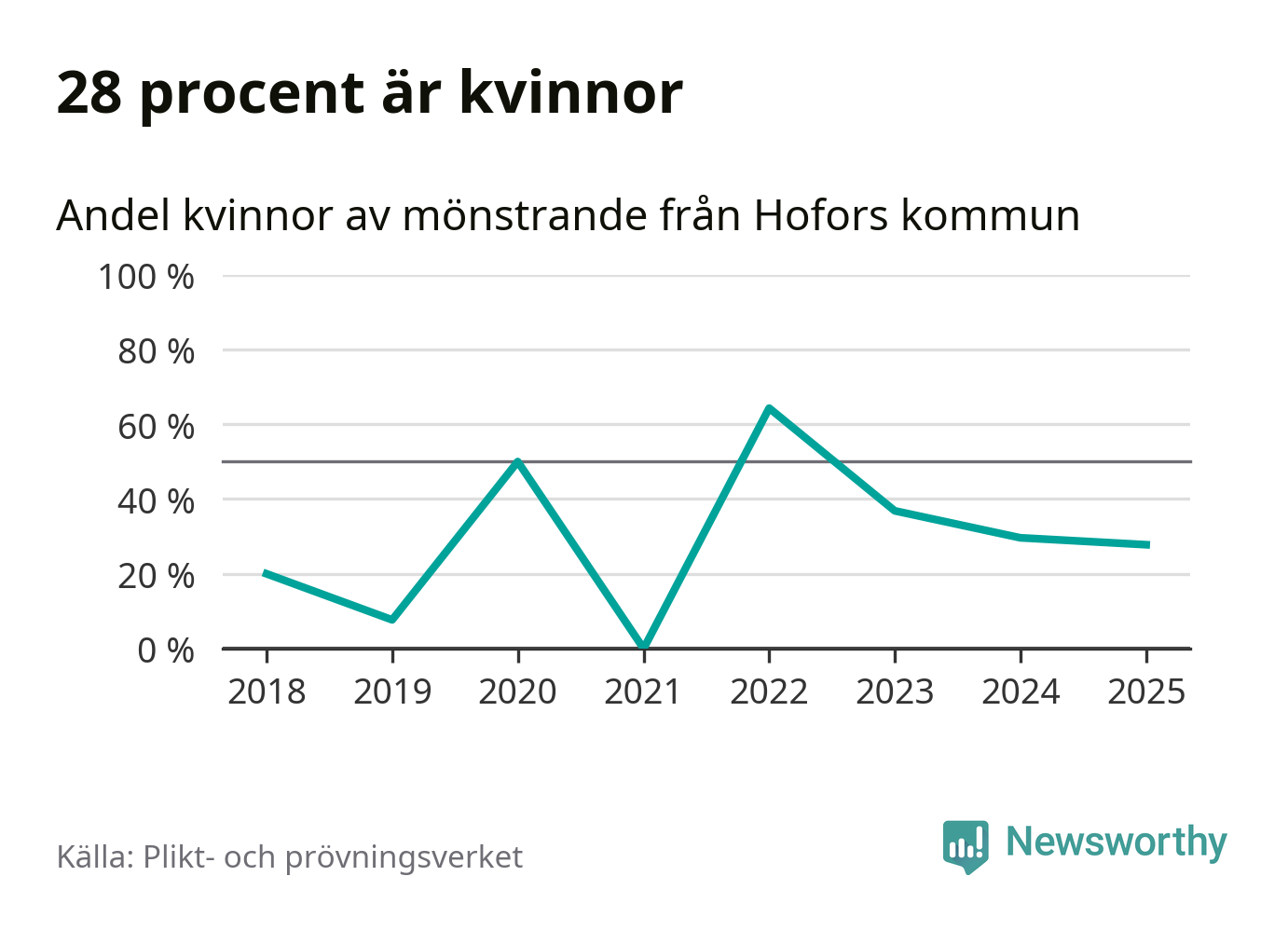 Fem av de som kallats till mönstring från Hofors är kvinnor, vilket motsvarar 28 procent av de mönstrande. Som mest har nio kvinnor kallats från kommunen (2022). I riket som helhet är 28 procent av de mönstrande tjejer.