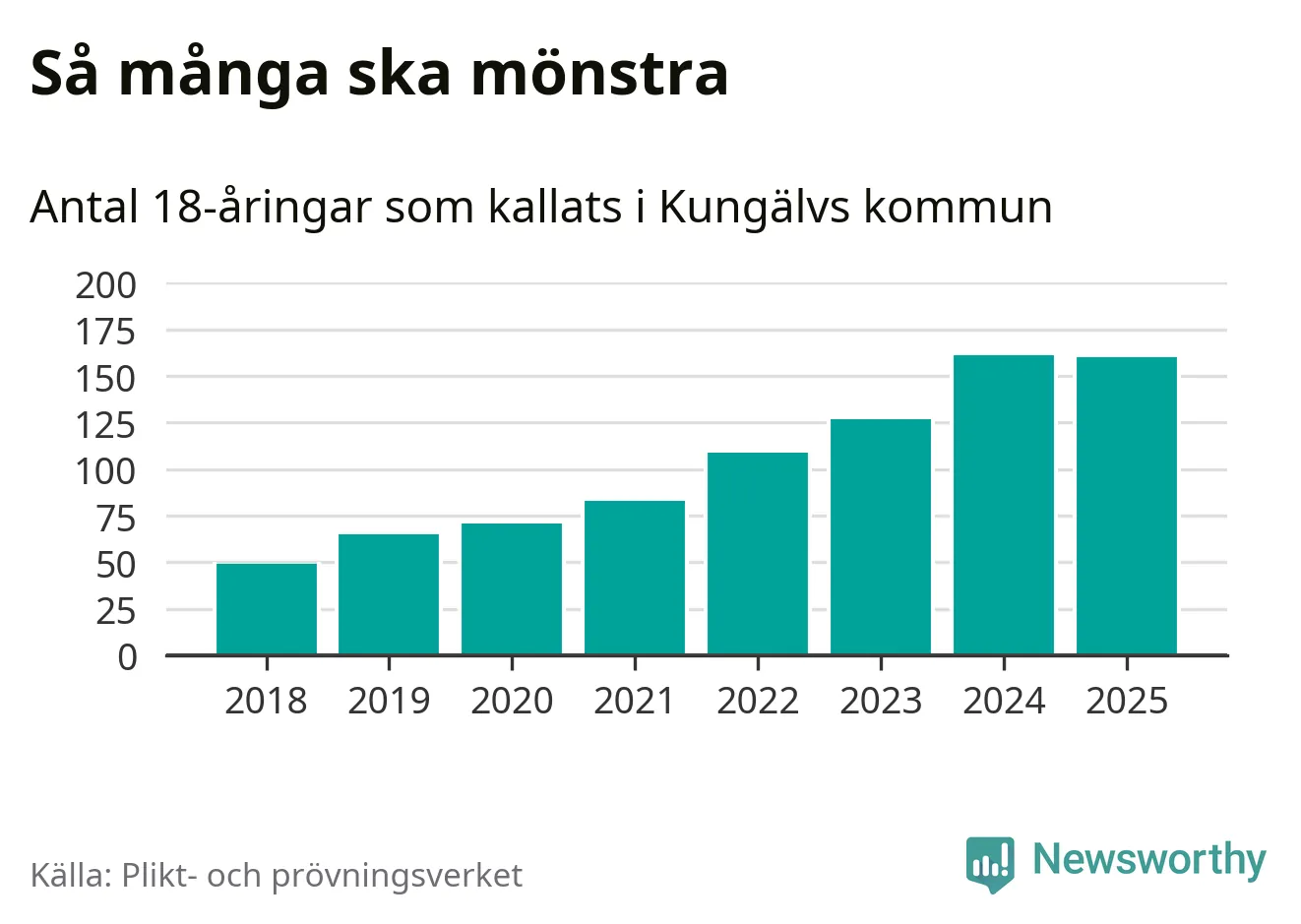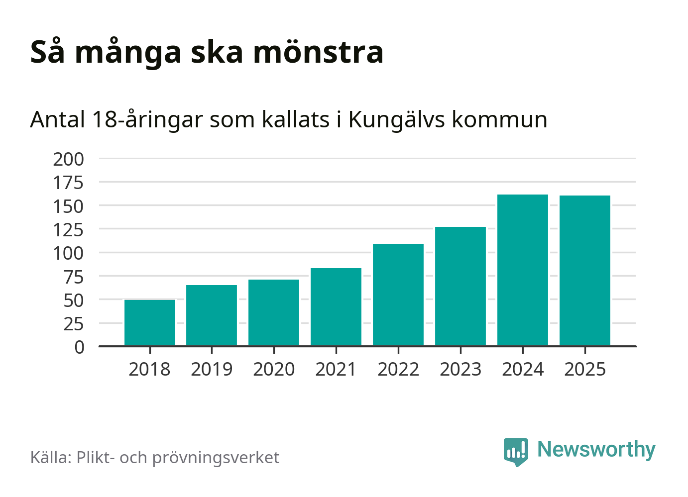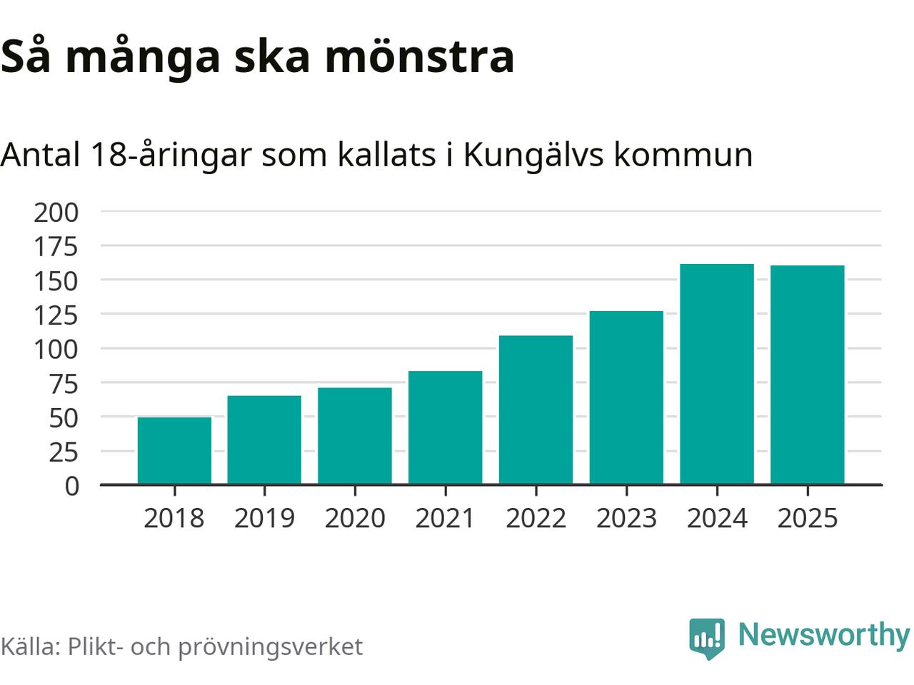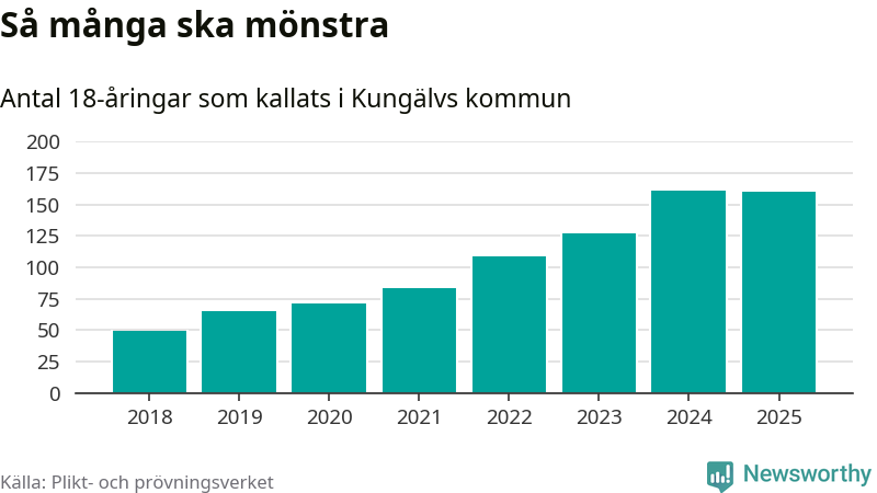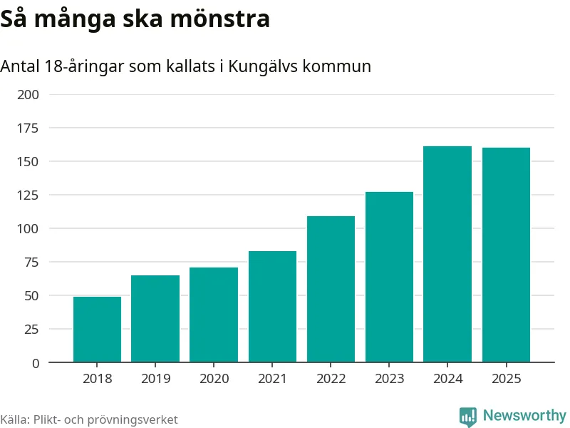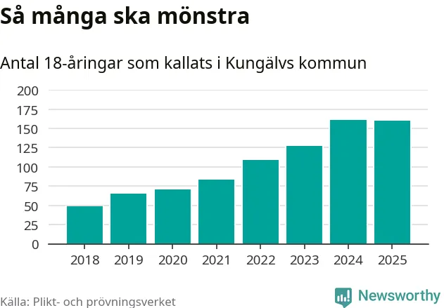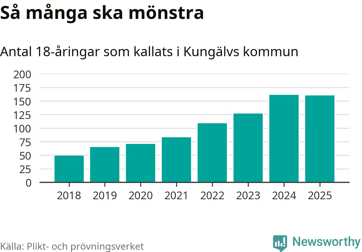 Nu kallas omkring 28 200 svenskar födda 2007 till mönstring. Och 160 av dem kommer från Kungälv, enligt ny statistik från Plikt- och prövningsverket. Det innebär att var fjärde invånare i åldersgruppen i kommunen kallas till mönstring. Det är en högre andel än i Västra Götaland totalt. I riket som helhet kallas nästan var fjärde person i årskullen.