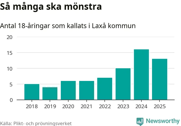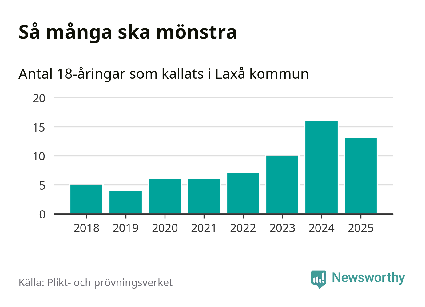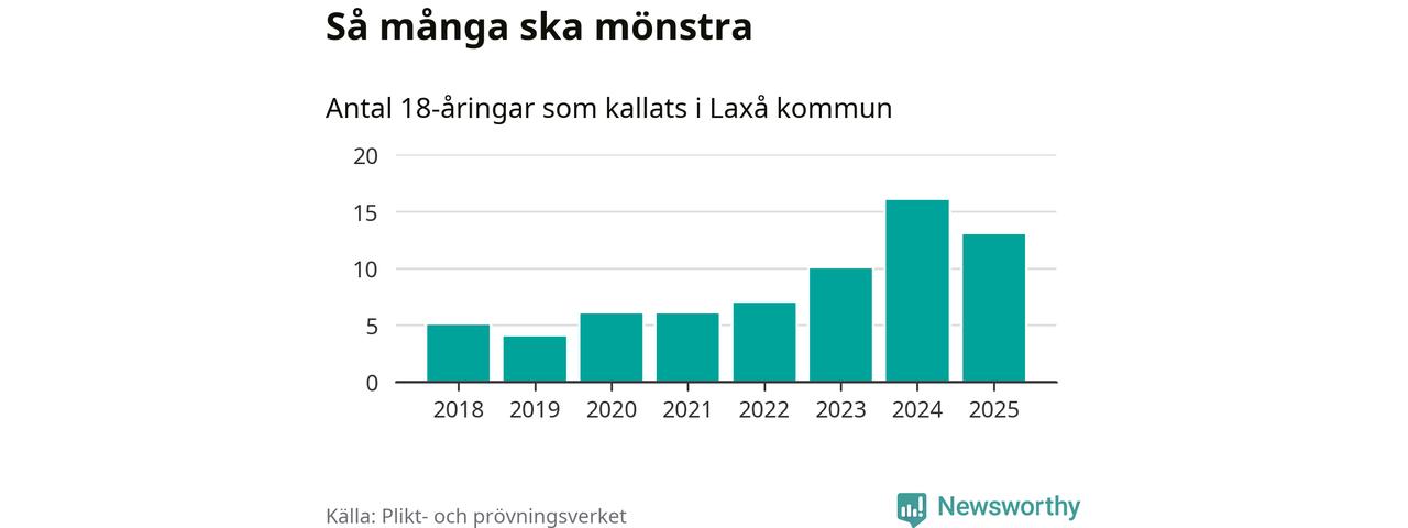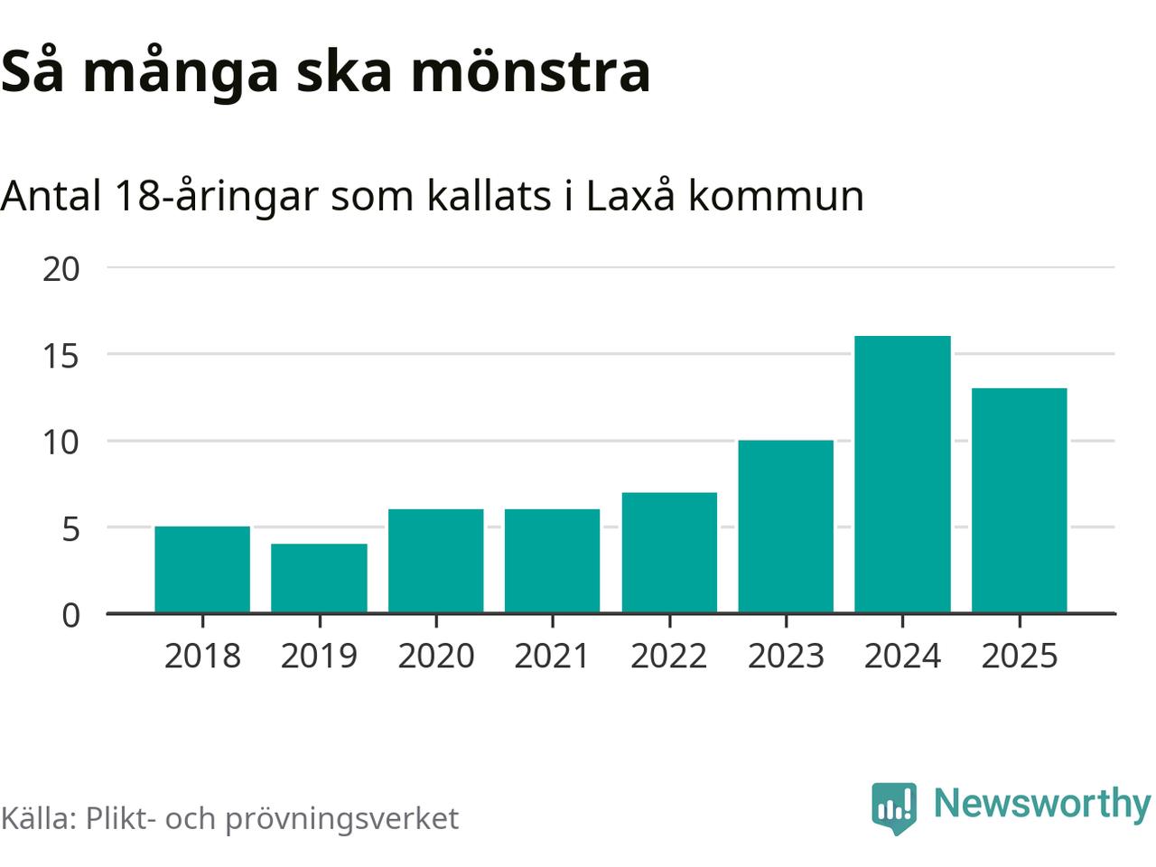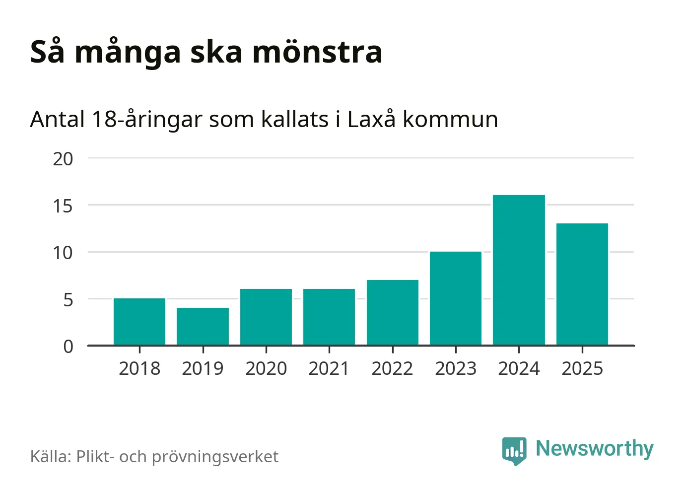 Nu kallas omkring 28 200 svenskar födda 2007 till mönstring. Och 13 av dem kommer från Laxå, enligt ny statistik från Plikt- och prövningsverket. Det innebär att nästan var fjärde invånare i åldersgruppen i kommunen kallas till mönstring. Det är ungefär lika stor andel som i Örebro län totalt. Även i riket som helhet kallas nästan var fjärde person i årskullen.