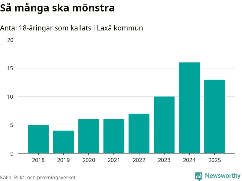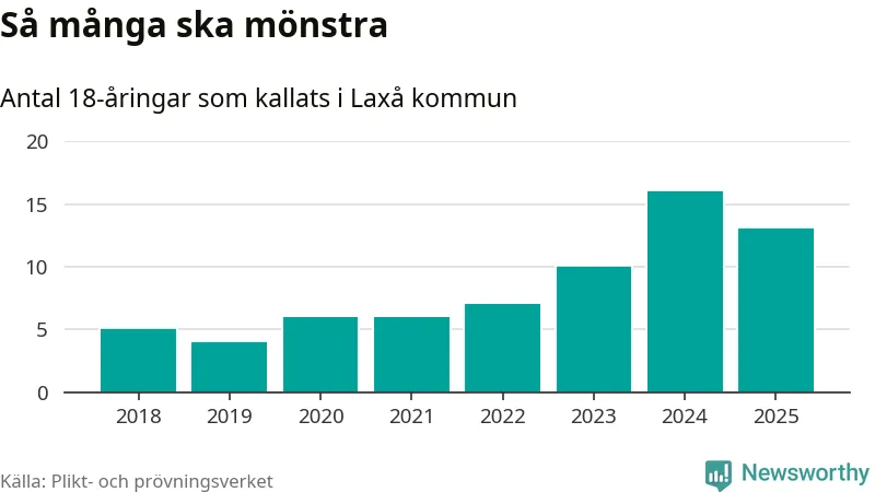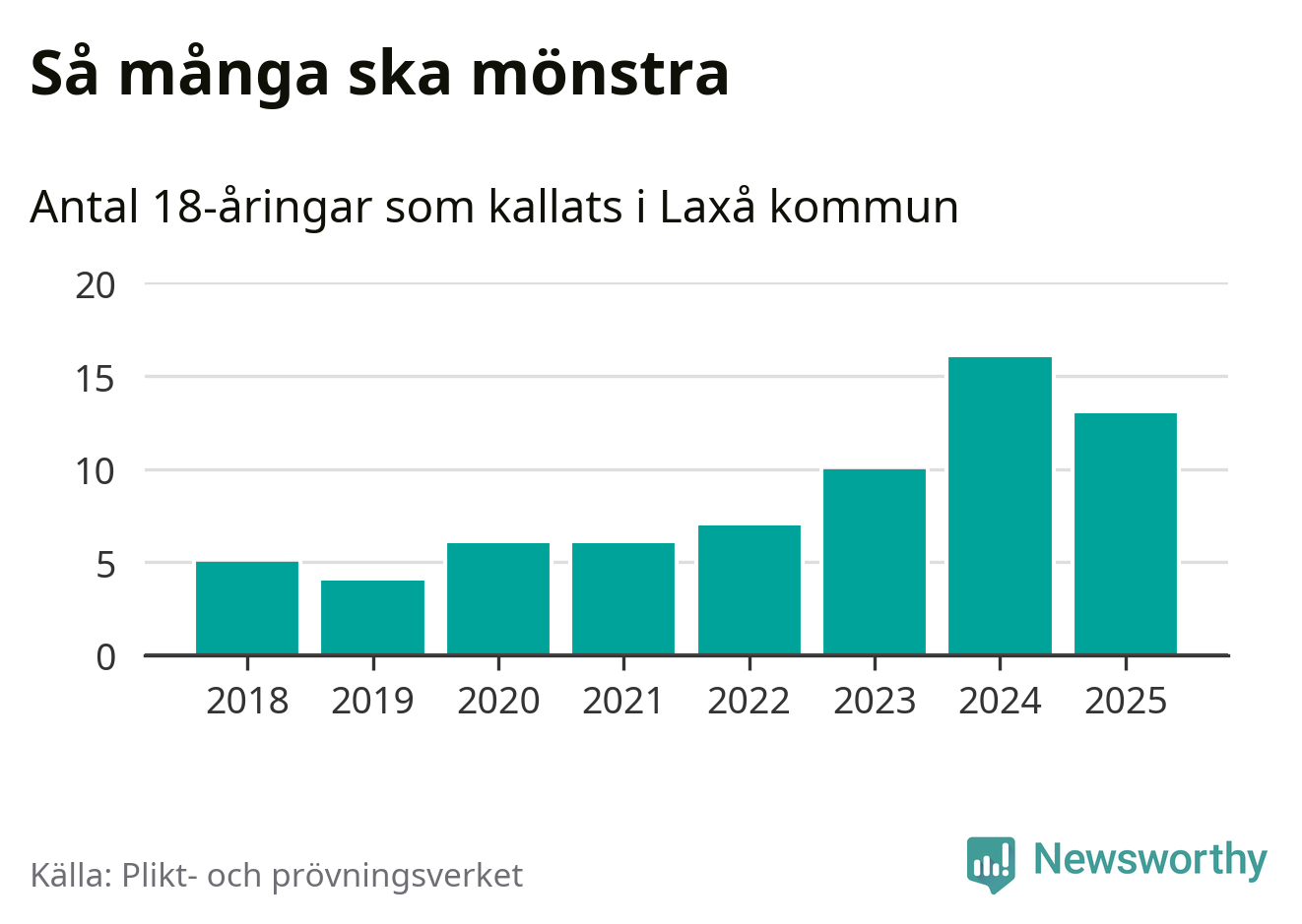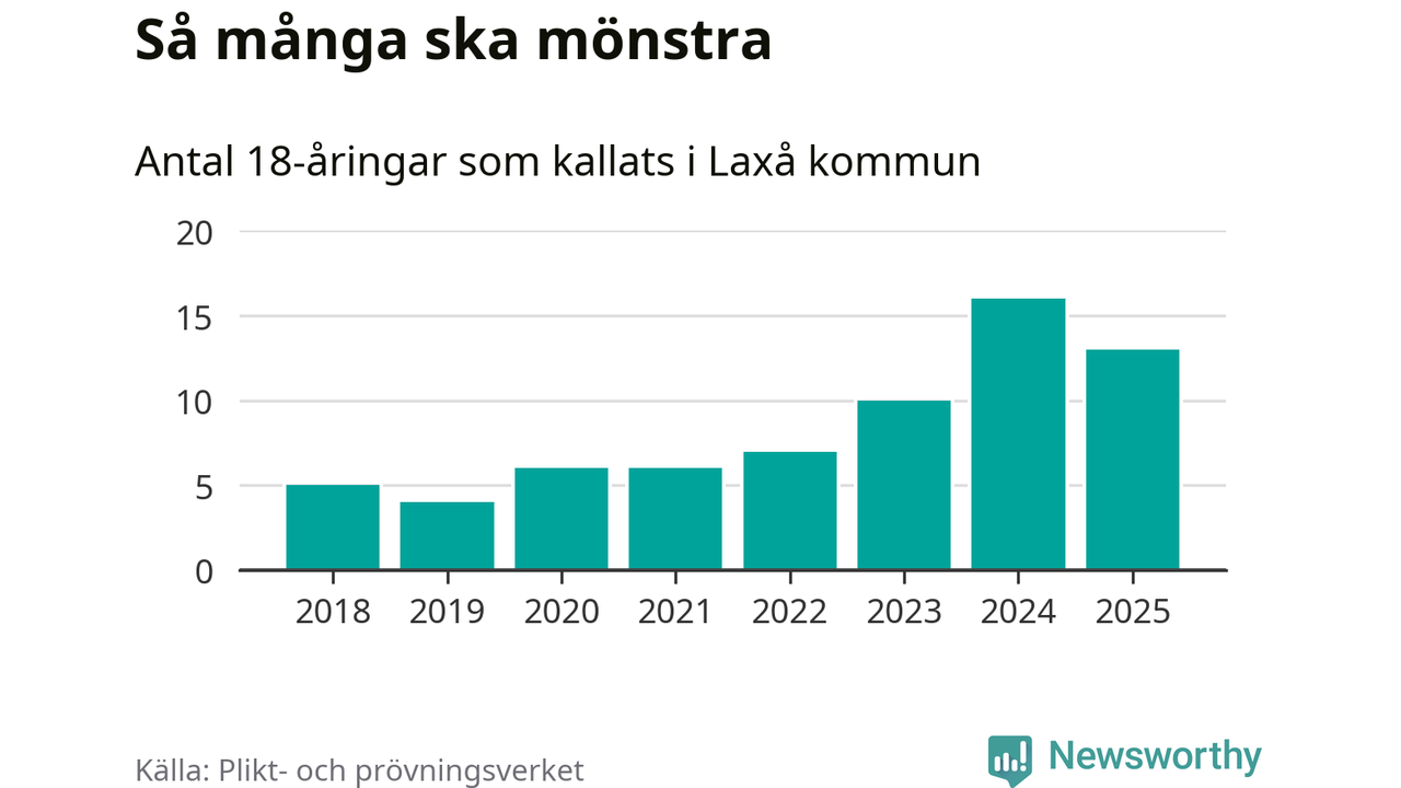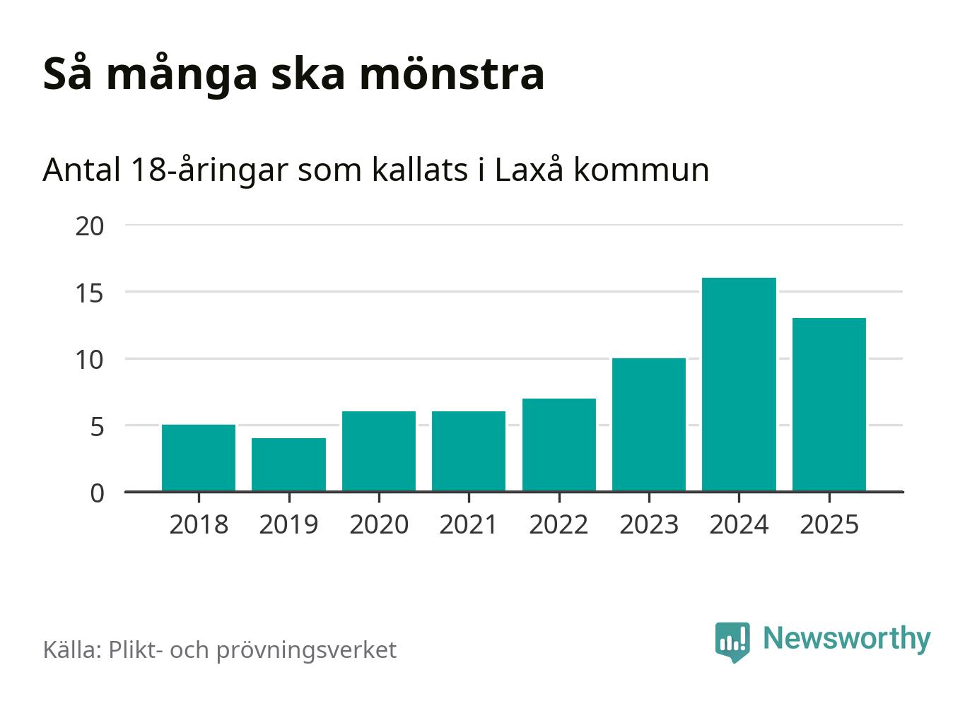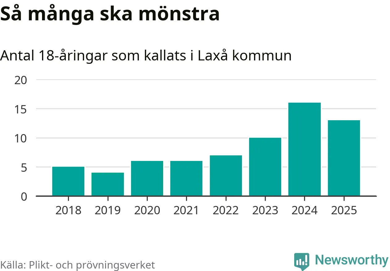 Nu kallas omkring 28 200 svenskar födda 2007 till mönstring. Och 13 av dem kommer från Laxå, enligt ny statistik från Plikt- och prövningsverket. Det innebär att nästan var fjärde invånare i åldersgruppen i kommunen kallas till mönstring. Det är ungefär lika stor andel som i Örebro län totalt. Även i riket som helhet kallas nästan var fjärde person i årskullen.