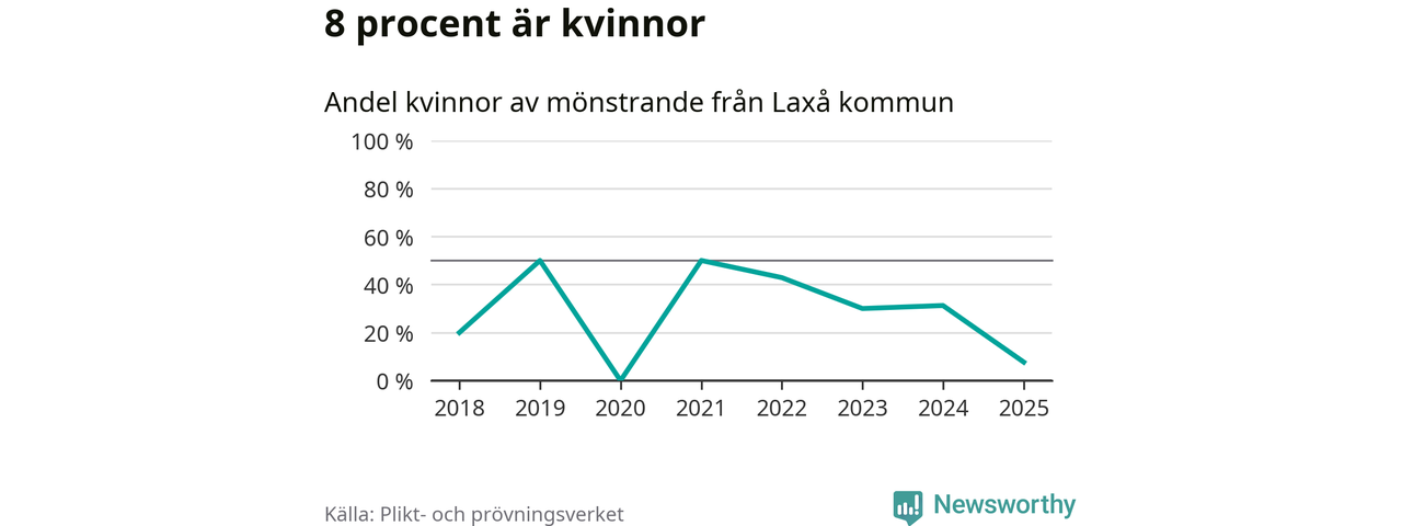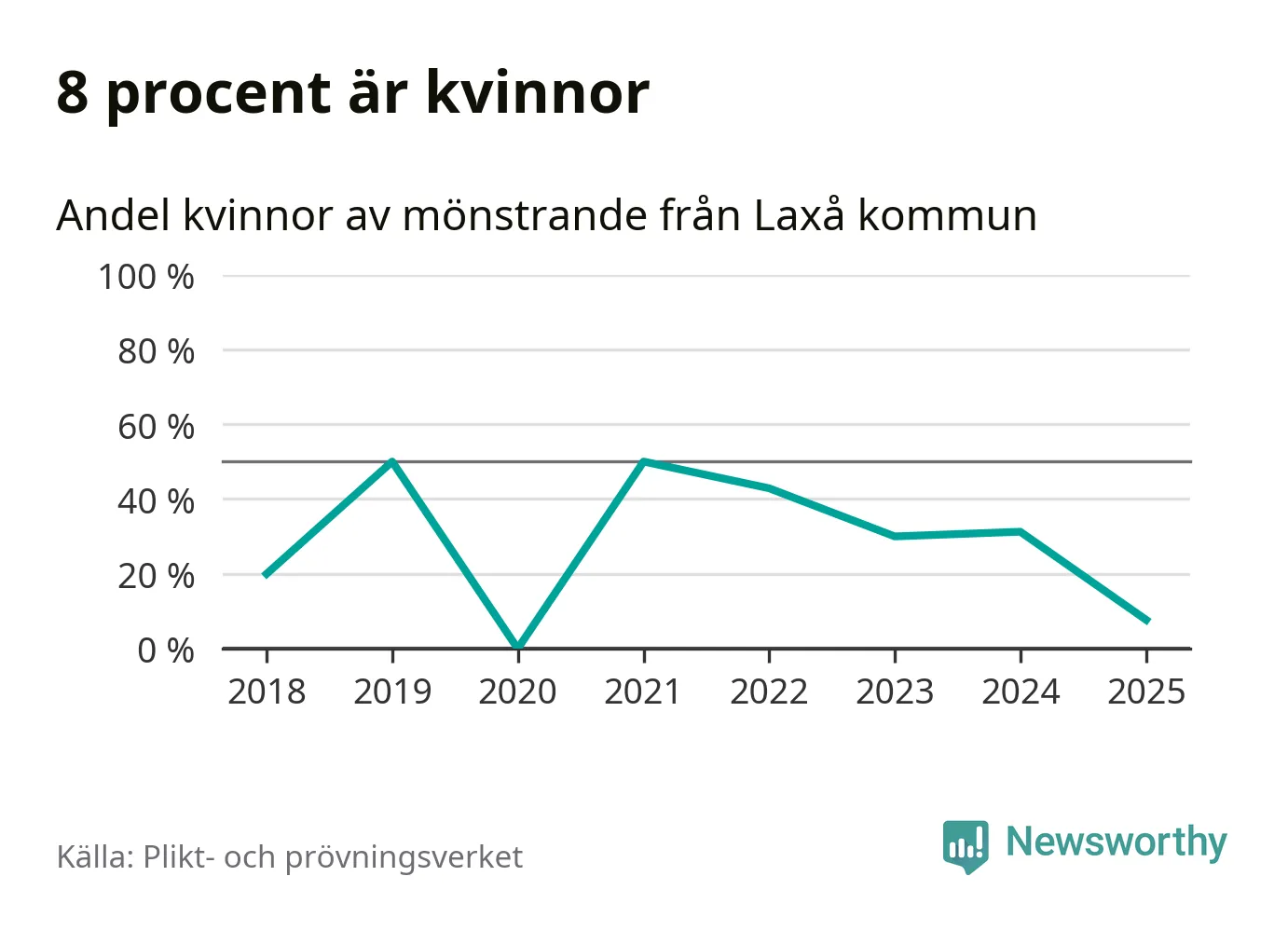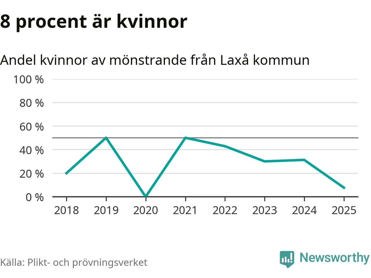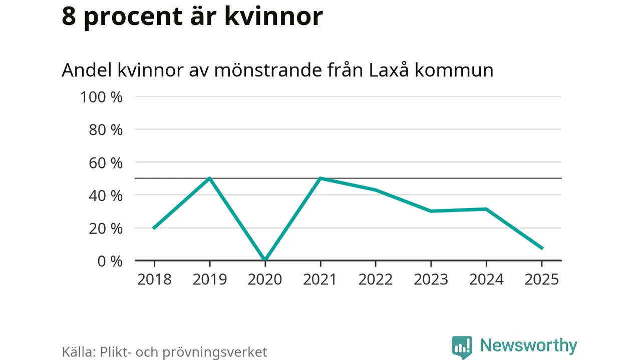 En av de som kallats till mönstring från Laxå är kvinna. Som mest har fem kvinnor kallats från kommunen (2024). I riket som helhet är 28 procent av de mönstrande tjejer.