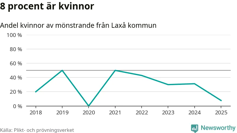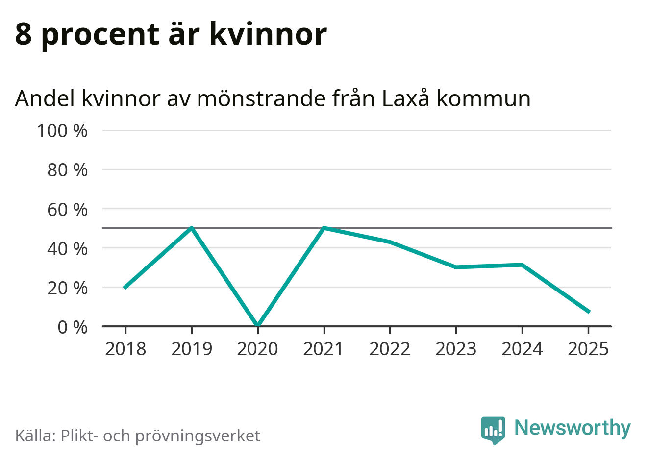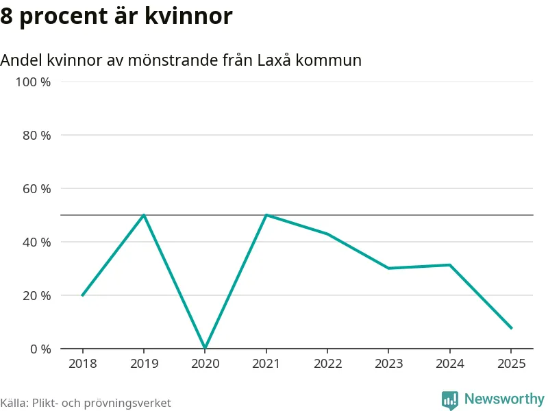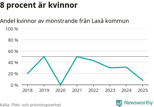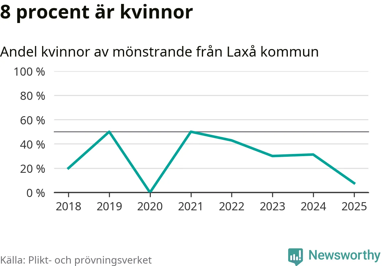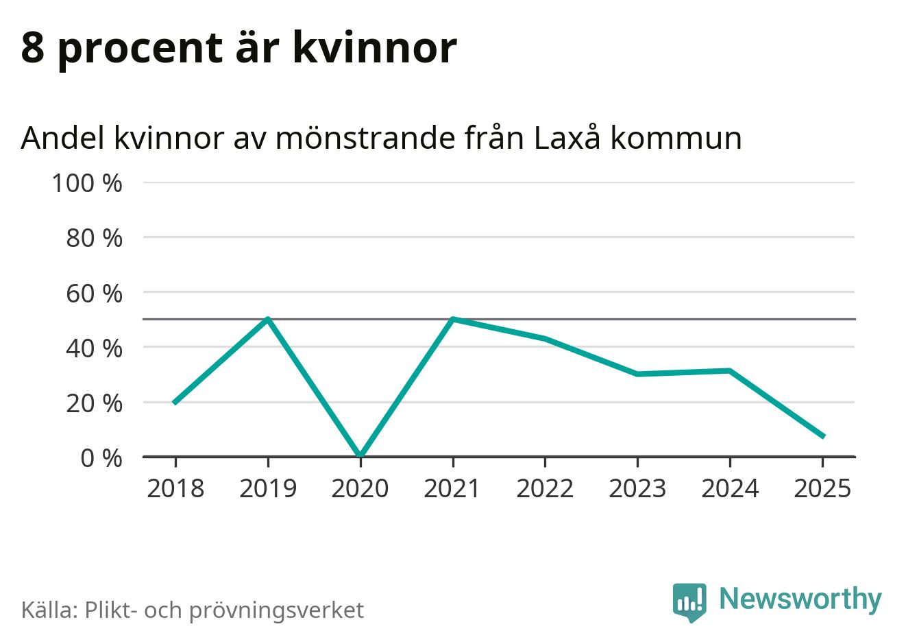 En av de som kallats till mönstring från Laxå är kvinna. Som mest har fem kvinnor kallats från kommunen (2024). I riket som helhet är 28 procent av de mönstrande tjejer.