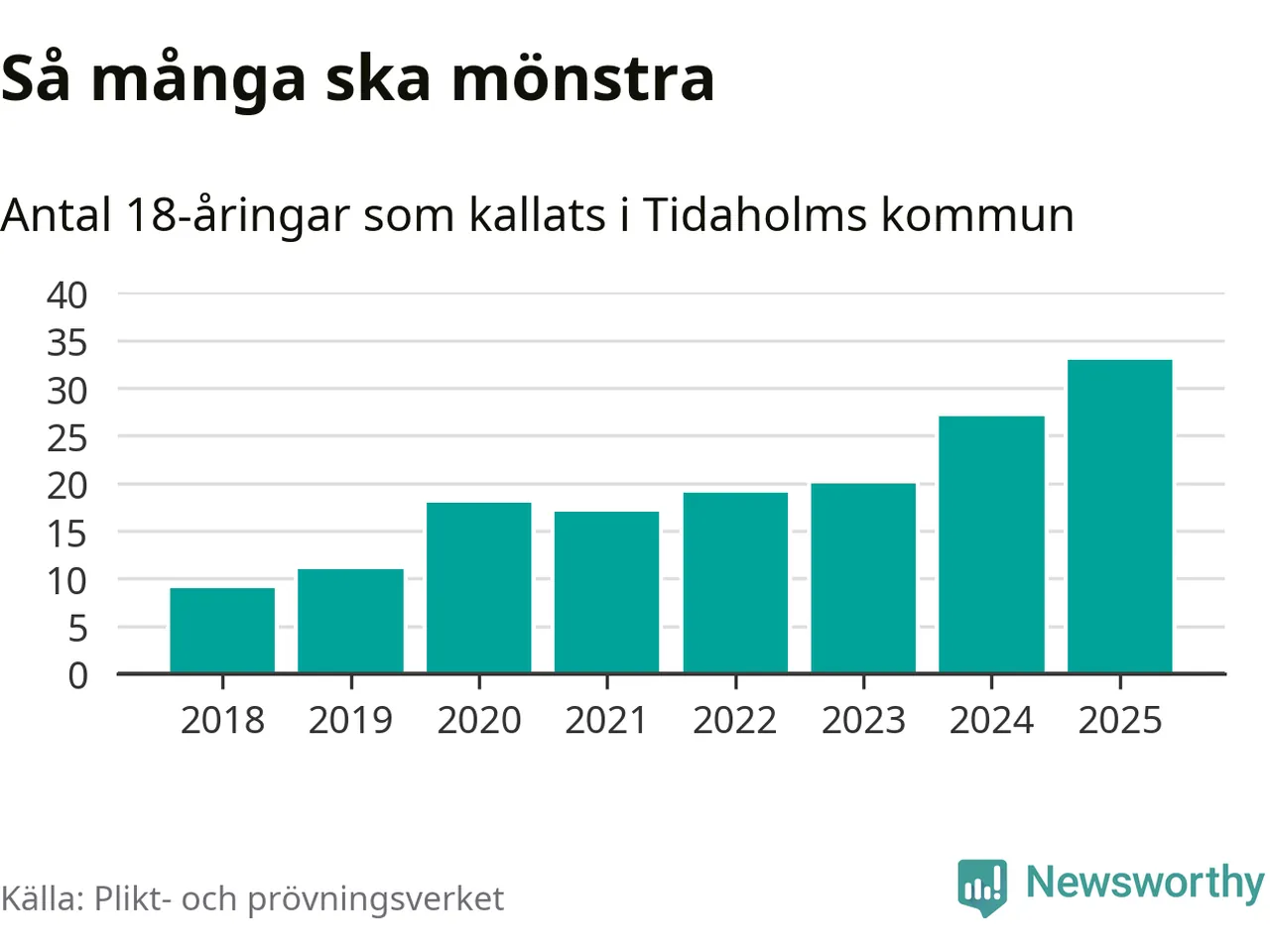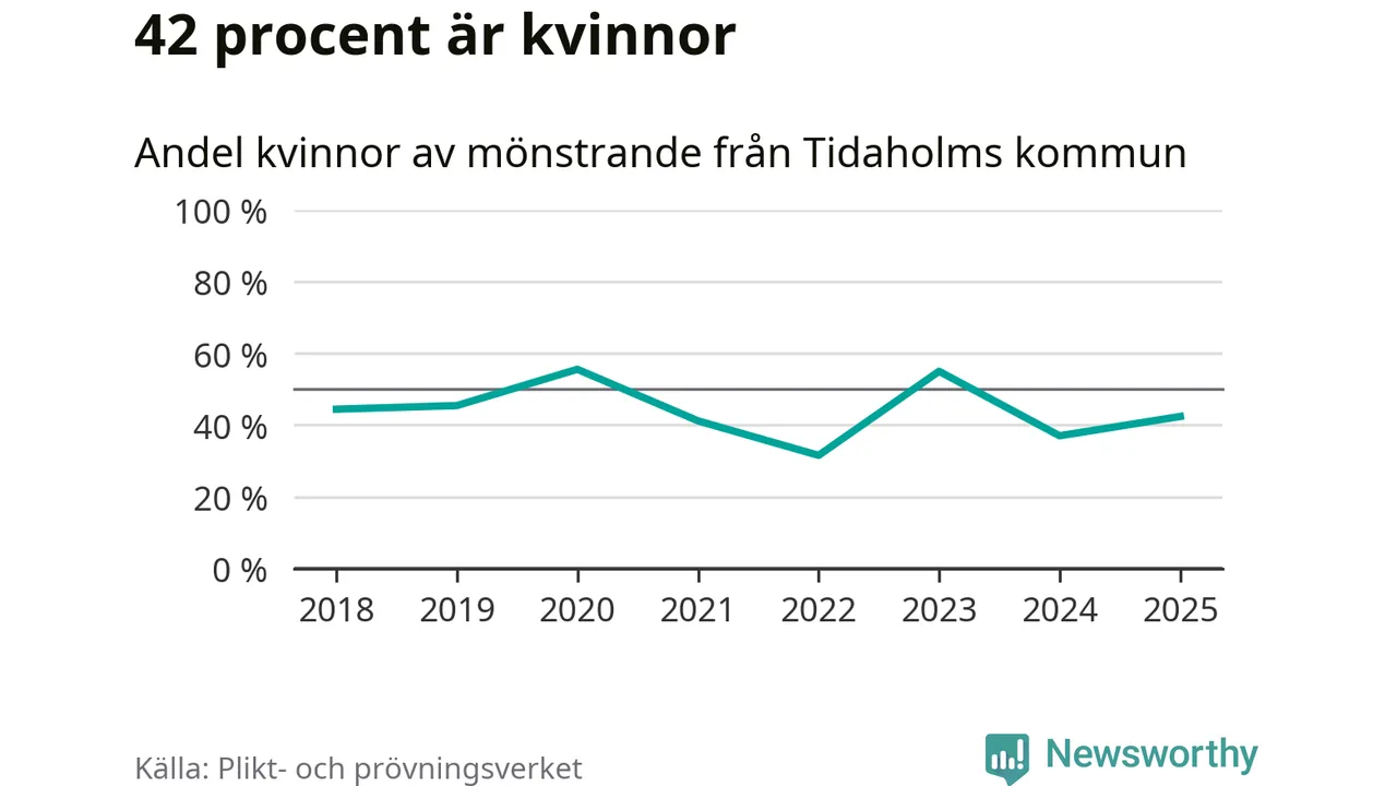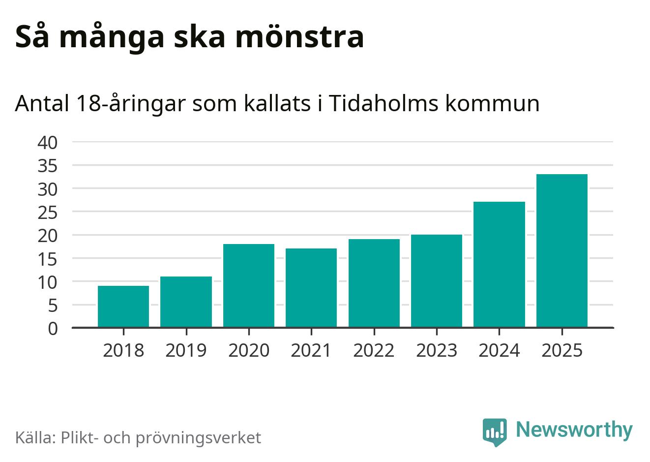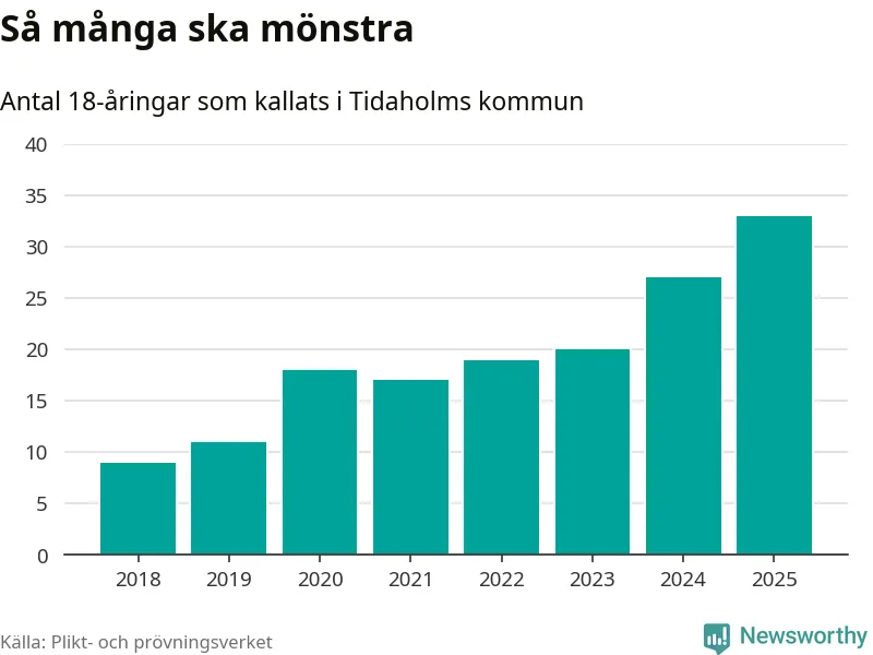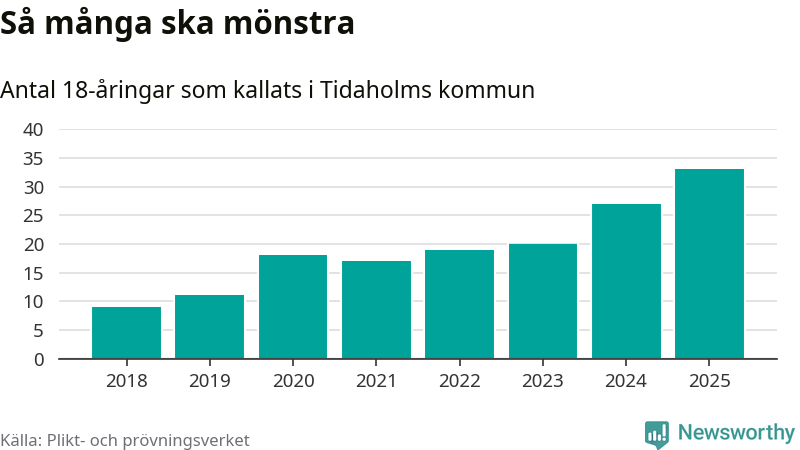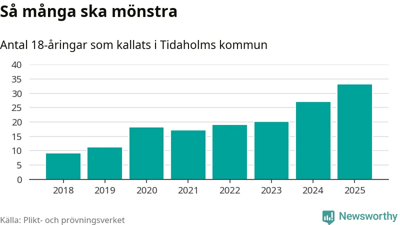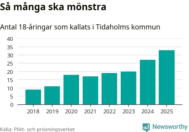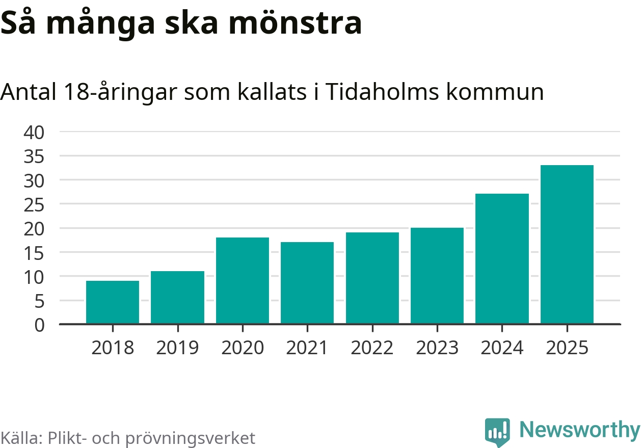 33 personer är det högsta antalet kallade i Tidaholm sedan 2018, som är första året med statistik på kommunnivå (värnplikten återinfördes 2017), och sex mönstrande fler än 2024. Totalt från Västra Götalands län kallas 4 523 personer i år.