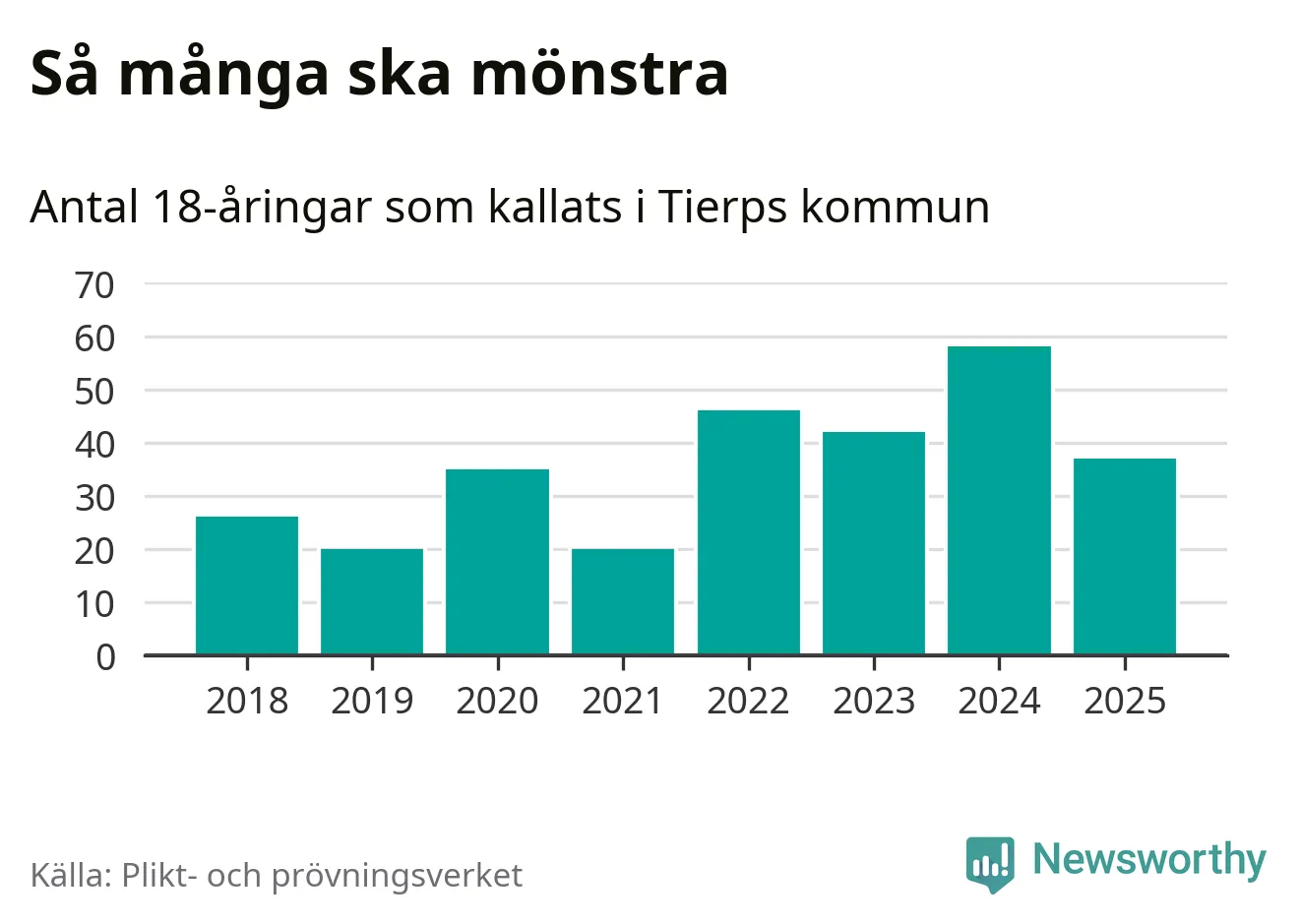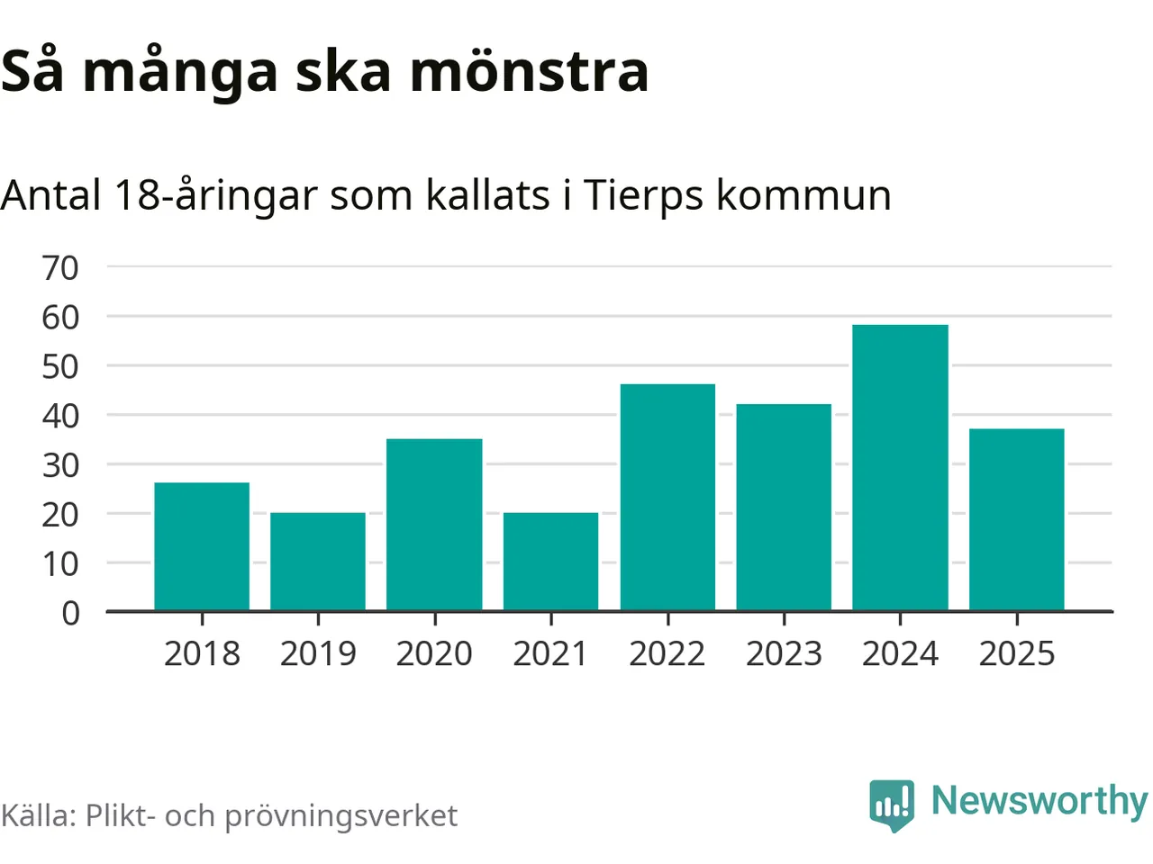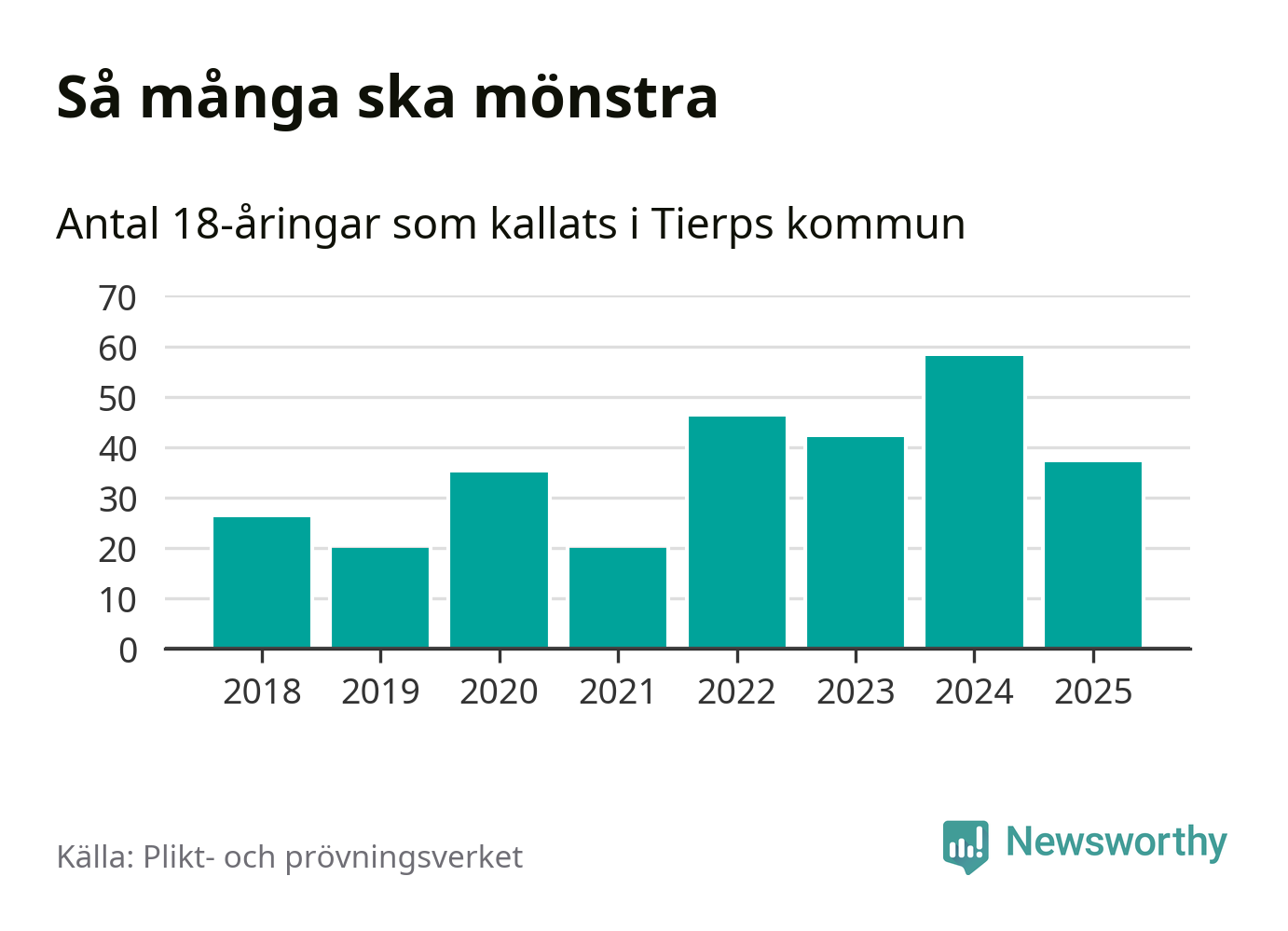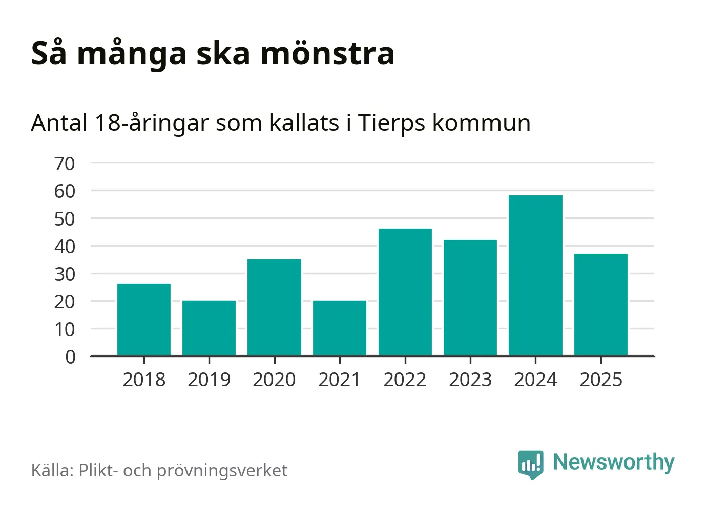 Nu kallas omkring 28 200 svenskar födda 2007 till mönstring. Och 37 av dem kommer från Tierp, enligt ny statistik från Plikt- och prövningsverket. Det innebär att var sjätte invånare i åldersgruppen i kommunen kallas till mönstring. Det är en lägre andel än i Uppsala län totalt. I riket som helhet kallas nästan var fjärde person i årskullen.