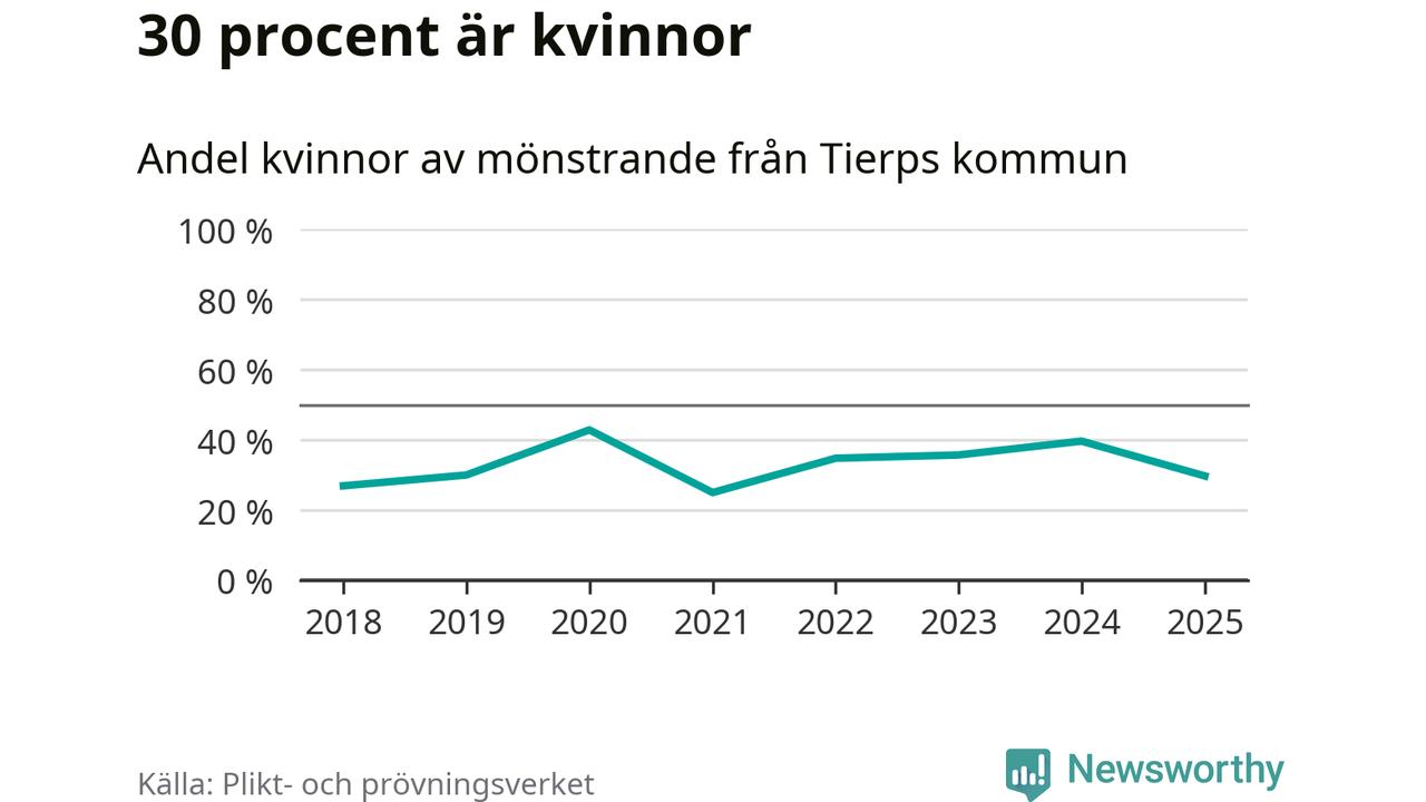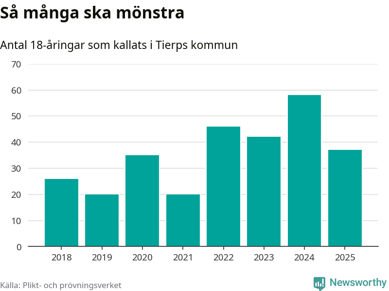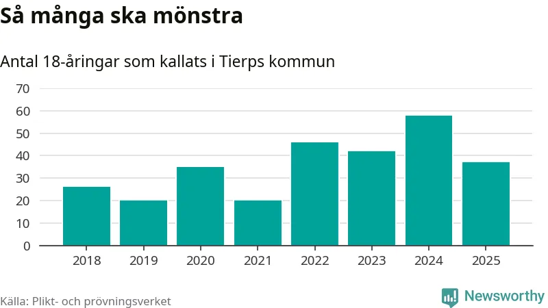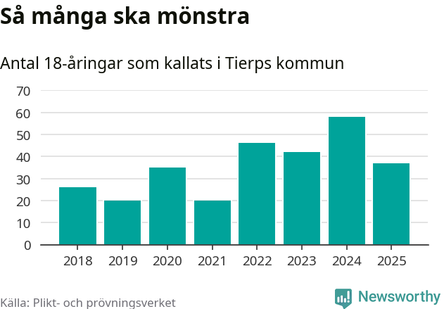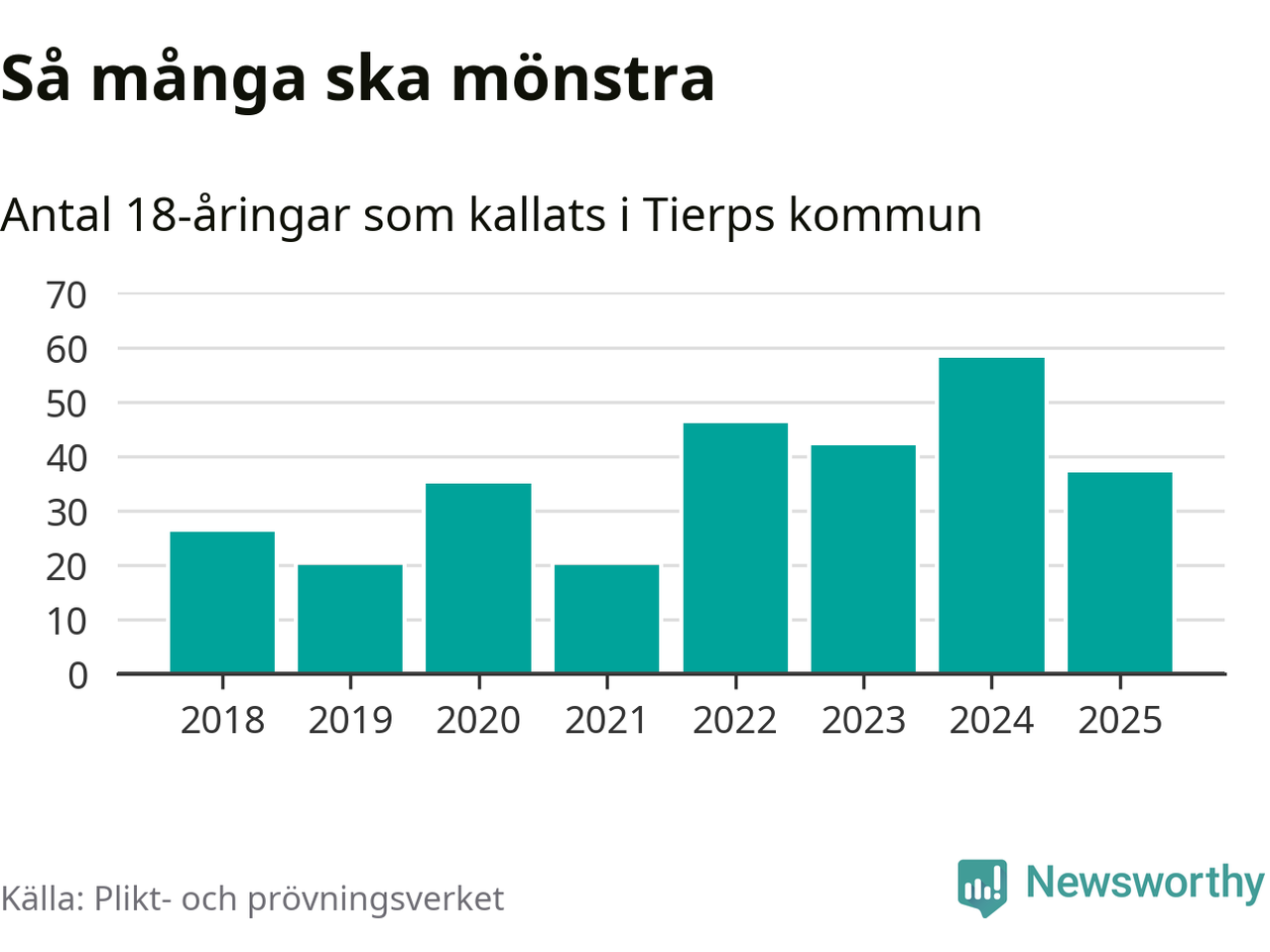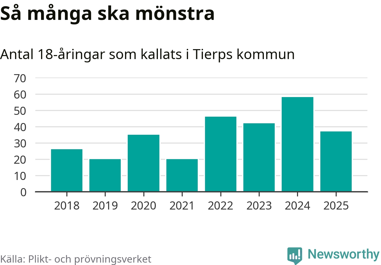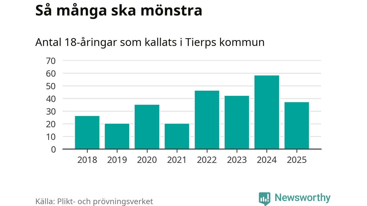 Nu kallas omkring 28 200 svenskar födda 2007 till mönstring. Och 37 av dem kommer från Tierp, enligt ny statistik från Plikt- och prövningsverket. Det innebär att var sjätte invånare i åldersgruppen i kommunen kallas till mönstring. Det är en lägre andel än i Uppsala län totalt. I riket som helhet kallas nästan var fjärde person i årskullen.