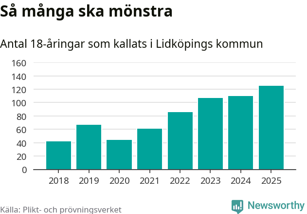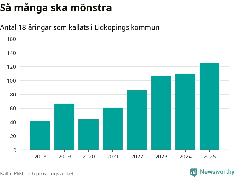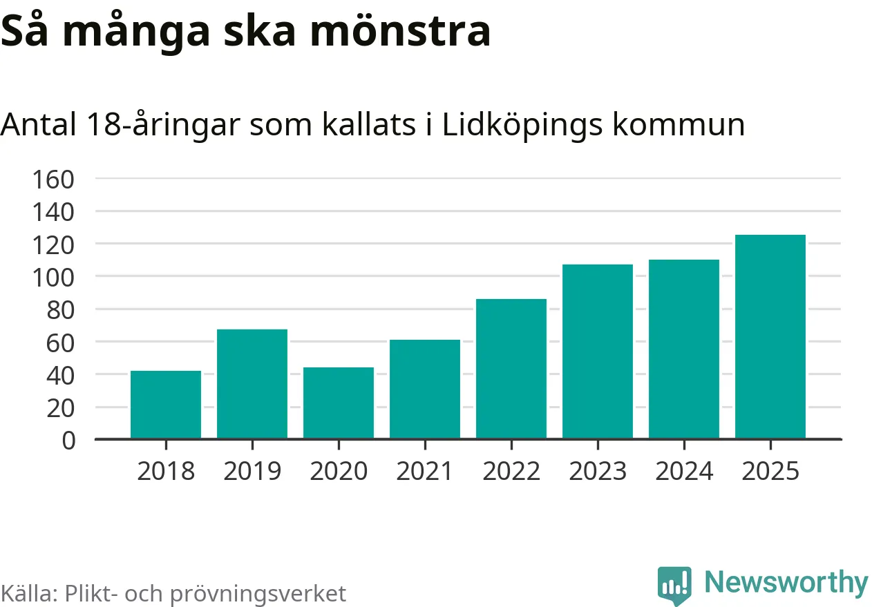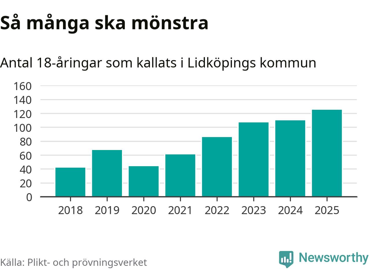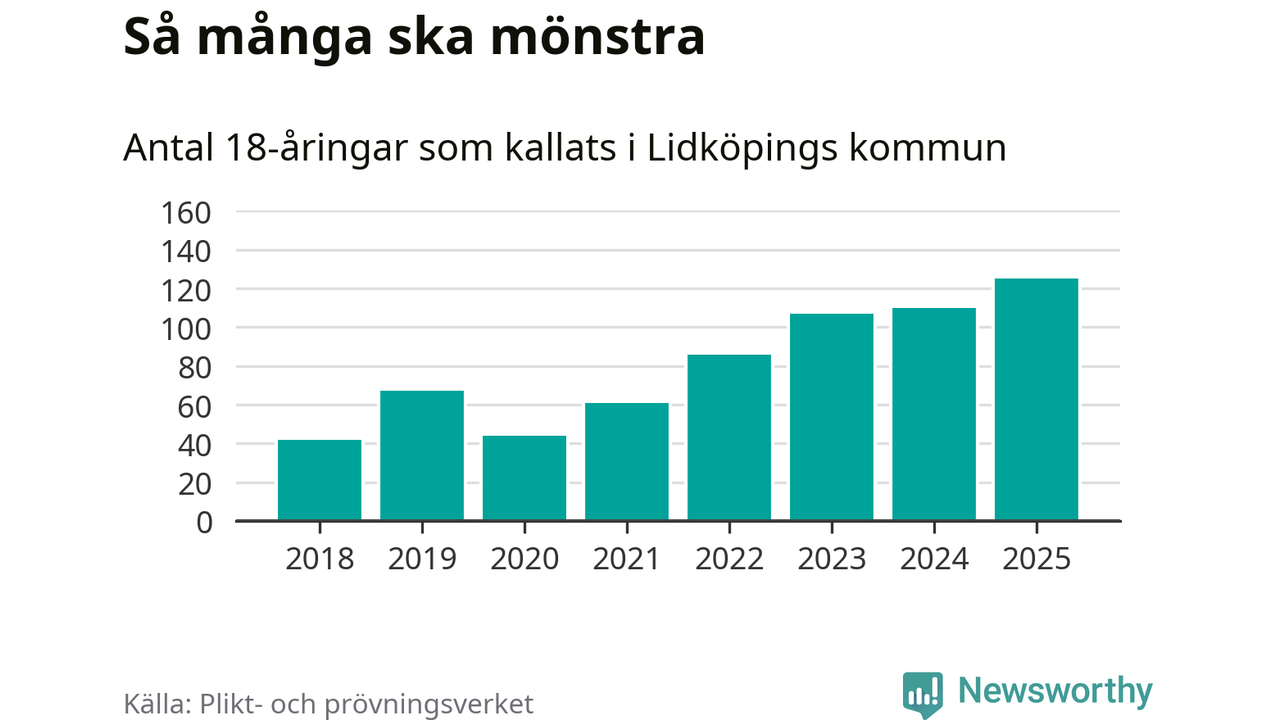 125 personer är det högsta antalet kallade i Lidköping sedan 2018, som är första året med statistik på kommunnivå (värnplikten återinfördes 2017), och 15 mönstrande fler än 2024. Totalt från Västra Götalands län kallas 4 523 personer i år.