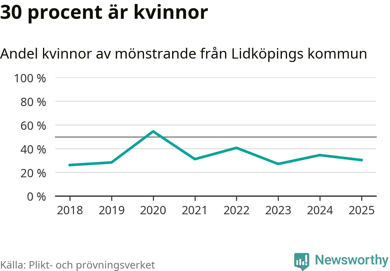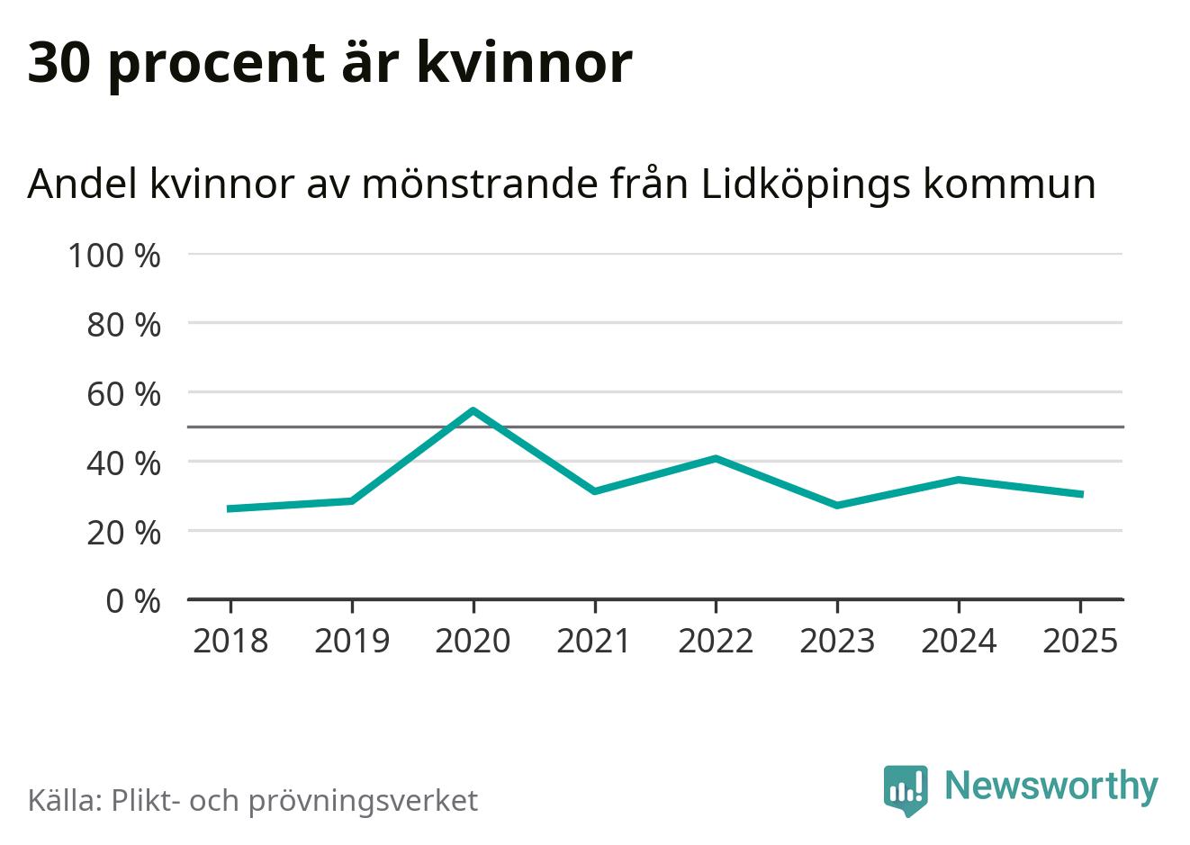 38 av de som kallats till mönstring från Lidköping är kvinnor, vilket motsvarar 30 procent av de mönstrande. I absoluta tal är det fler kvinnor än något år sedan värnplikten återinfördes, men 2020 var en större andel av de mönstrande från kommunen kvinnor (55 procent). I riket som helhet är 28 procent av de mönstrande tjejer.
