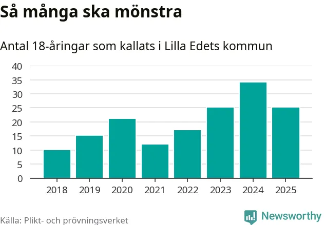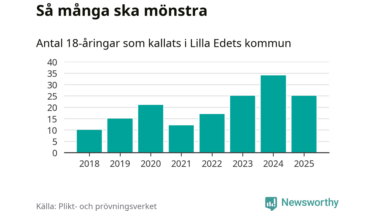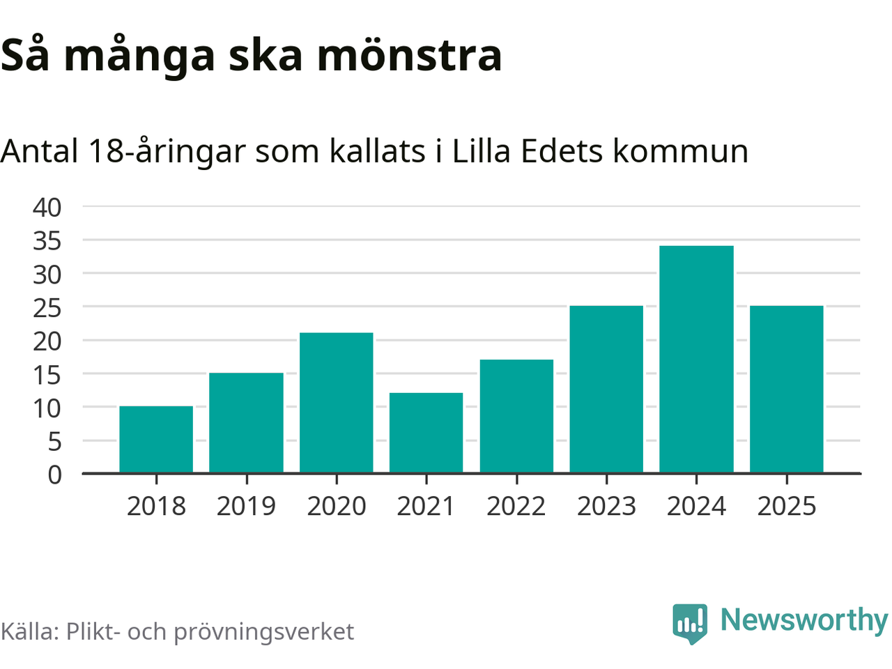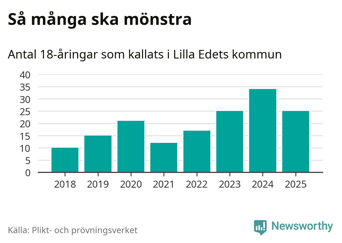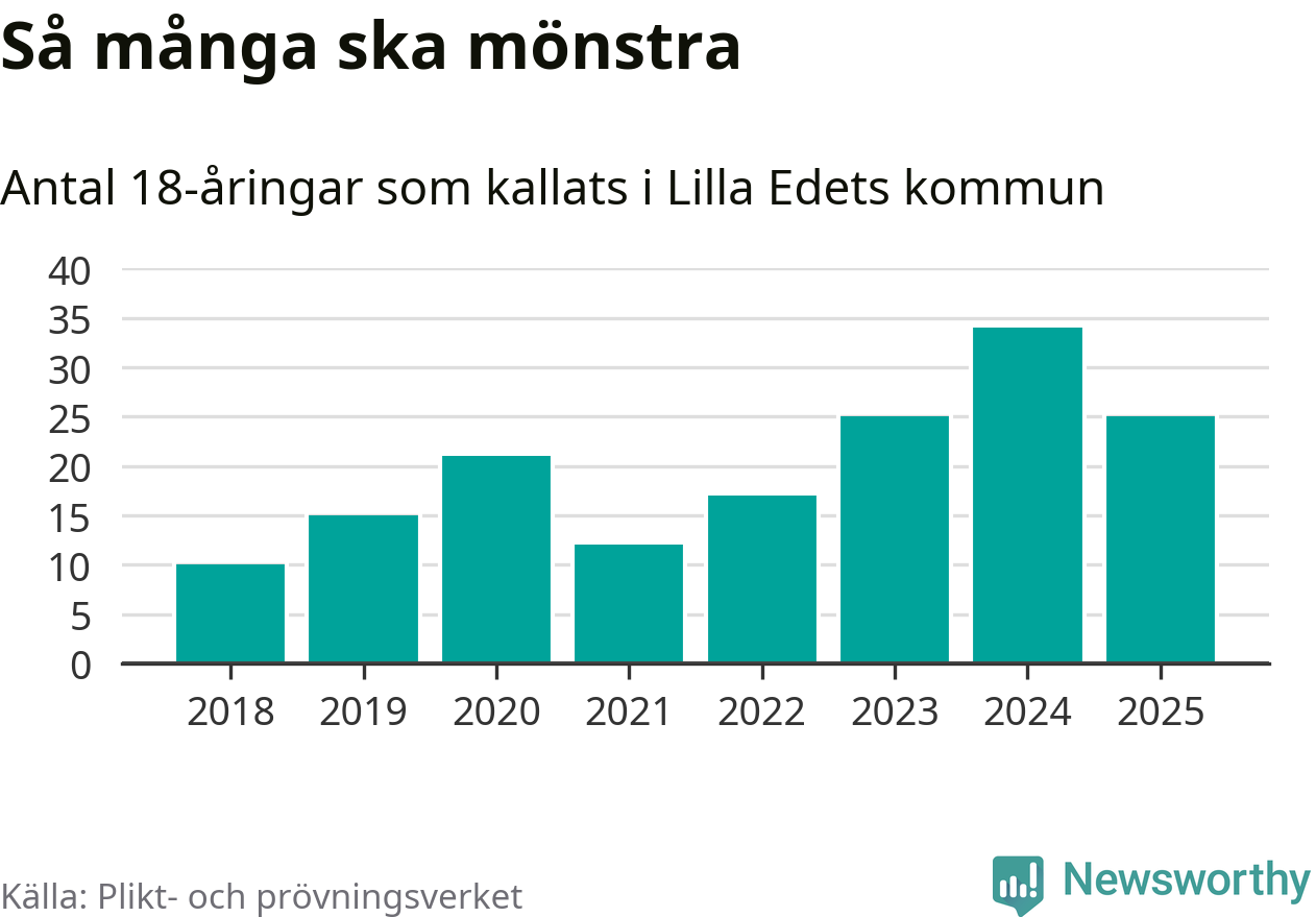 Nu kallas omkring 28 200 svenskar födda 2007 till mönstring. Och 25 av dem kommer från Lilla Edet, enligt ny statistik från Plikt- och prövningsverket. Det innebär att var sjätte invånare i åldersgruppen i kommunen kallas till mönstring. Det är en lägre andel än i Västra Götaland totalt. I riket som helhet kallas nästan var fjärde person i årskullen.
