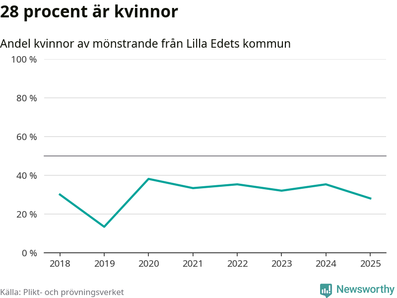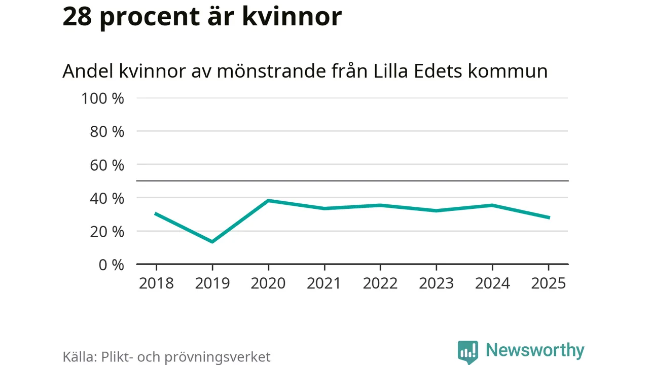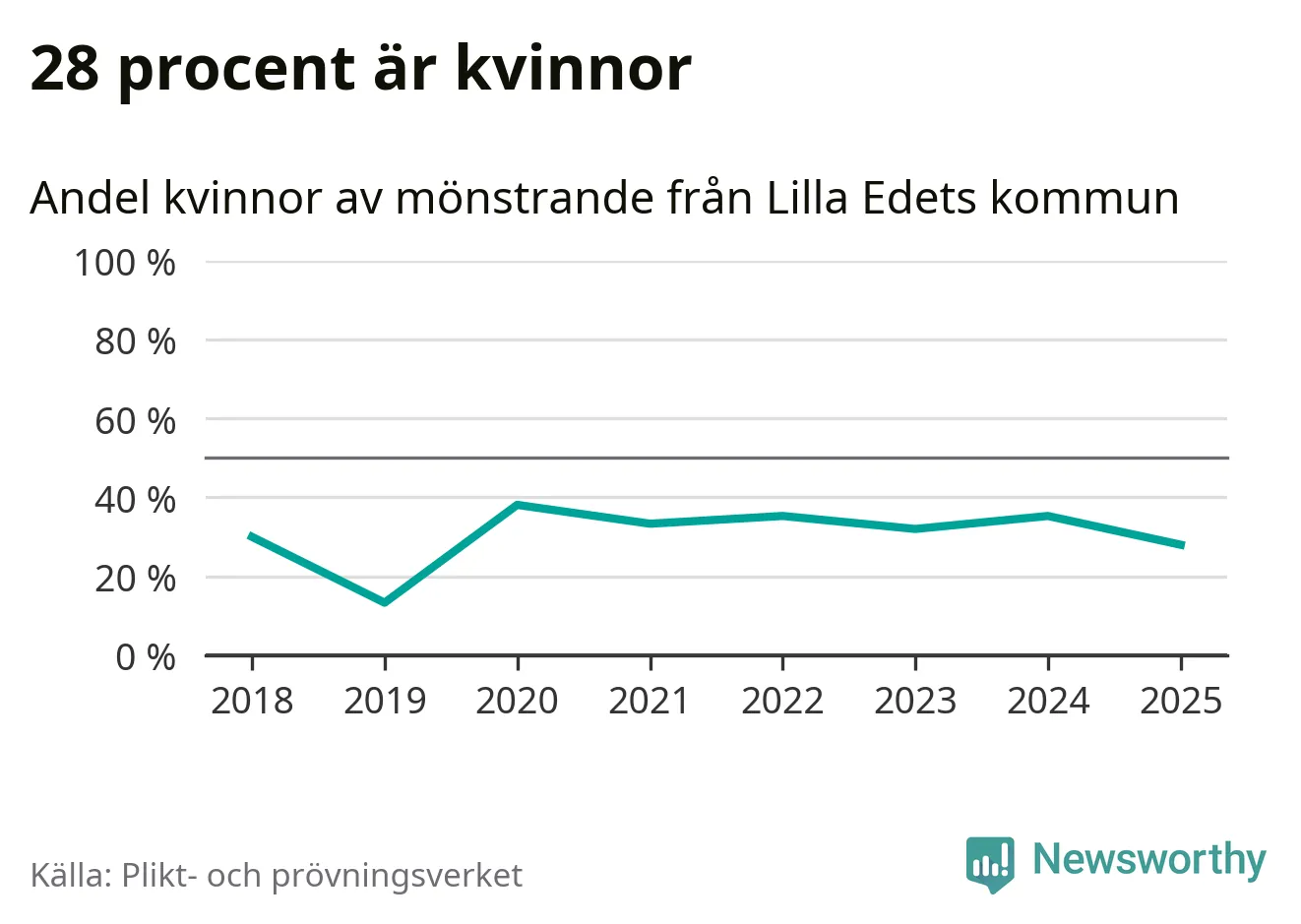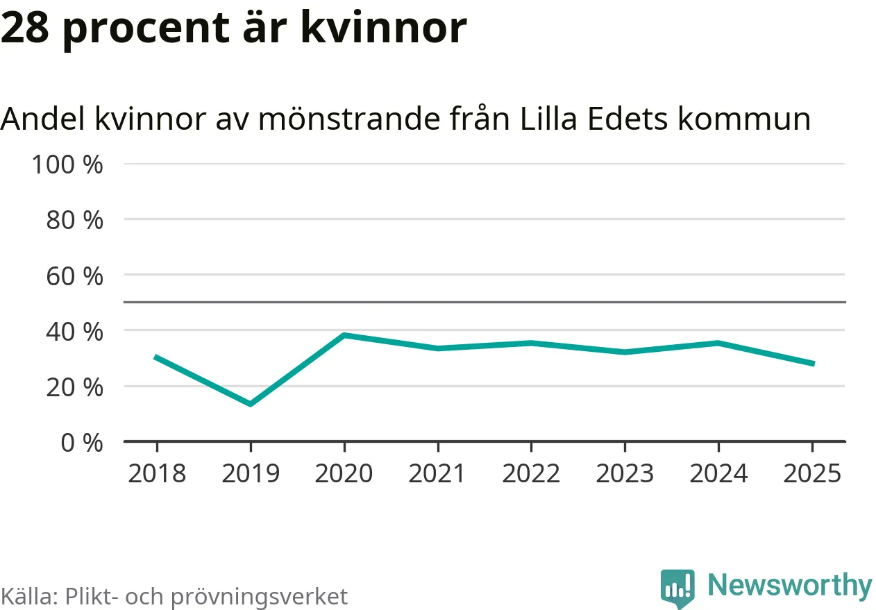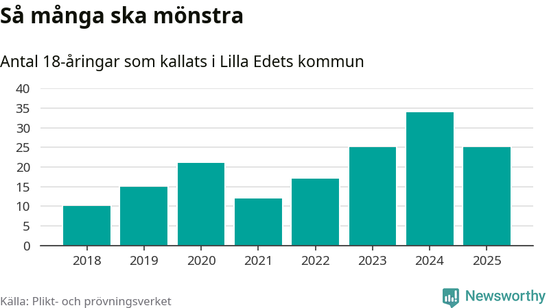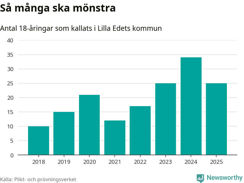 Nu kallas omkring 28 200 svenskar födda 2007 till mönstring. Och 25 av dem kommer från Lilla Edet, enligt ny statistik från Plikt- och prövningsverket. Det innebär att var sjätte invånare i åldersgruppen i kommunen kallas till mönstring. Det är en lägre andel än i Västra Götaland totalt. I riket som helhet kallas nästan var fjärde person i årskullen.