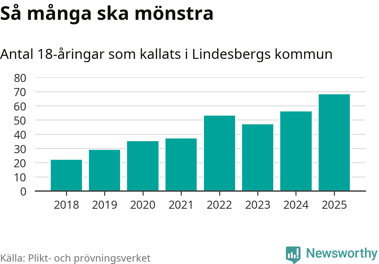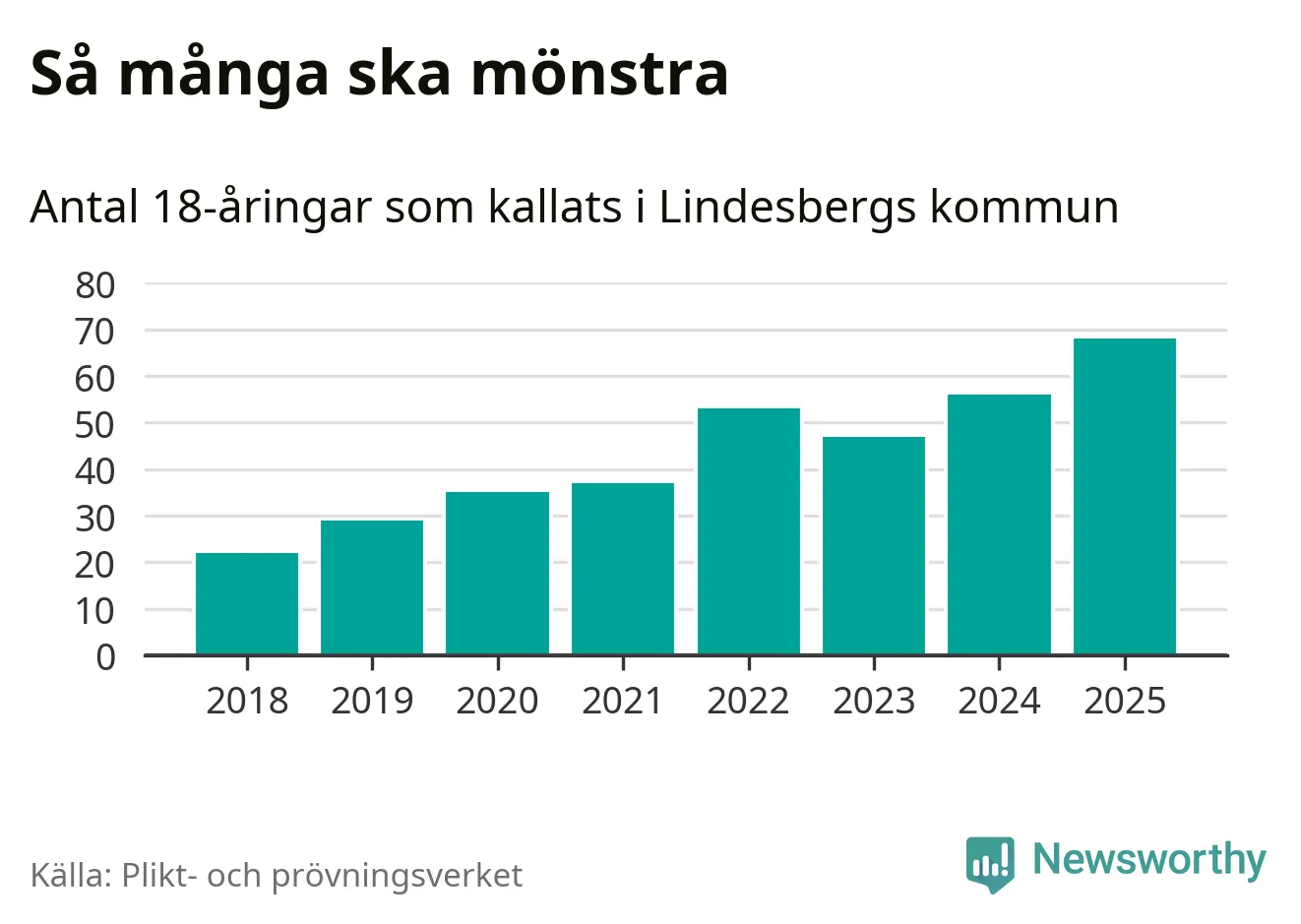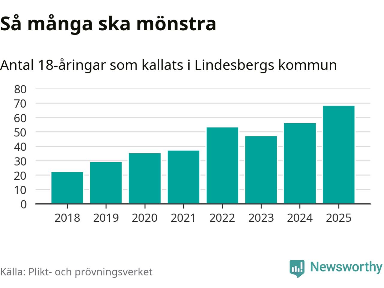 68 personer är det högsta antalet kallade i Lindesberg sedan 2018, som är första året med statistik på kommunnivå (värnplikten återinfördes 2017), och tolv mönstrande fler än 2024. Totalt från Örebro län kallas 828 personer i år.
