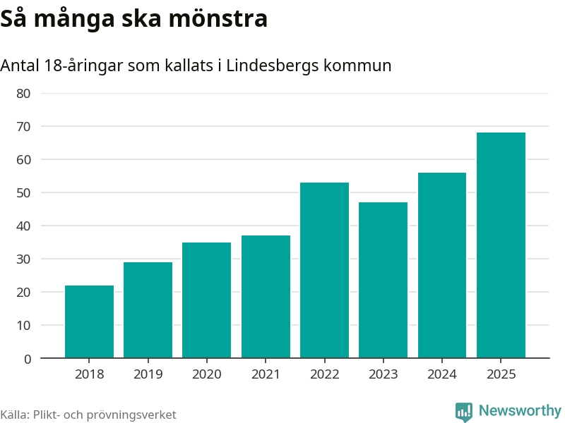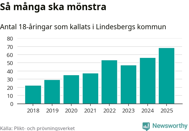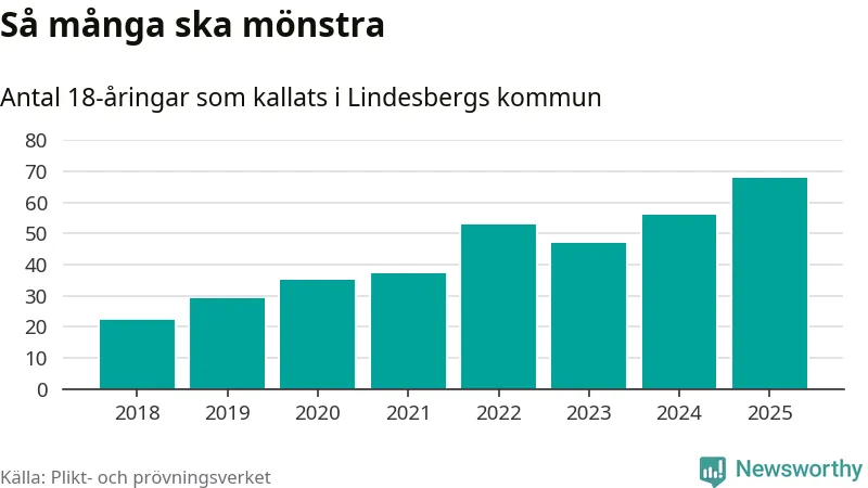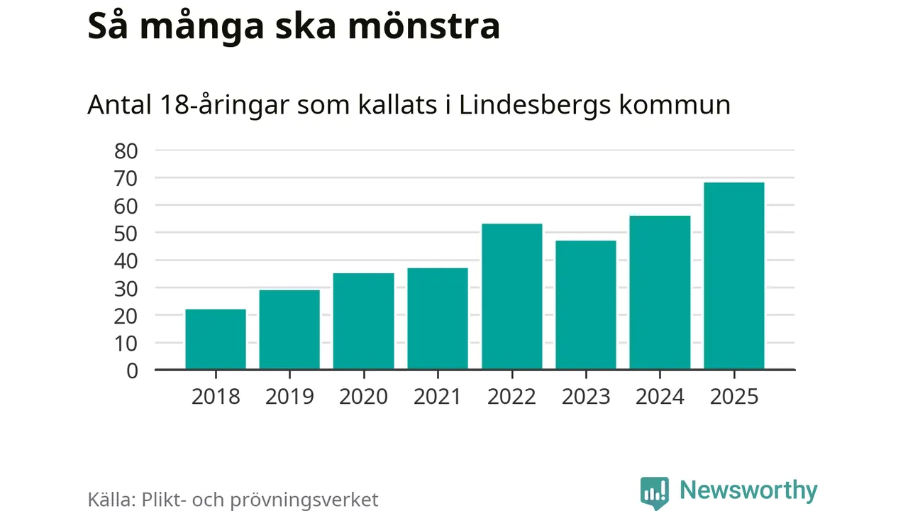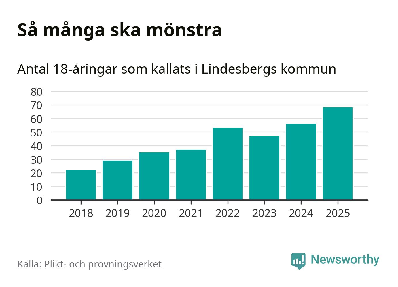 68 personer är det högsta antalet kallade i Lindesberg sedan 2018, som är första året med statistik på kommunnivå (värnplikten återinfördes 2017), och tolv mönstrande fler än 2024. Totalt från Örebro län kallas 828 personer i år.