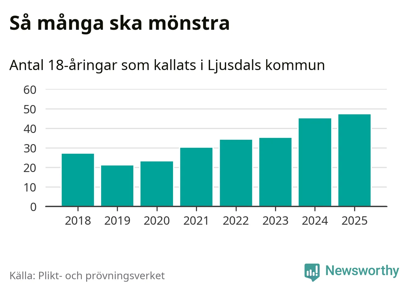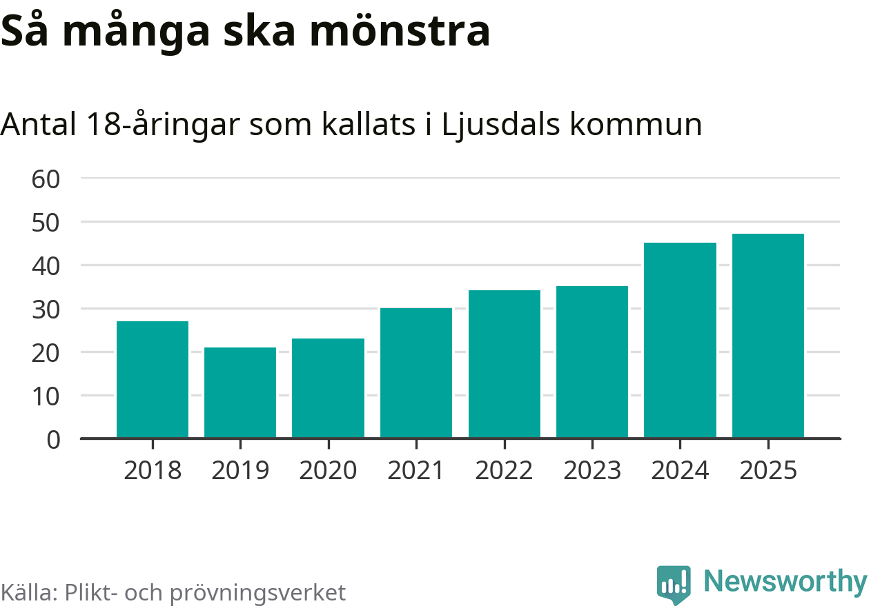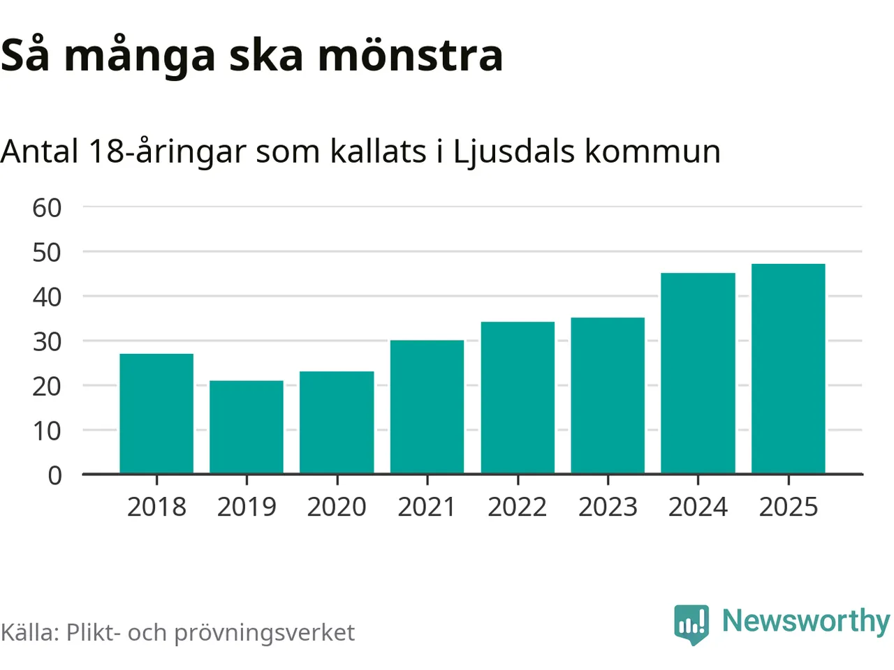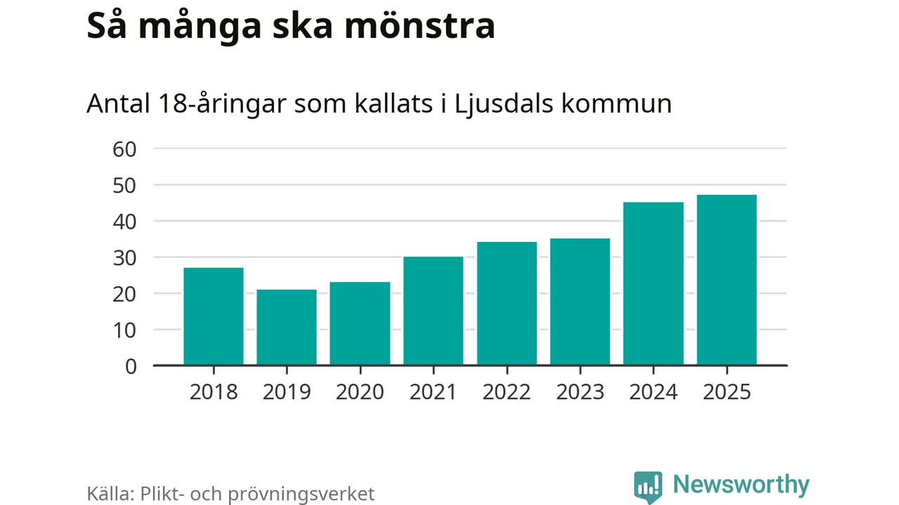 47 personer är det högsta antalet kallade i Ljusdal sedan 2018, som är första året med statistik på kommunnivå (värnplikten återinfördes 2017), och två mönstrande fler än 2024. Totalt från Gävleborgs län kallas 710 personer i år.