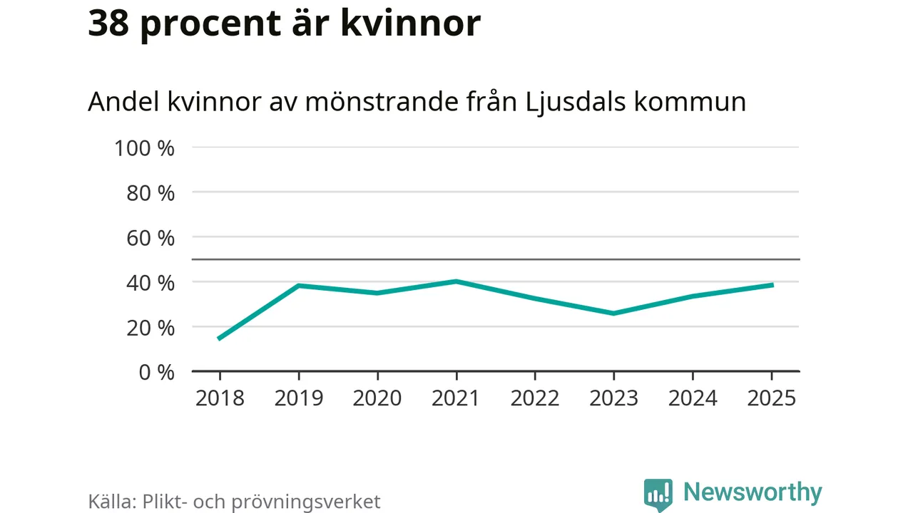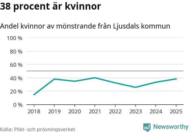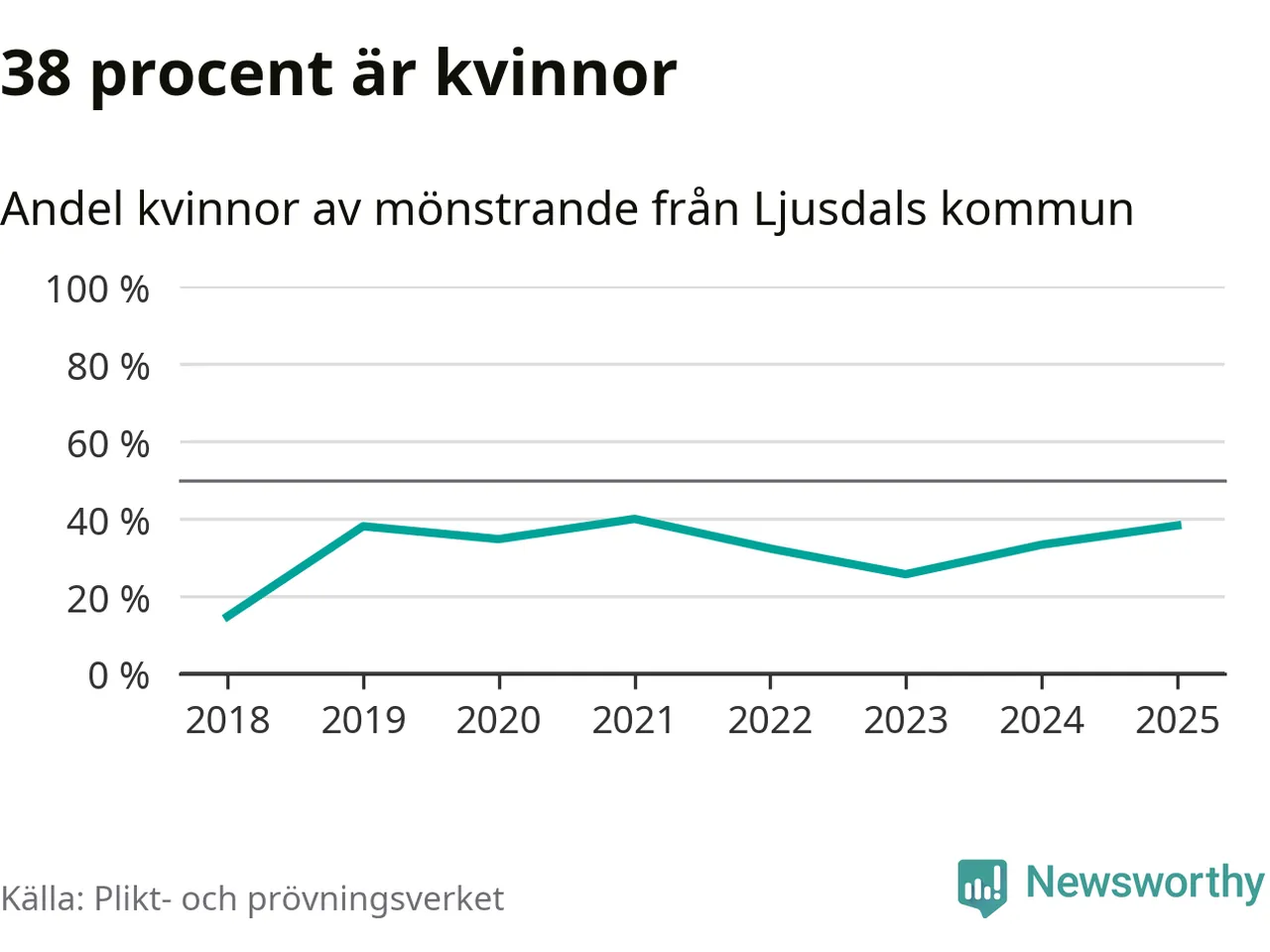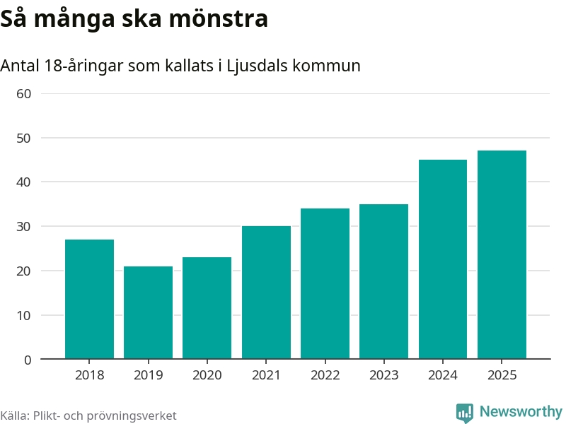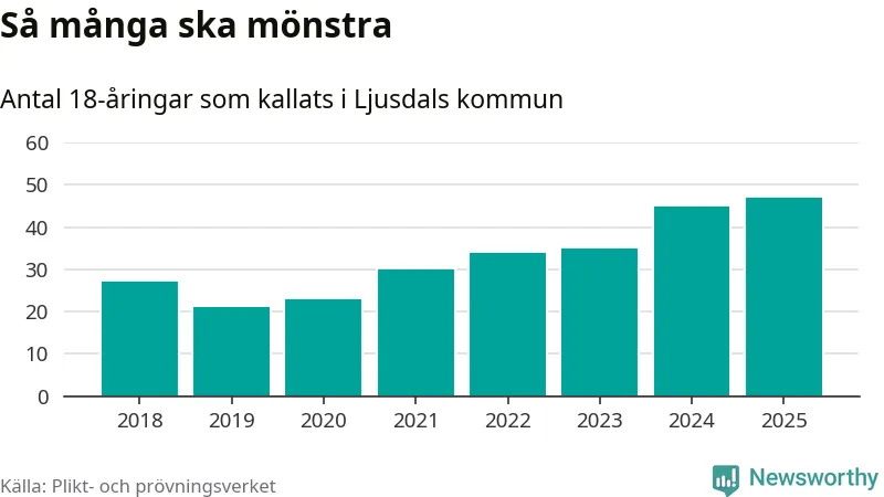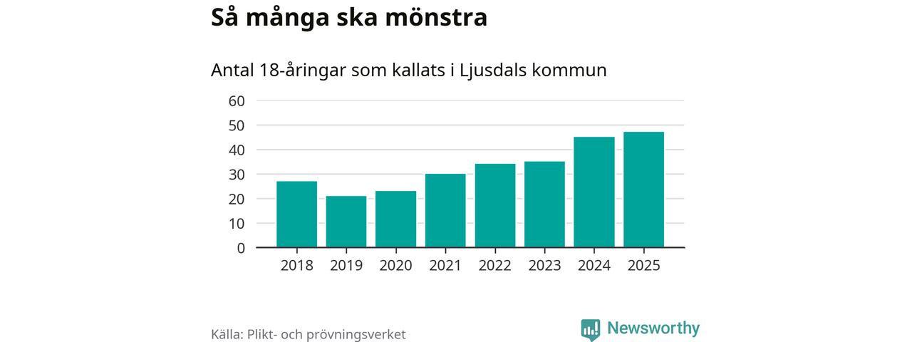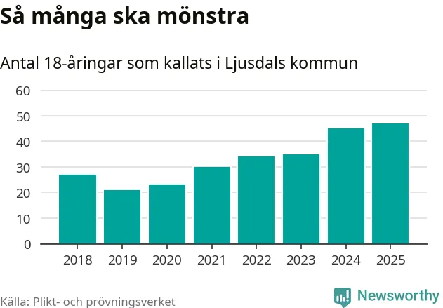 47 personer är det högsta antalet kallade i Ljusdal sedan 2018, som är första året med statistik på kommunnivå (värnplikten återinfördes 2017), och två mönstrande fler än 2024. Totalt från Gävleborgs län kallas 710 personer i år.