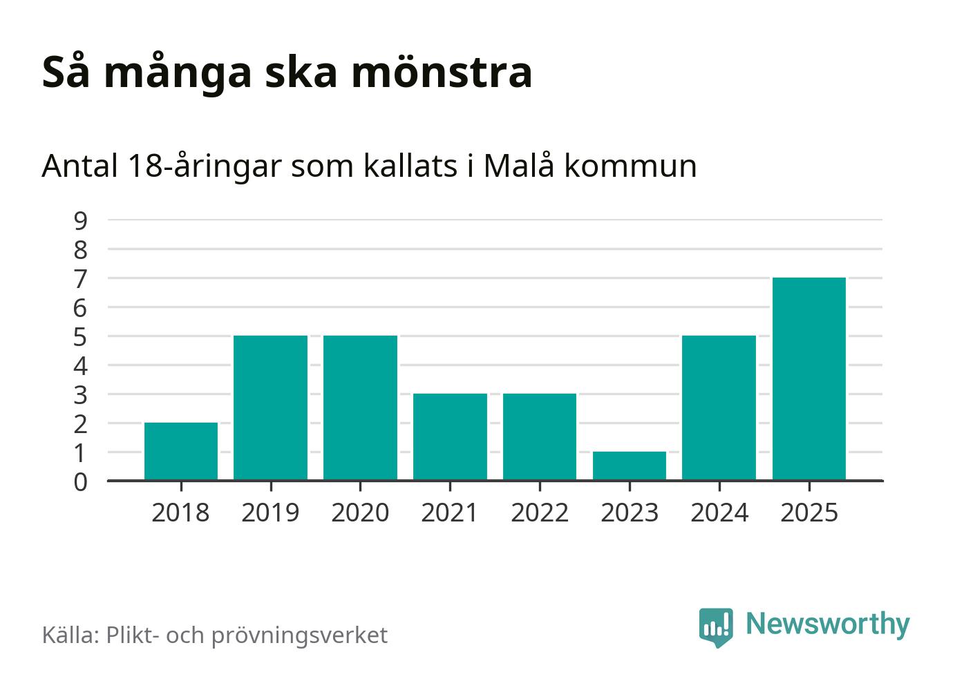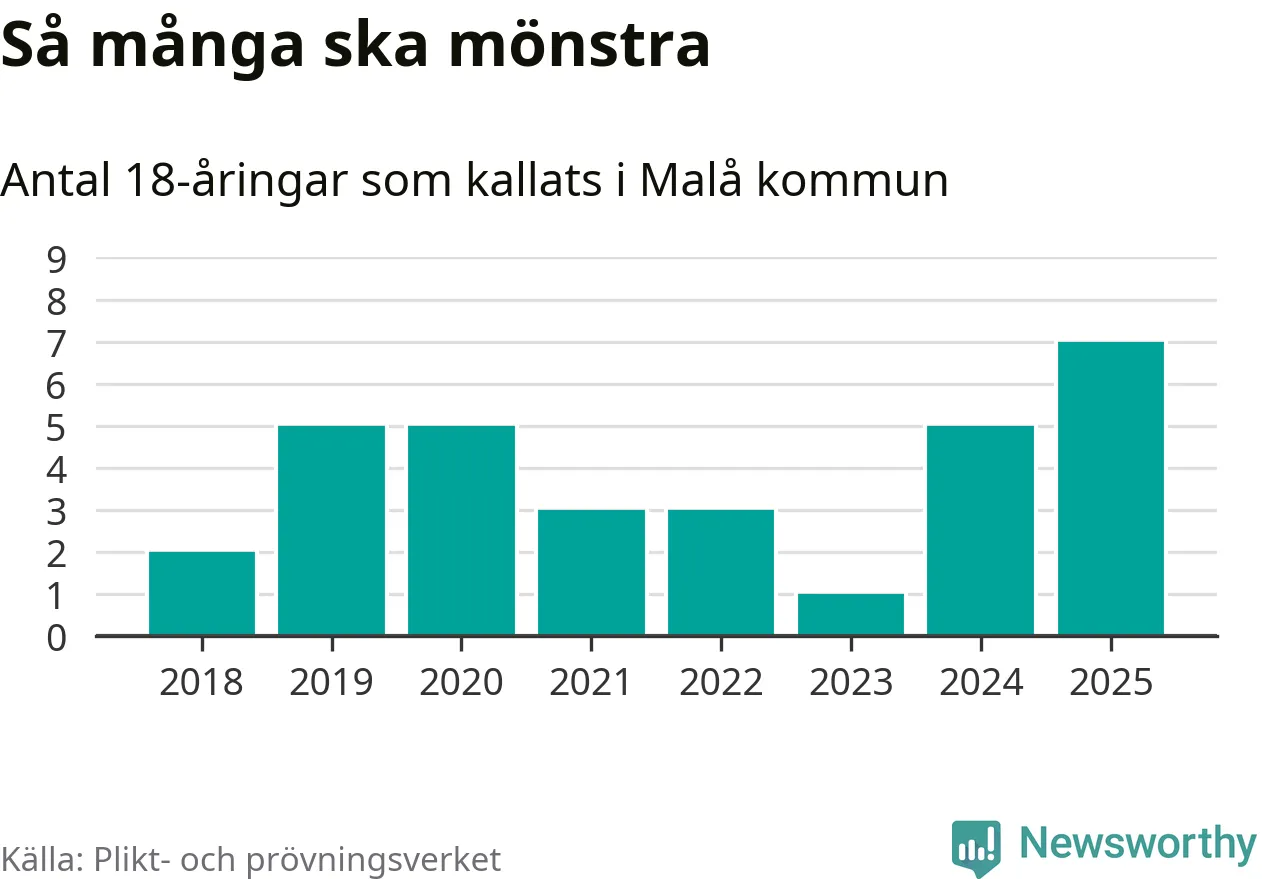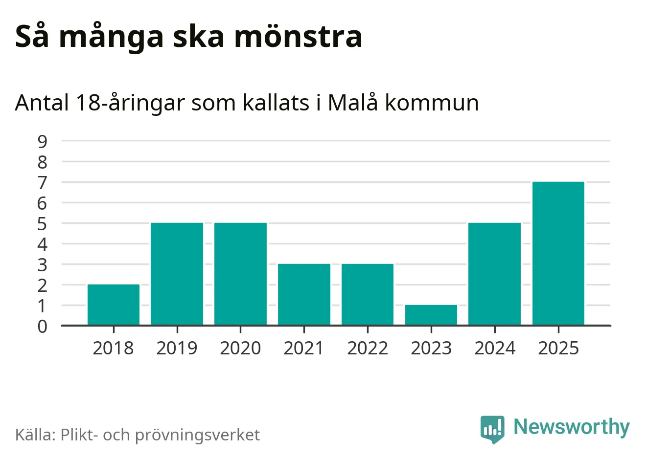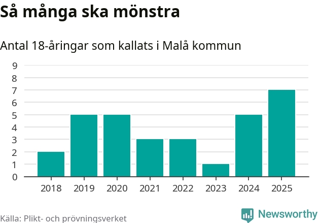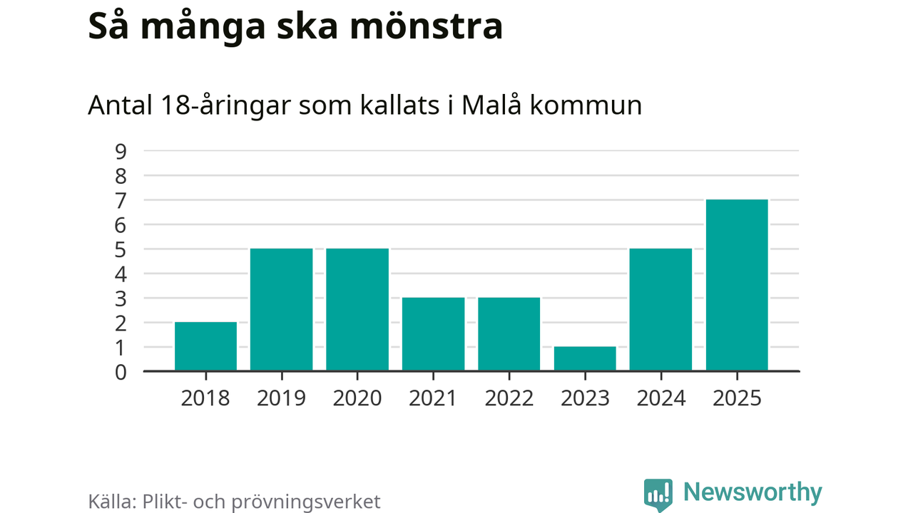 Sju personer är det högsta antalet kallade i Malå sedan 2018, som är första året med statistik på kommunnivå (värnplikten återinfördes 2017), och två mönstrande fler än 2024. Totalt från Västerbottens län kallas 671 personer i år.