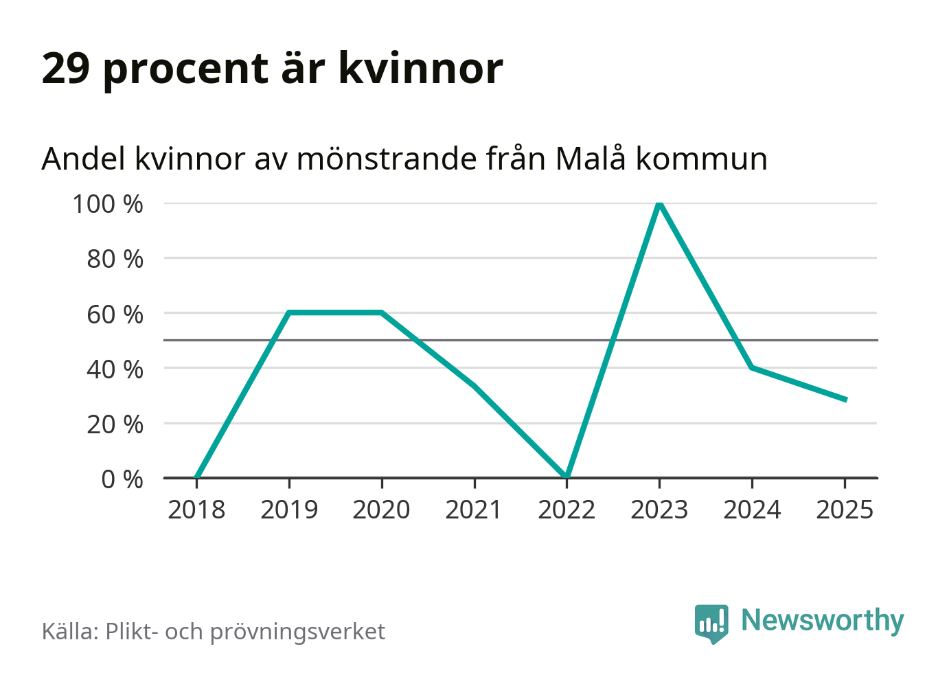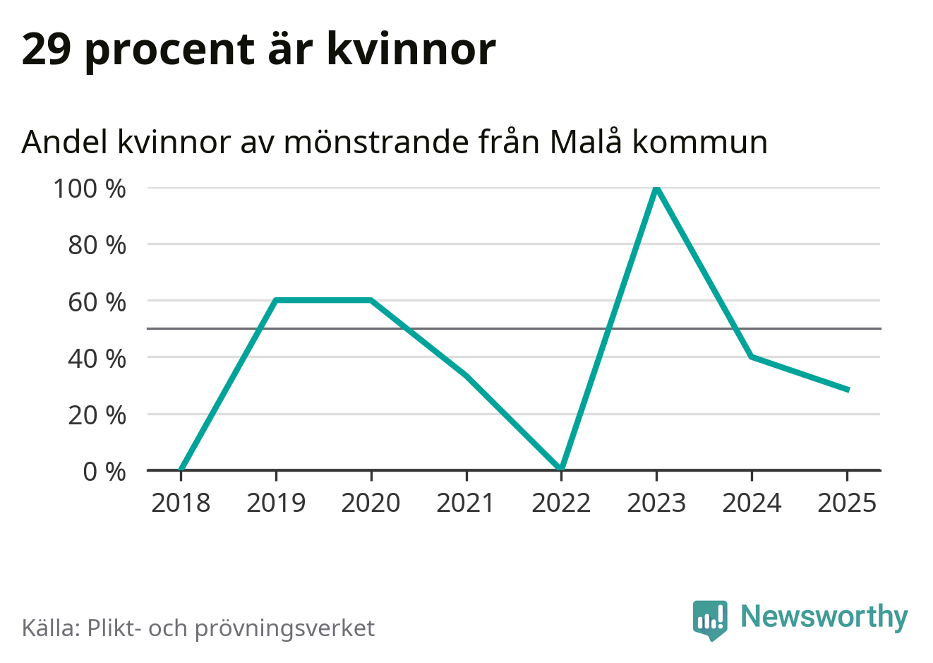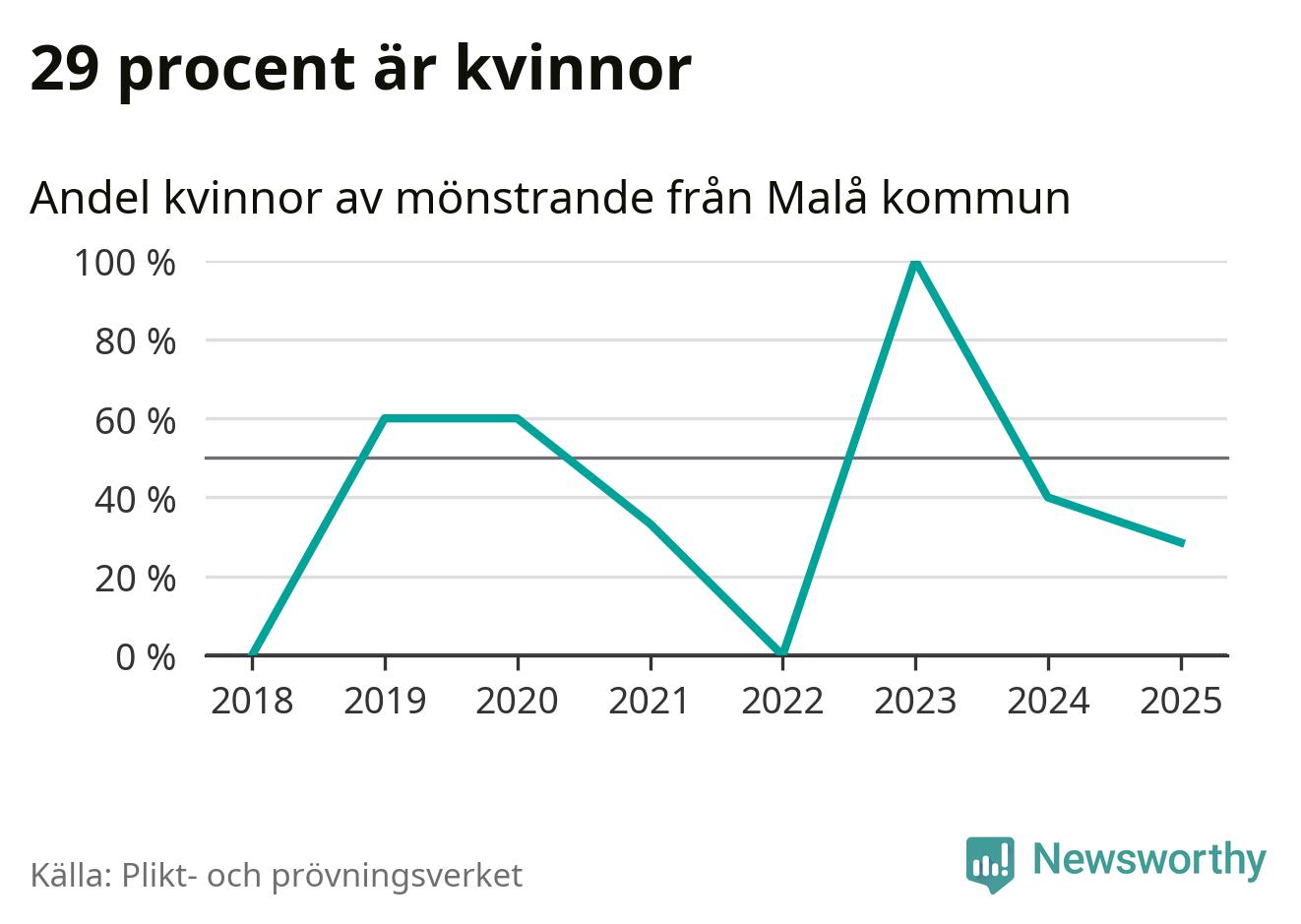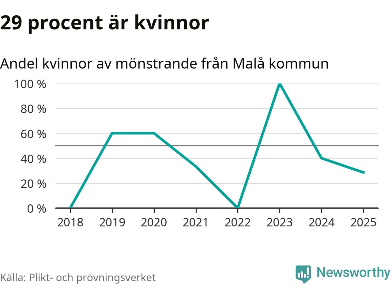 Två av de som kallats till mönstring från Malå är kvinnor, vilket motsvarar 29 procent av de mönstrande. Som mest har tre kvinnor kallats från kommunen (2020 och 2019). I riket som helhet är 28 procent av de mönstrande tjejer.