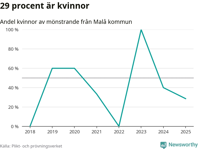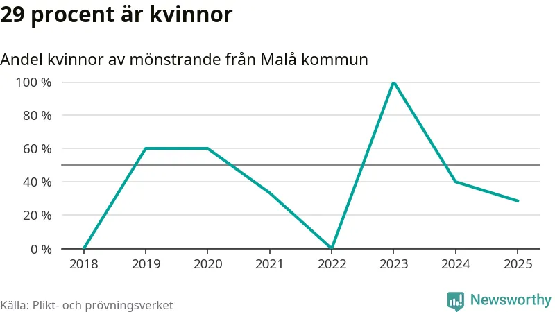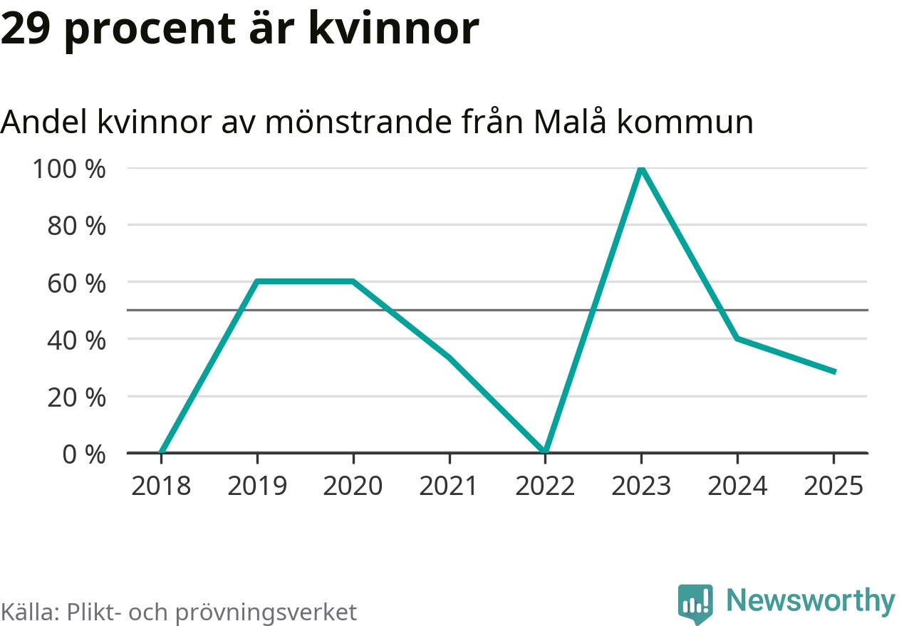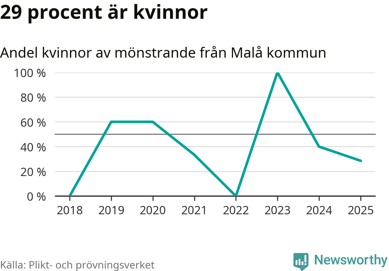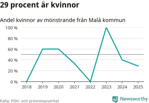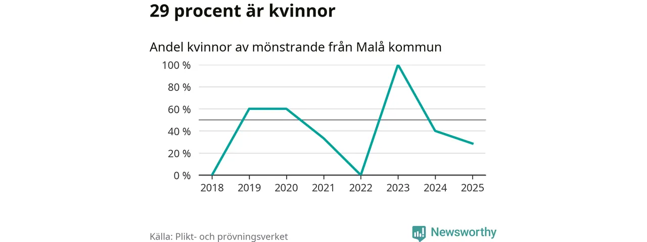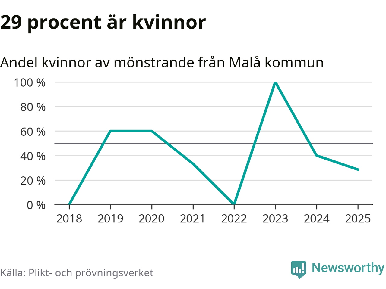 Två av de som kallats till mönstring från Malå är kvinnor, vilket motsvarar 29 procent av de mönstrande. Som mest har tre kvinnor kallats från kommunen (2020 och 2019). I riket som helhet är 28 procent av de mönstrande tjejer.