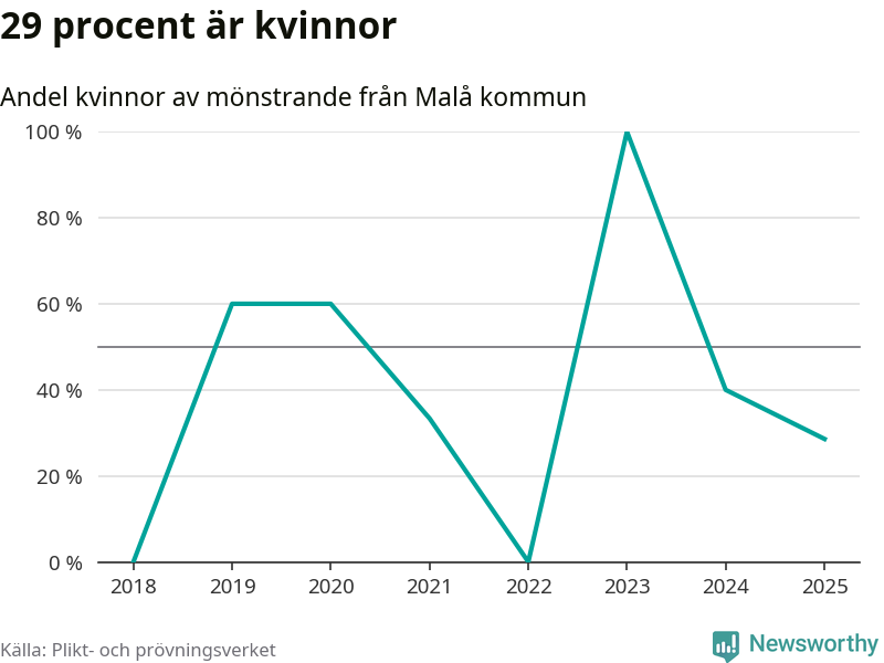 Nu kallas omkring 28 200 svenskar födda 2007 till mönstring. Och sju av dem kommer från Malå, enligt ny statistik från Plikt- och prövningsverket. Det innebär att var femte invånare i åldersgruppen i kommunen kallas till mönstring. Det är en lägre andel än i Västerbotten totalt. I riket som helhet kallas nästan var fjärde person i årskullen.