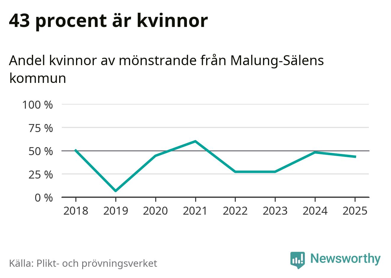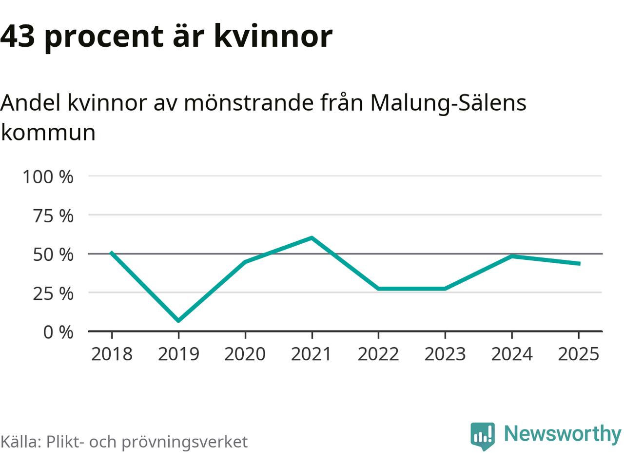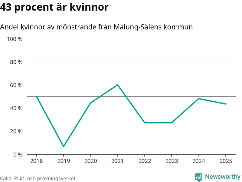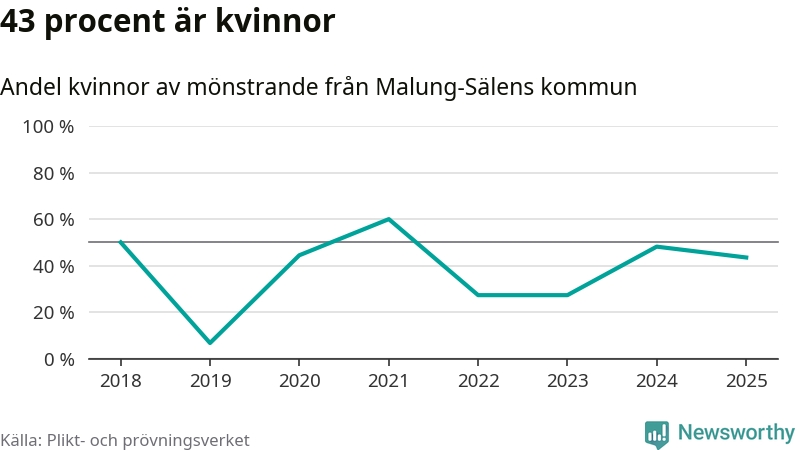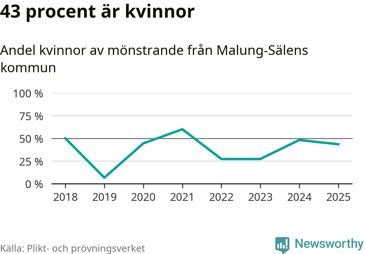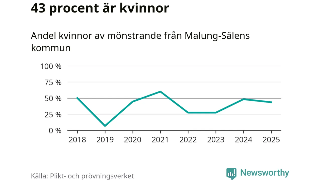 Tio av de som kallats till mönstring från Malung-Sälen är kvinnor, vilket motsvarar 43 procent av de mönstrande. Som mest har 13 kvinnor kallats från kommunen (2024). I riket som helhet är 28 procent av de mönstrande tjejer.