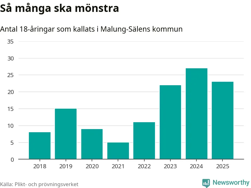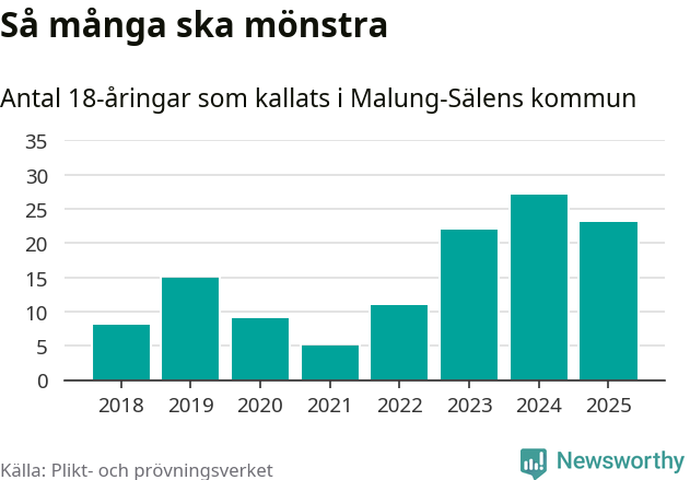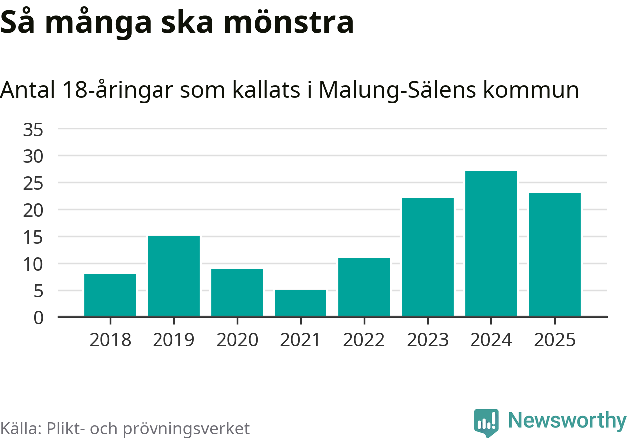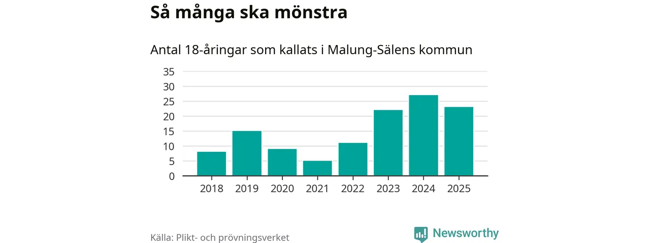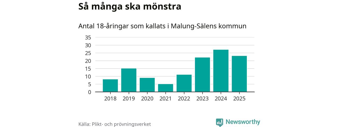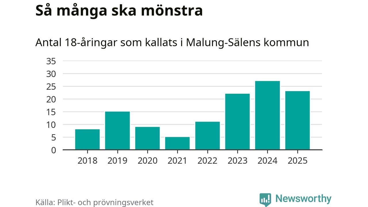 Nu kallas omkring 28 200 svenskar födda 2007 till mönstring. Och 23 av dem kommer från Malung-Sälen, enligt ny statistik från Plikt- och prövningsverket. Det innebär att var femte invånare i åldersgruppen i kommunen kallas till mönstring. Det är ungefär lika stor andel som i Dalarna totalt. I riket som helhet kallas nästan var fjärde person i årskullen.