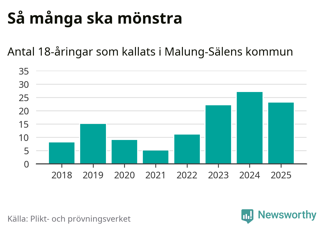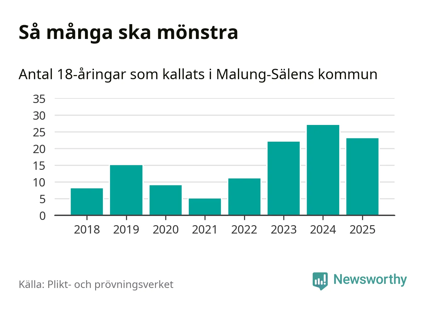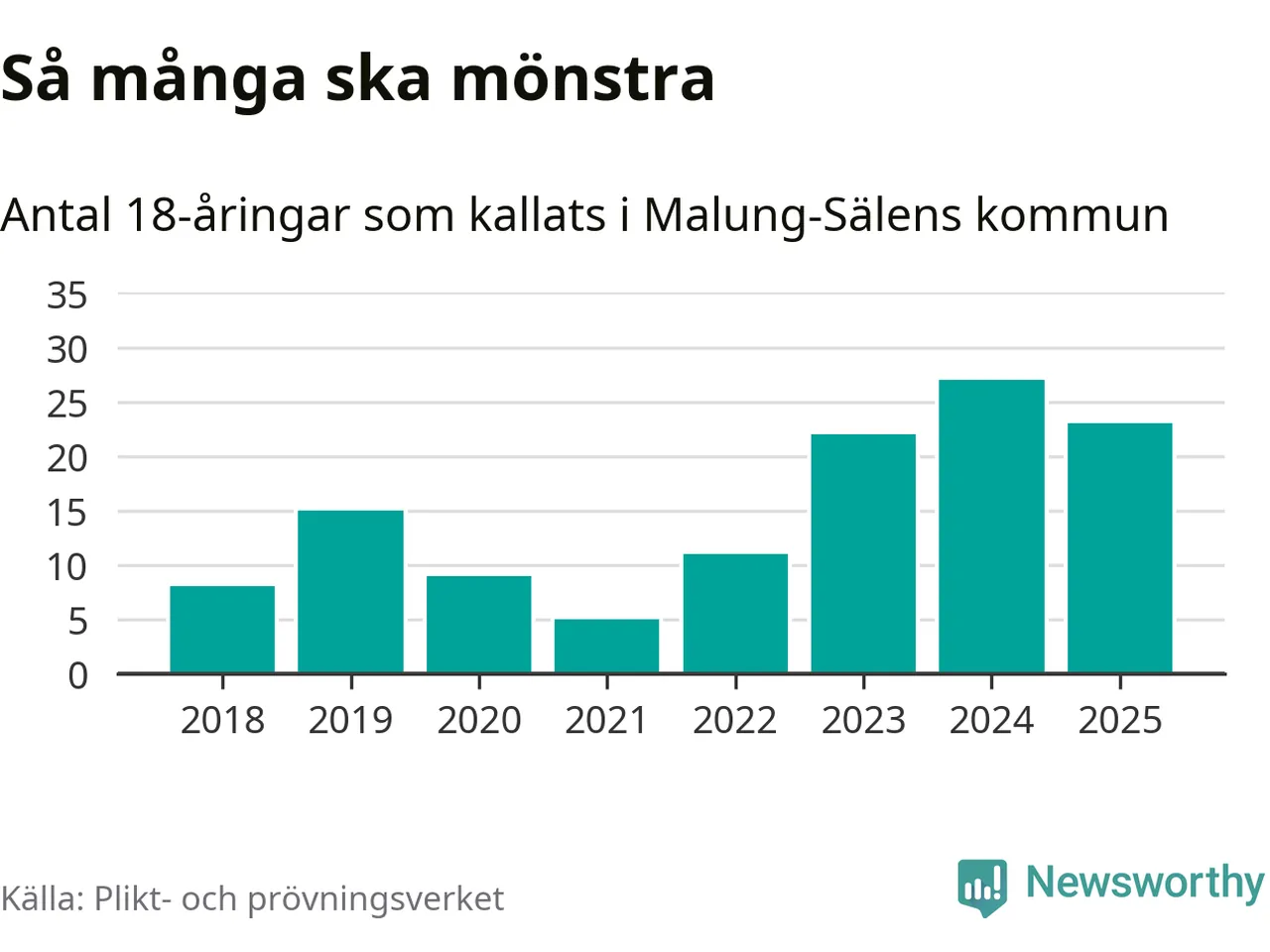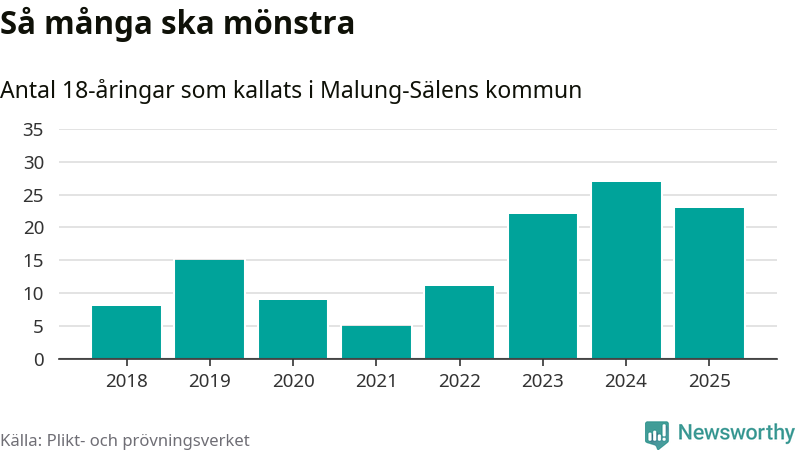 Nu kallas omkring 28 200 svenskar födda 2007 till mönstring. Och 23 av dem kommer från Malung-Sälen, enligt ny statistik från Plikt- och prövningsverket. Det innebär att var femte invånare i åldersgruppen i kommunen kallas till mönstring. Det är ungefär lika stor andel som i Dalarna totalt. I riket som helhet kallas nästan var fjärde person i årskullen.