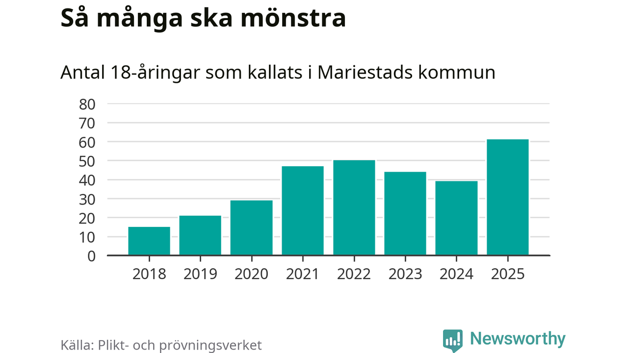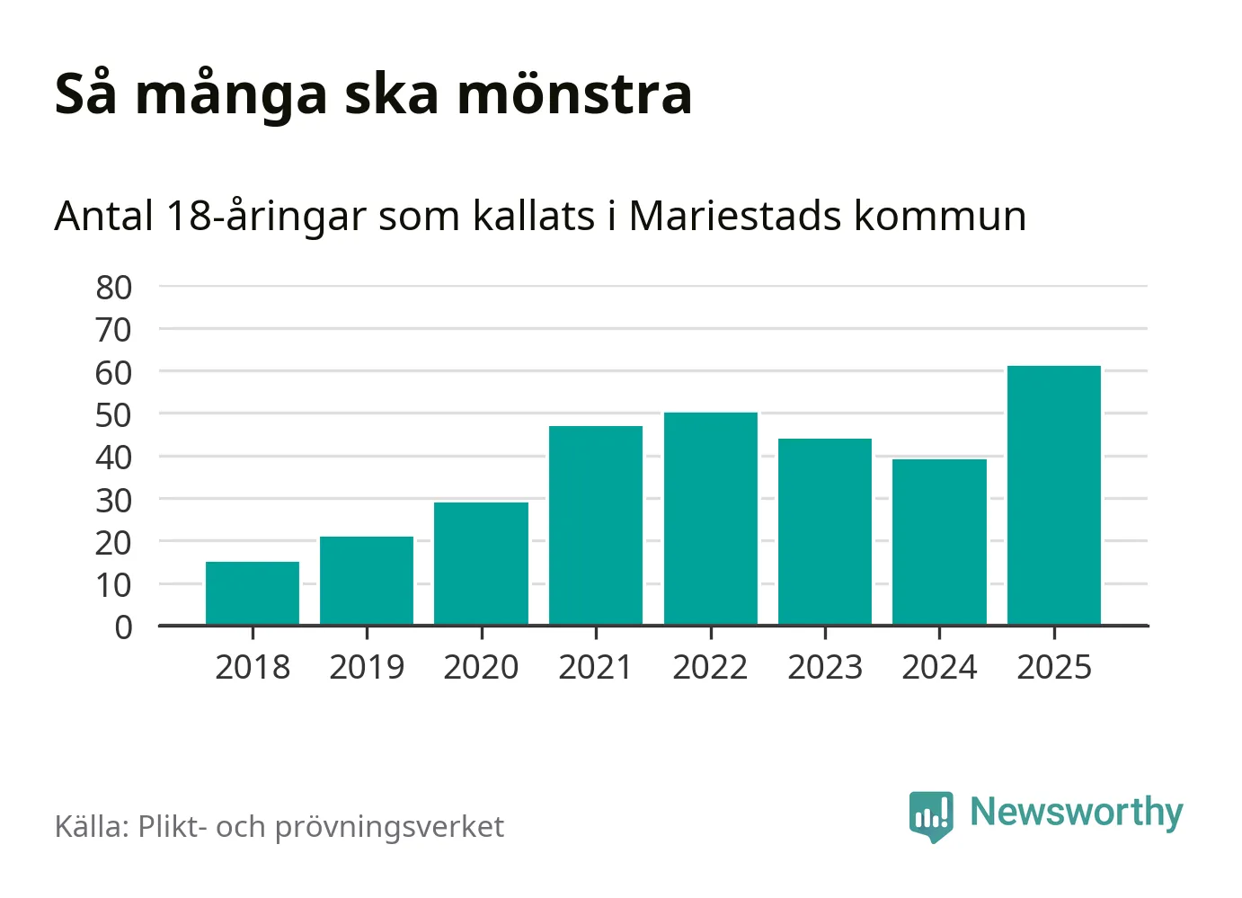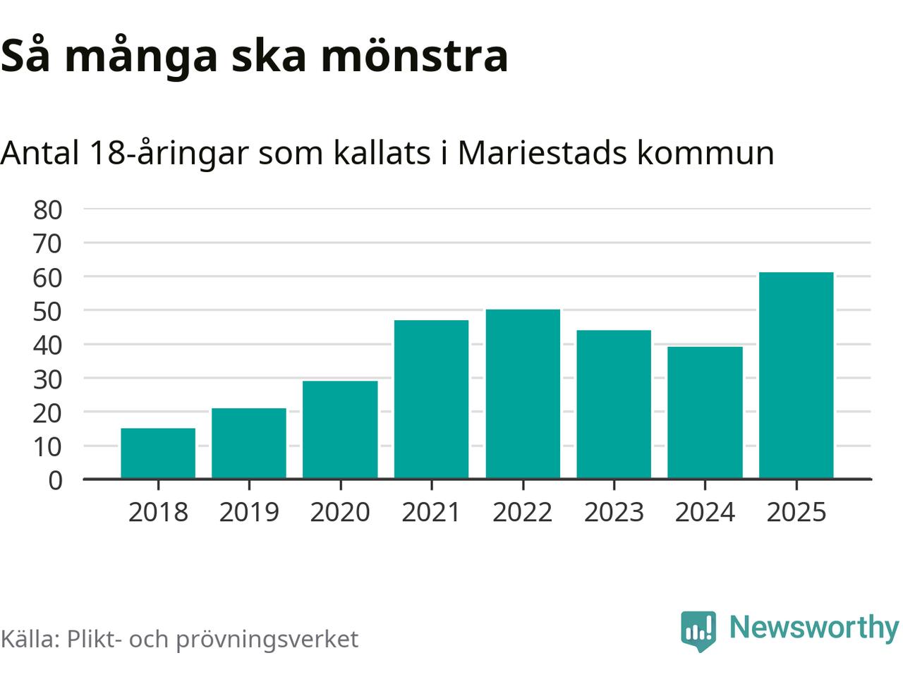 61 personer är det högsta antalet kallade i Mariestad sedan 2018, som är första året med statistik på kommunnivå (värnplikten återinfördes 2017), och 22 mönstrande fler än 2024. Totalt från Västra Götalands län kallas 4 523 personer i år.