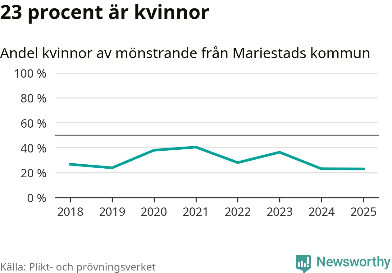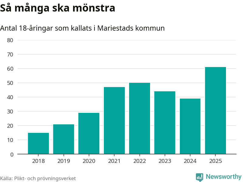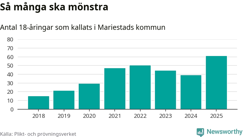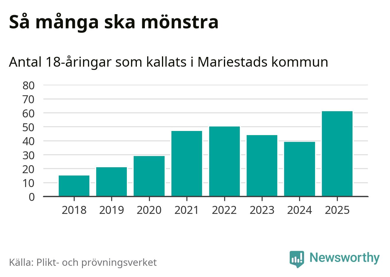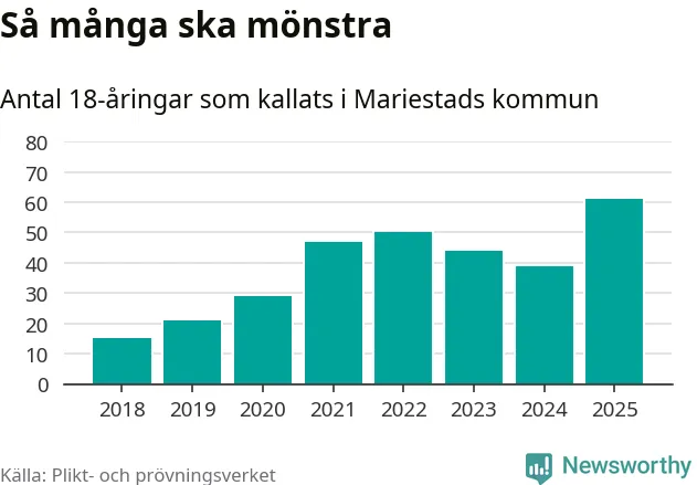 61 personer är det högsta antalet kallade i Mariestad sedan 2018, som är första året med statistik på kommunnivå (värnplikten återinfördes 2017), och 22 mönstrande fler än 2024. Totalt från Västra Götalands län kallas 4 523 personer i år.