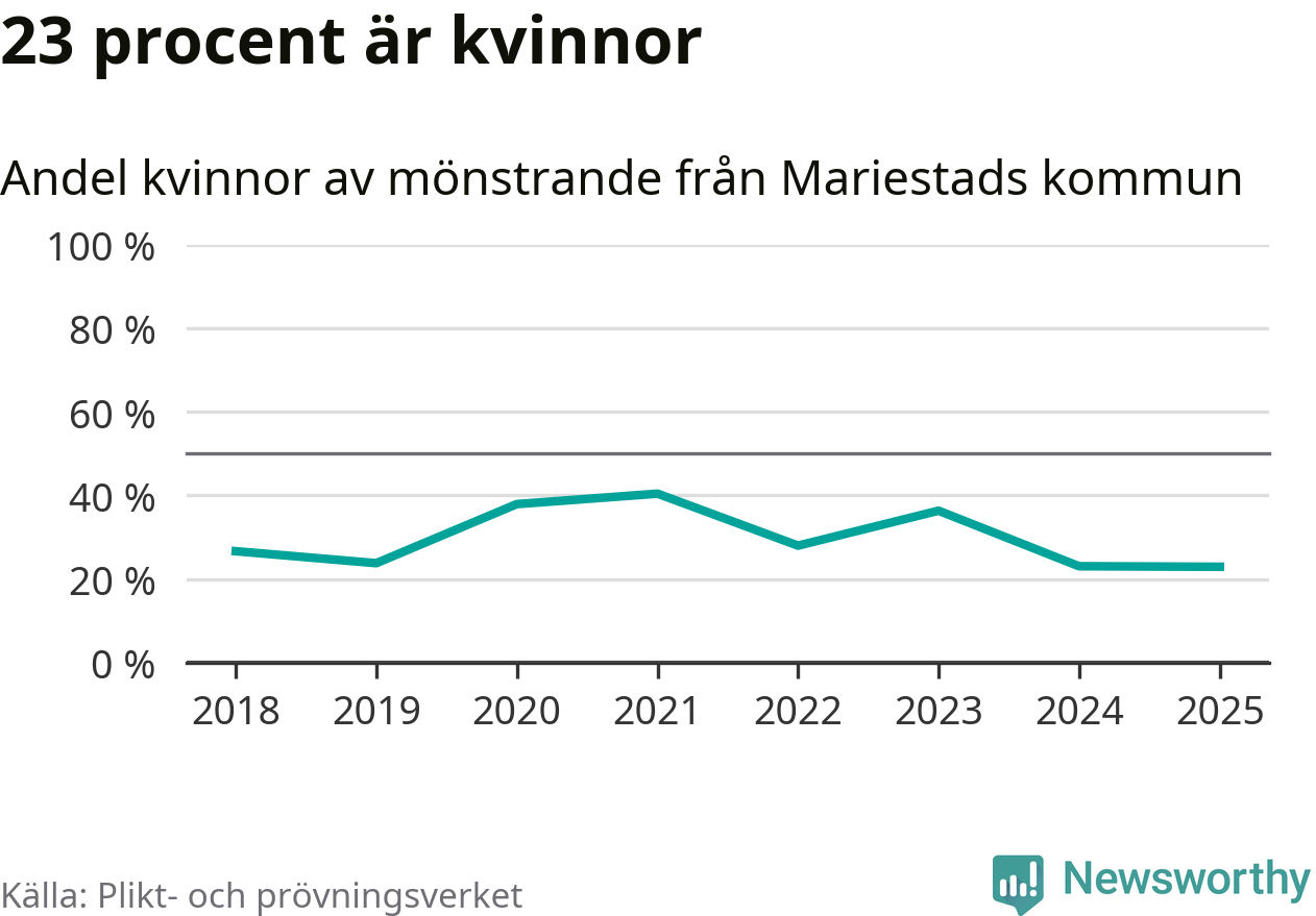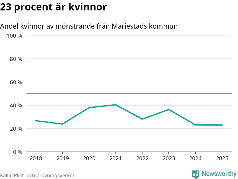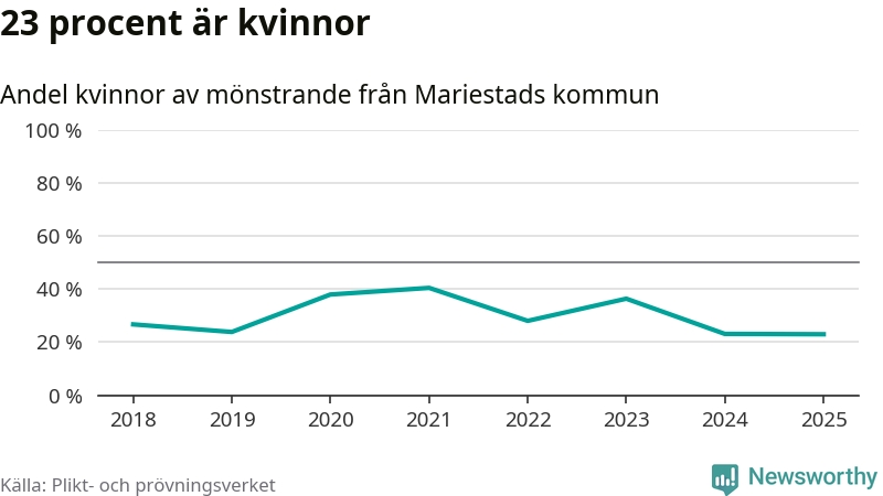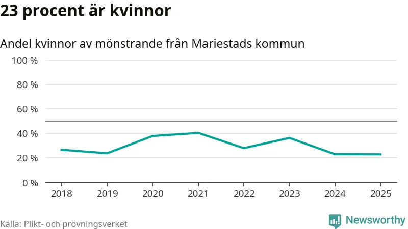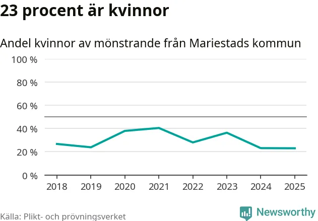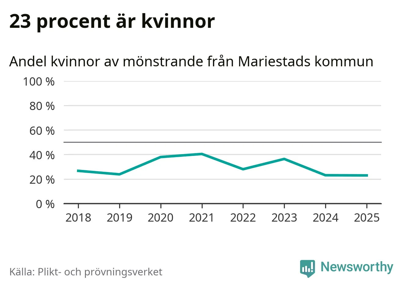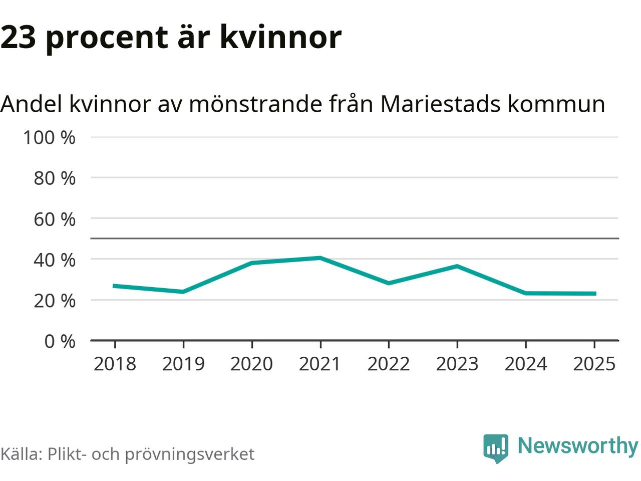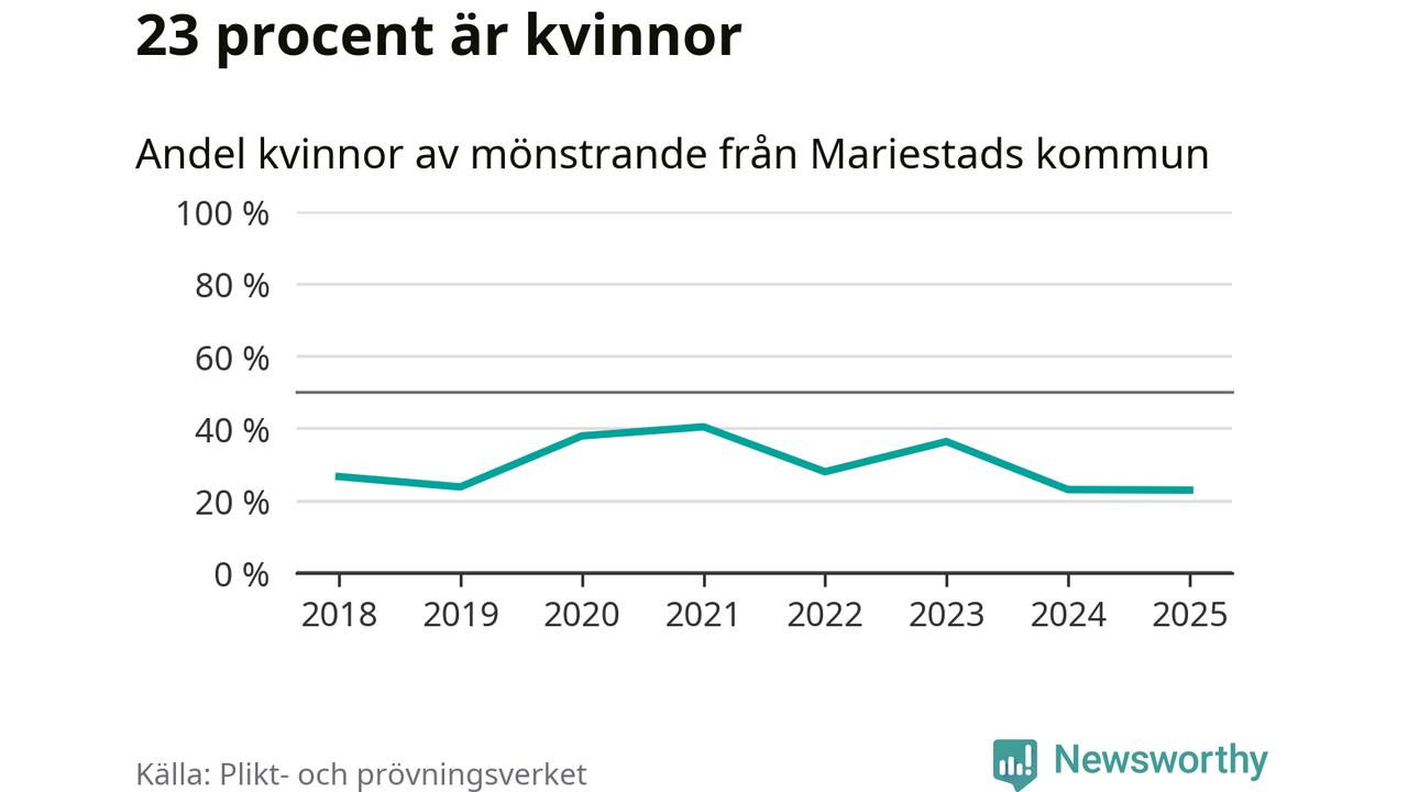 Av de som skrivits in till någon av Försvarmaktens grundutbildningar det senaste året, från juni 2024 till mars i år, kommer 20 (alla män) från Mariestad. 18 av dessa antogs efter att ha kallats till mönstring.