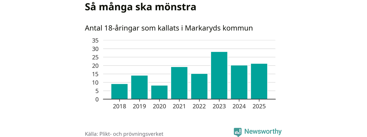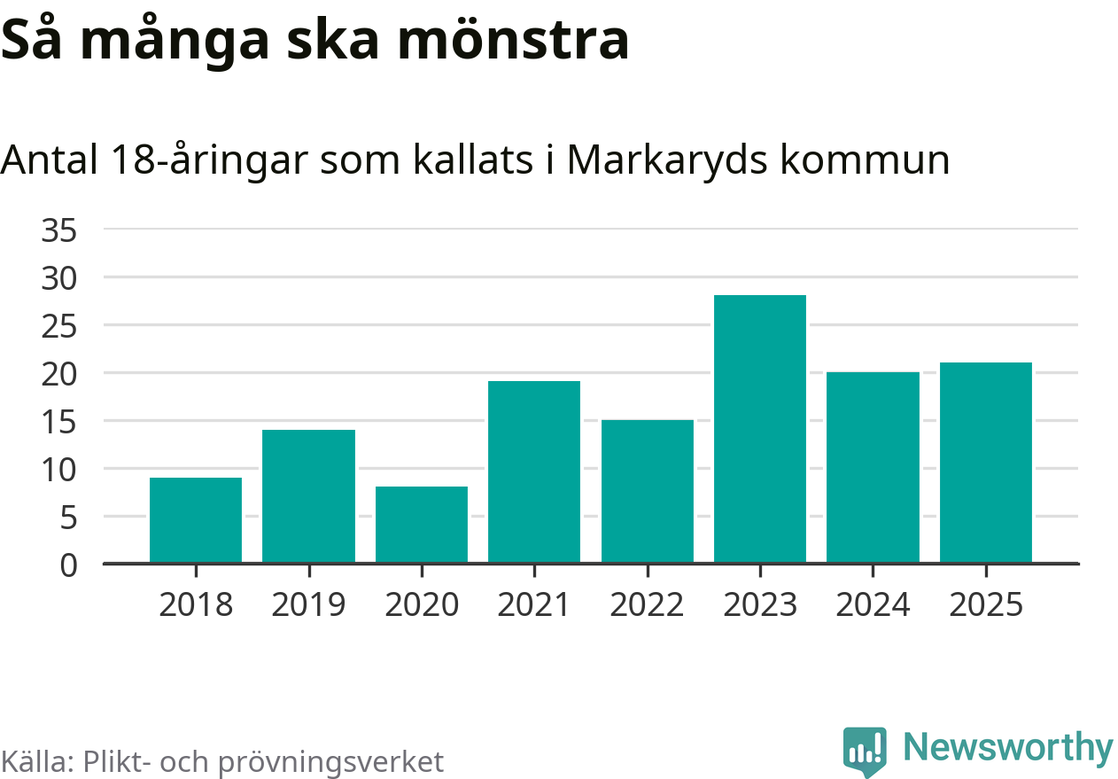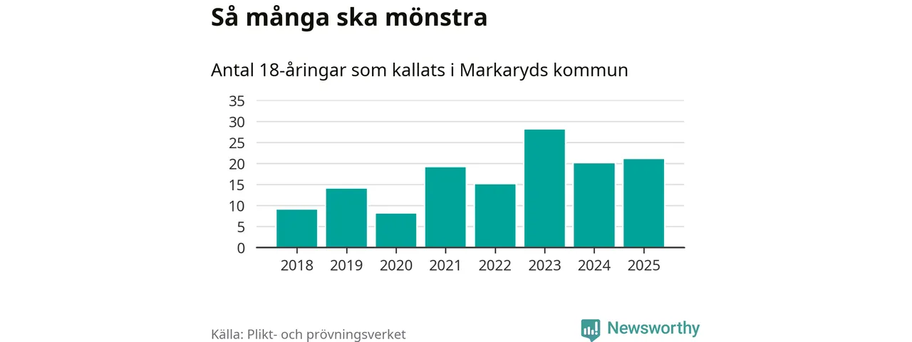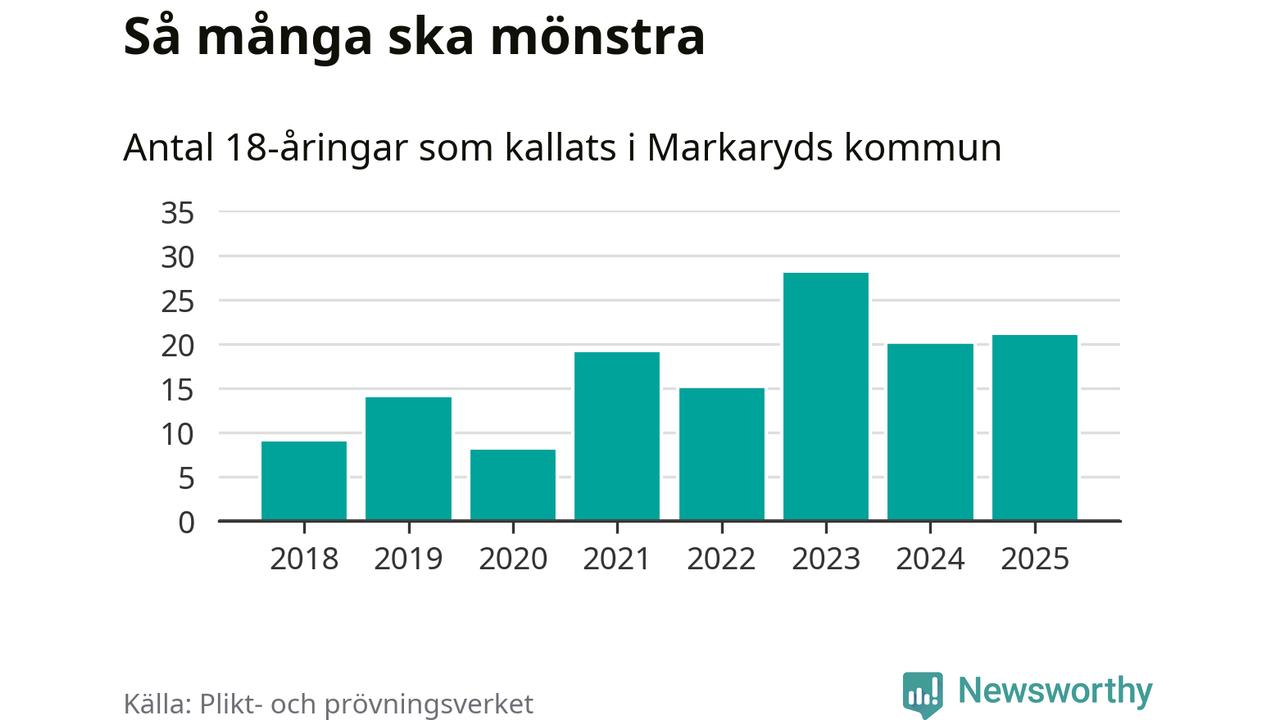 Nu kallas omkring 28 200 svenskar födda 2007 till mönstring. Och 21 av dem kommer från Markaryd, enligt ny statistik från Plikt- och prövningsverket. Det innebär att var femte invånare i åldersgruppen i kommunen kallas till mönstring. Det är en lägre andel än i Kronoberg totalt. I riket som helhet kallas nästan var fjärde person i årskullen.