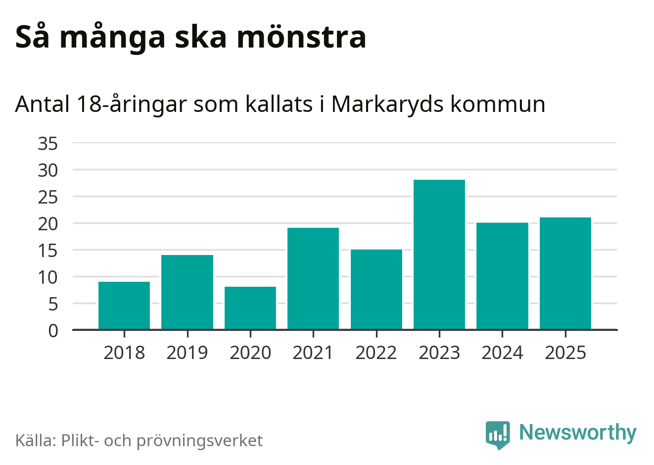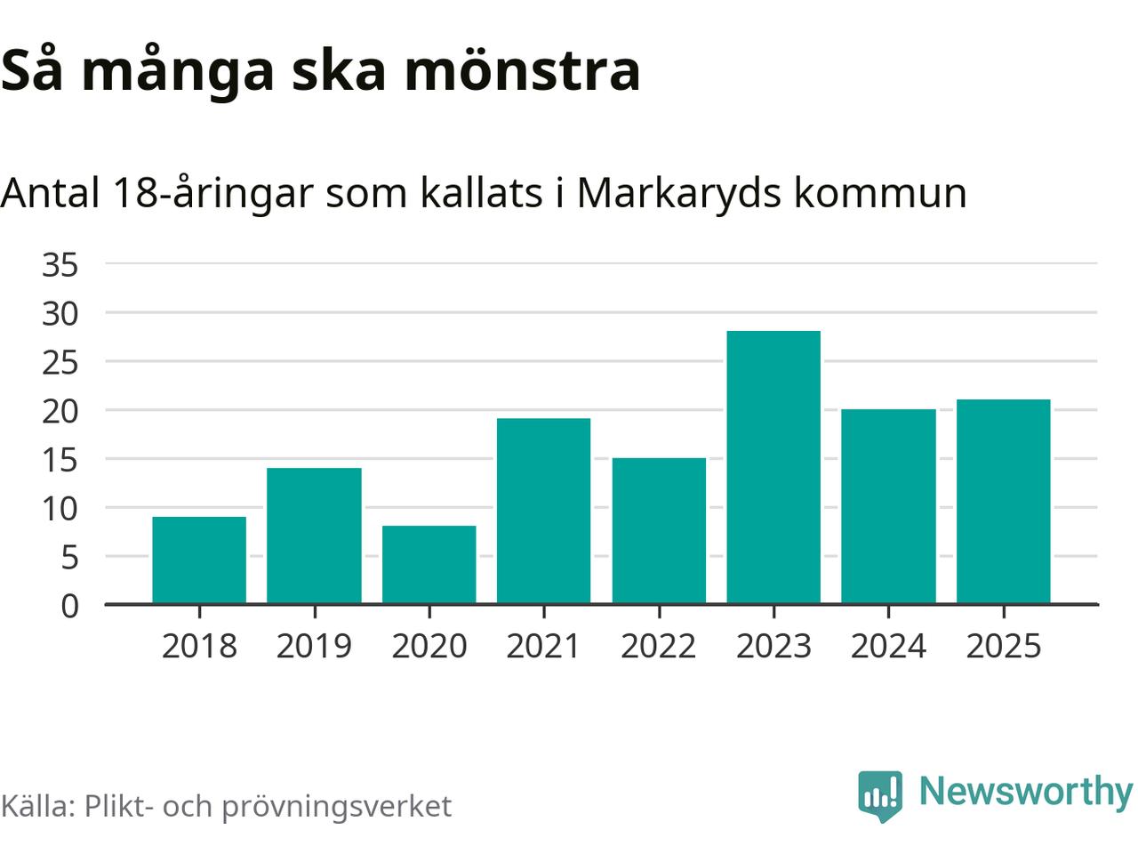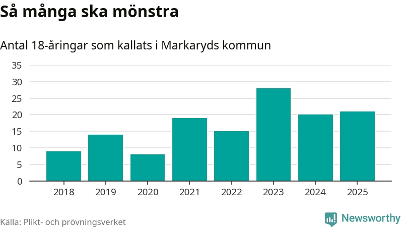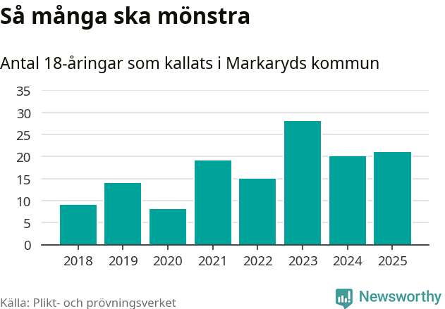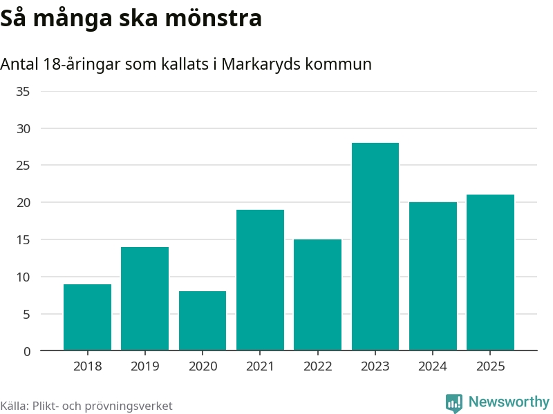 Nu kallas omkring 28 200 svenskar födda 2007 till mönstring. Och 21 av dem kommer från Markaryd, enligt ny statistik från Plikt- och prövningsverket. Det innebär att var femte invånare i åldersgruppen i kommunen kallas till mönstring. Det är en lägre andel än i Kronoberg totalt. I riket som helhet kallas nästan var fjärde person i årskullen.