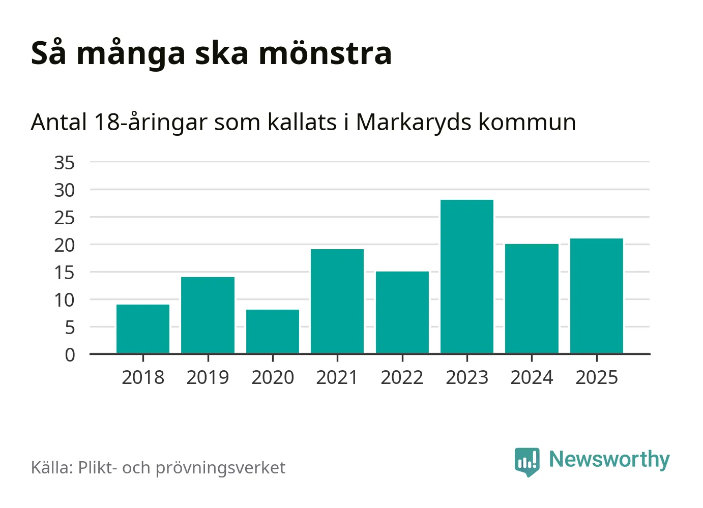 21 personer är en fler än 2024, men sett som andel av respektive åldersgrupp är skillnaden liten. Som mest har 28 personer från en årskull kommunen mönstrat (2023). Totalt från Kronobergs län kallas 580 personer i år.