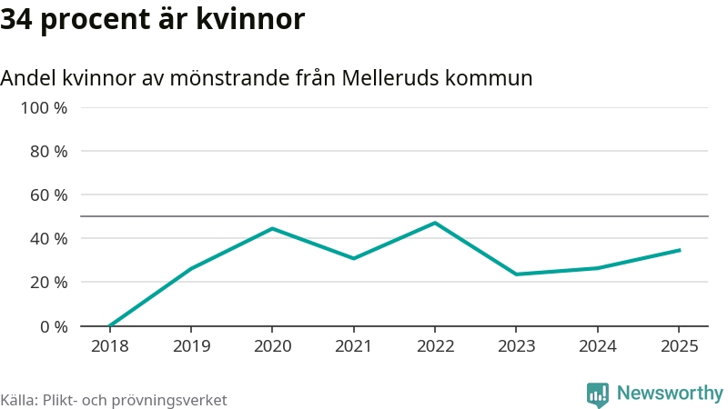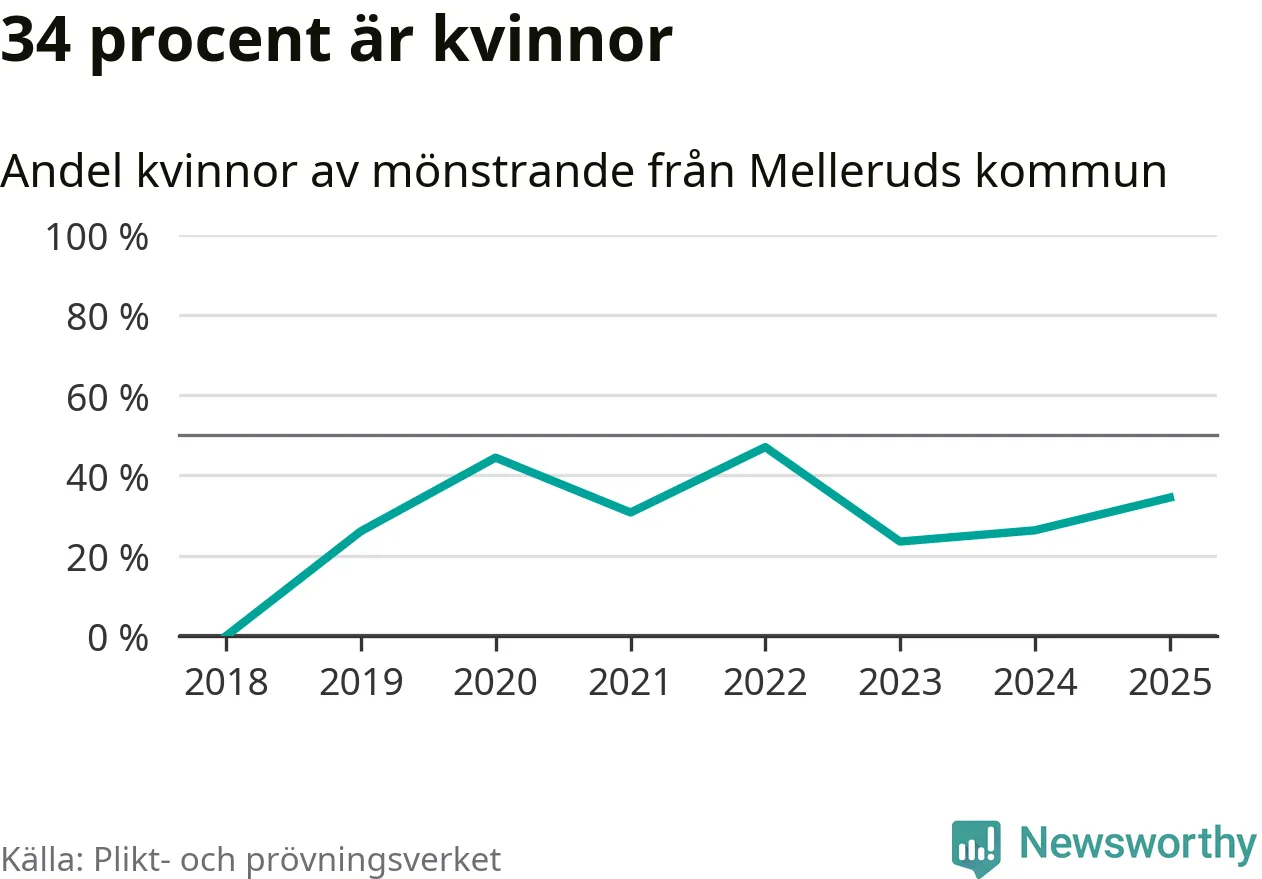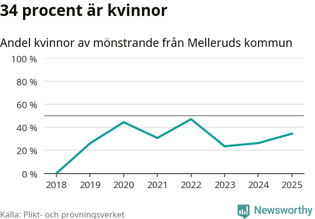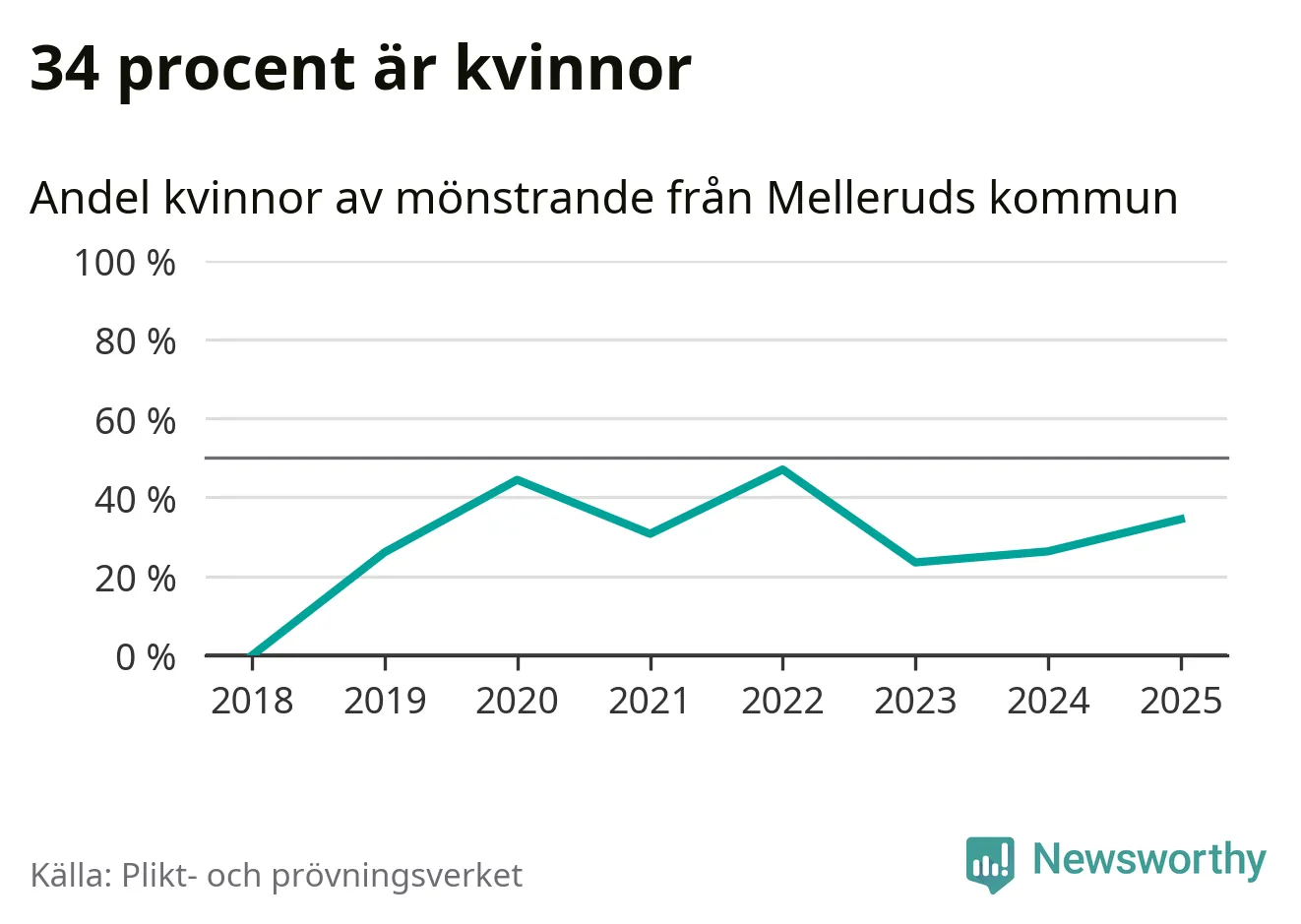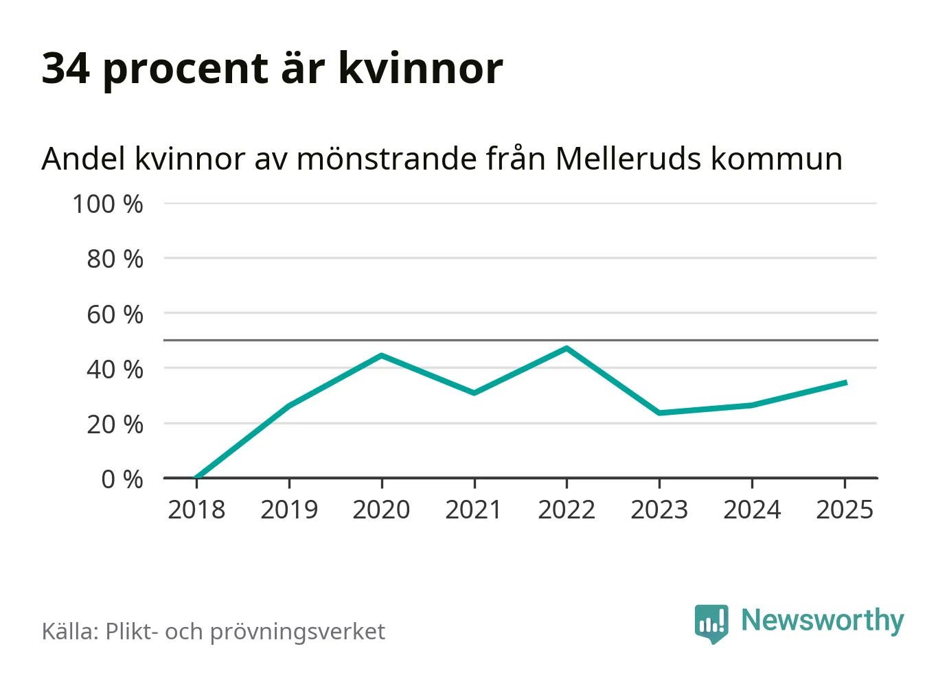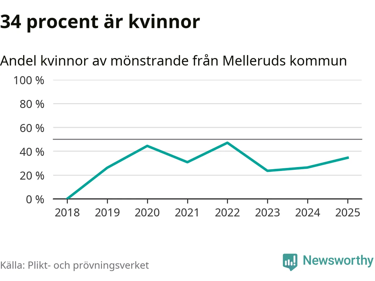 Tio av de som kallats till mönstring från Mellerud är kvinnor, vilket motsvarar 34 procent av de mönstrande. I absoluta tal är det fler kvinnor än något år sedan värnplikten återinfördes, men 2022 var en större andel av de mönstrande från kommunen kvinnor (47 procent). I riket som helhet är 28 procent av de mönstrande tjejer.