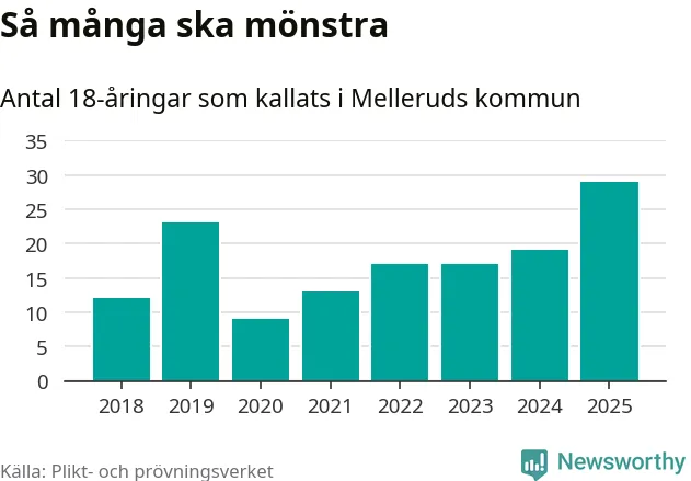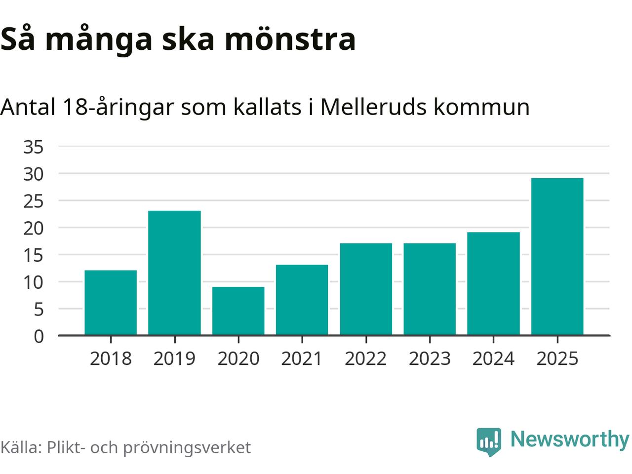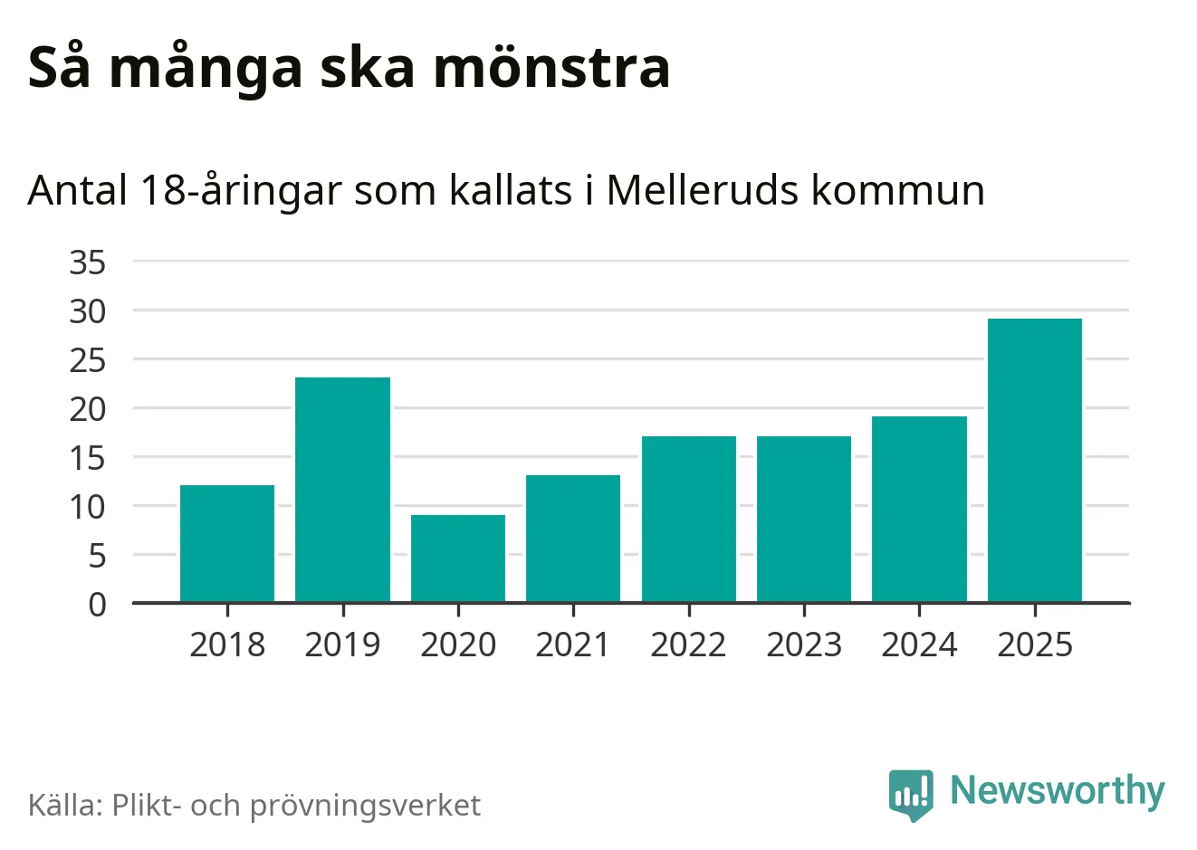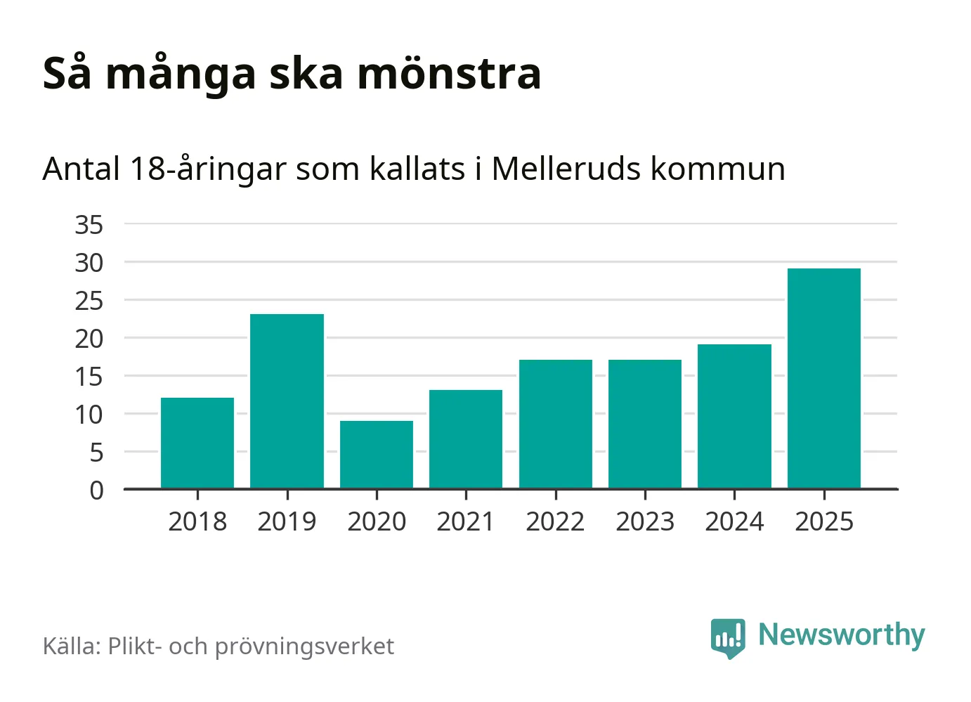 29 personer är det högsta antalet kallade i Mellerud sedan 2018, som är första året med statistik på kommunnivå (värnplikten återinfördes 2017), och tio mönstrande fler än 2024. Totalt från Västra Götalands län kallas 4 523 personer i år.