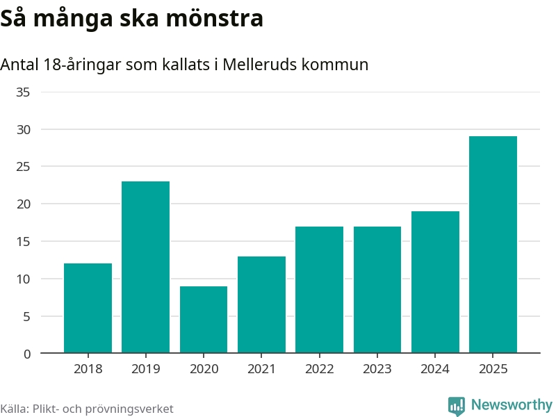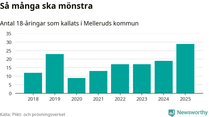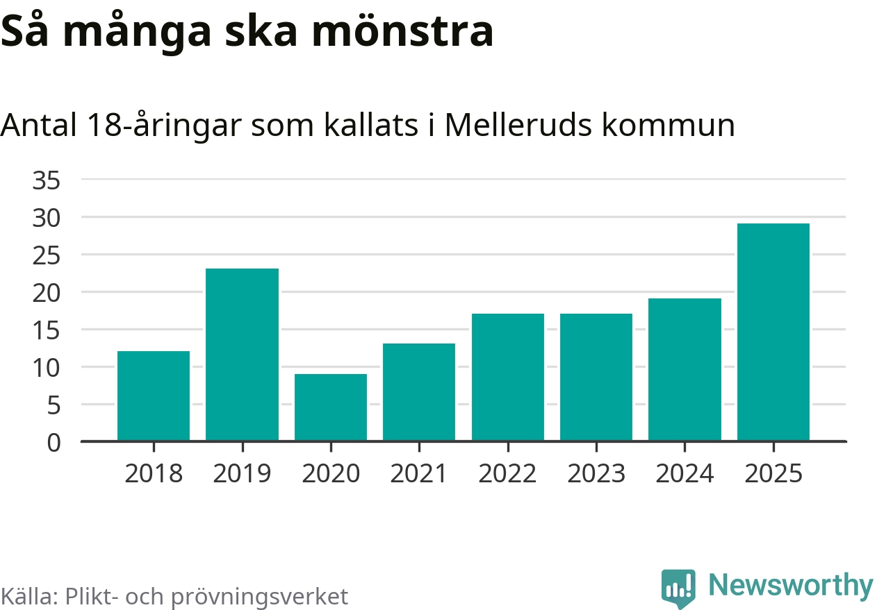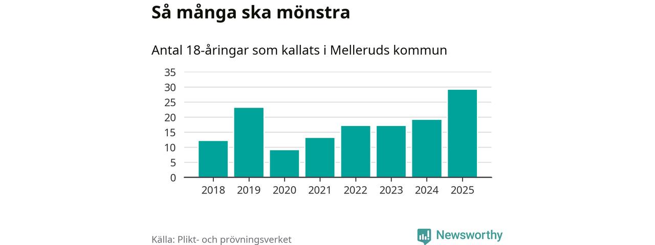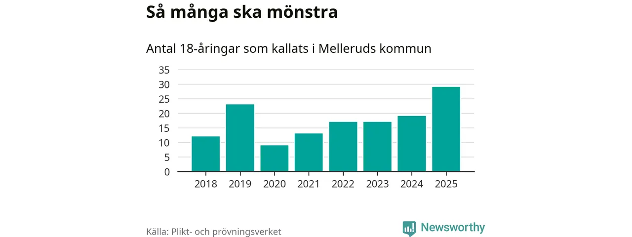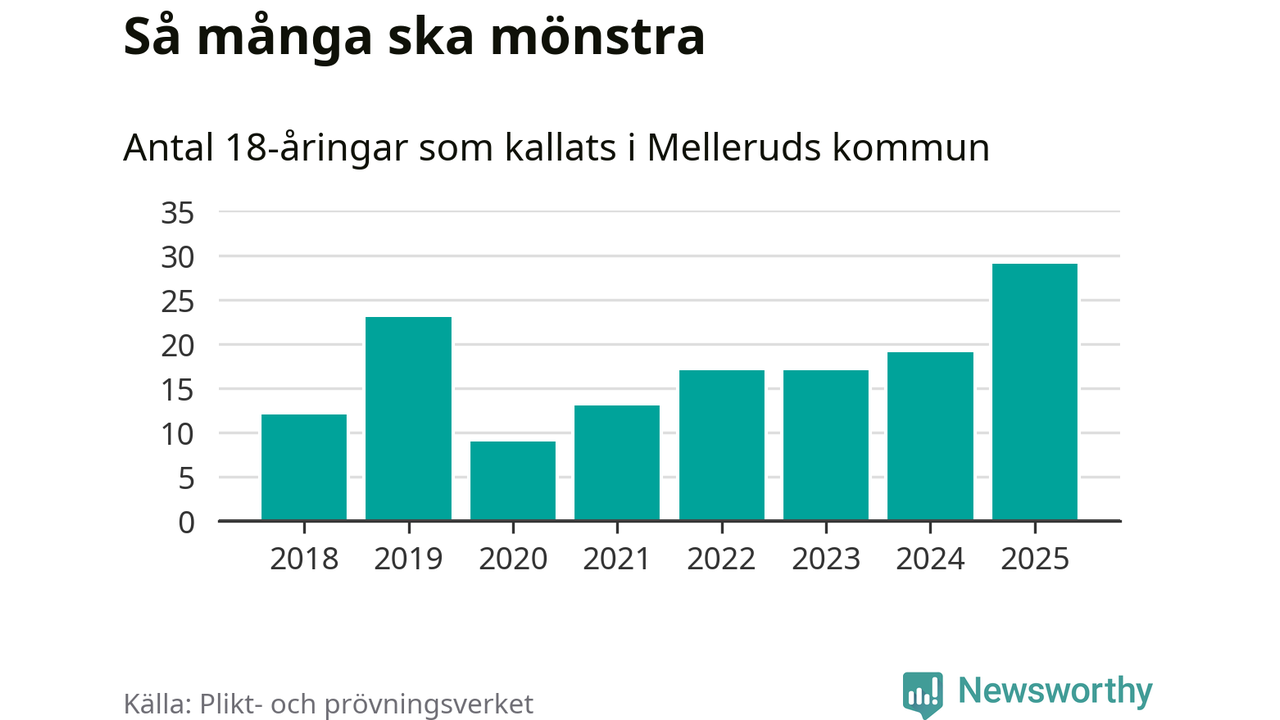29 personer är det högsta antalet kallade i Mellerud sedan 2018, som är första året med statistik på kommunnivå (värnplikten återinfördes 2017), och tio mönstrande fler än 2024. Totalt från Västra Götalands län kallas 4 523 personer i år.