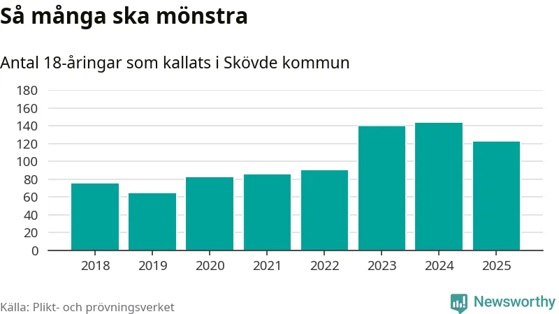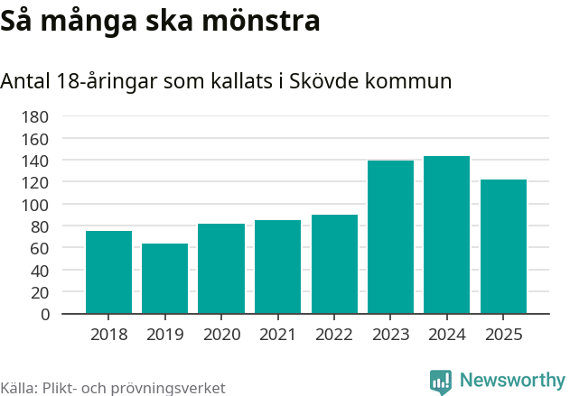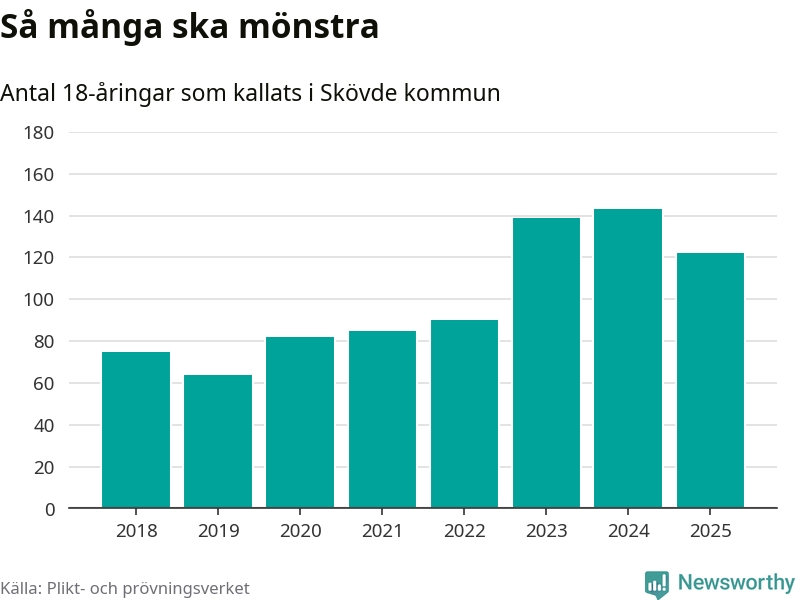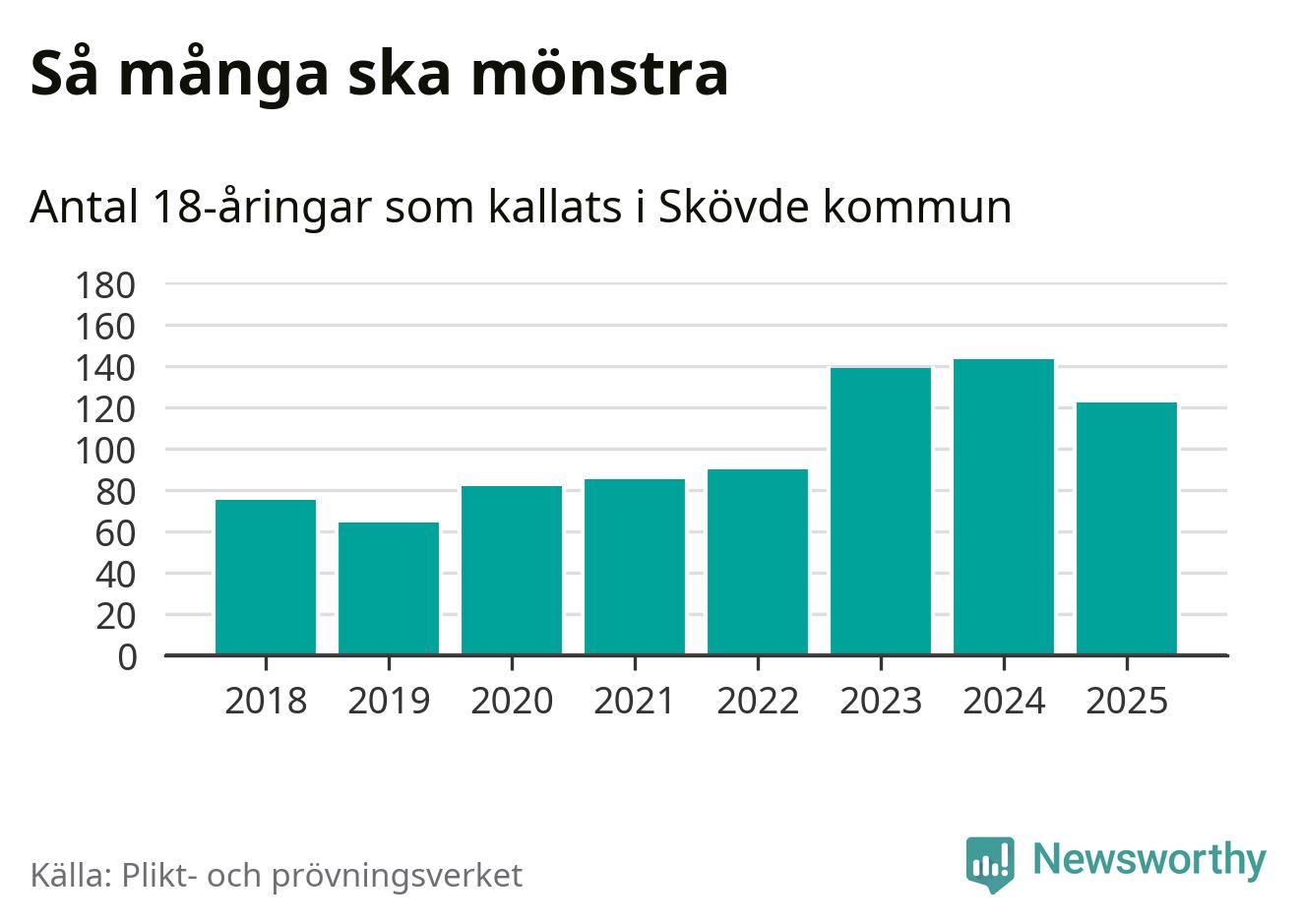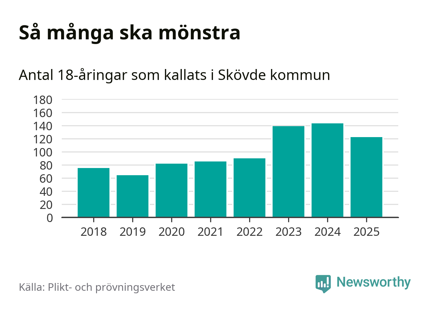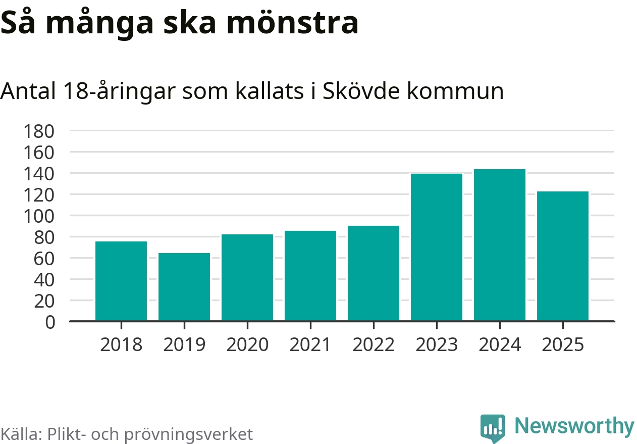 Nu kallas omkring 28 200 svenskar födda 2007 till mönstring. Och 122 av dem kommer från Skövde, enligt ny statistik från Plikt- och prövningsverket. Det innebär att var femte invånare i åldersgruppen i kommunen kallas till mönstring. Det är en lägre andel än i Västra Götaland totalt. I riket som helhet kallas nästan var fjärde person i årskullen.