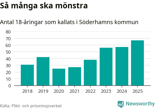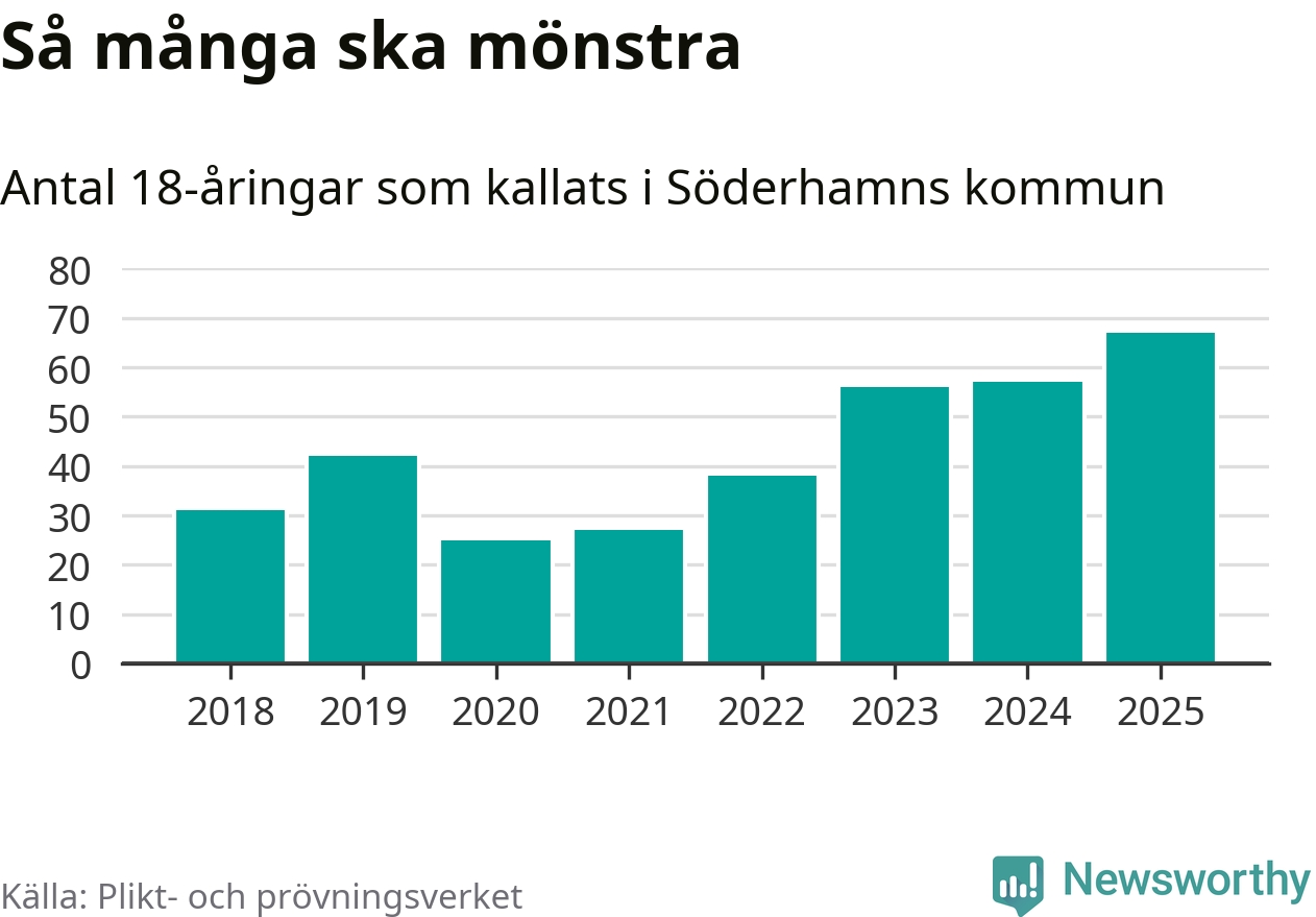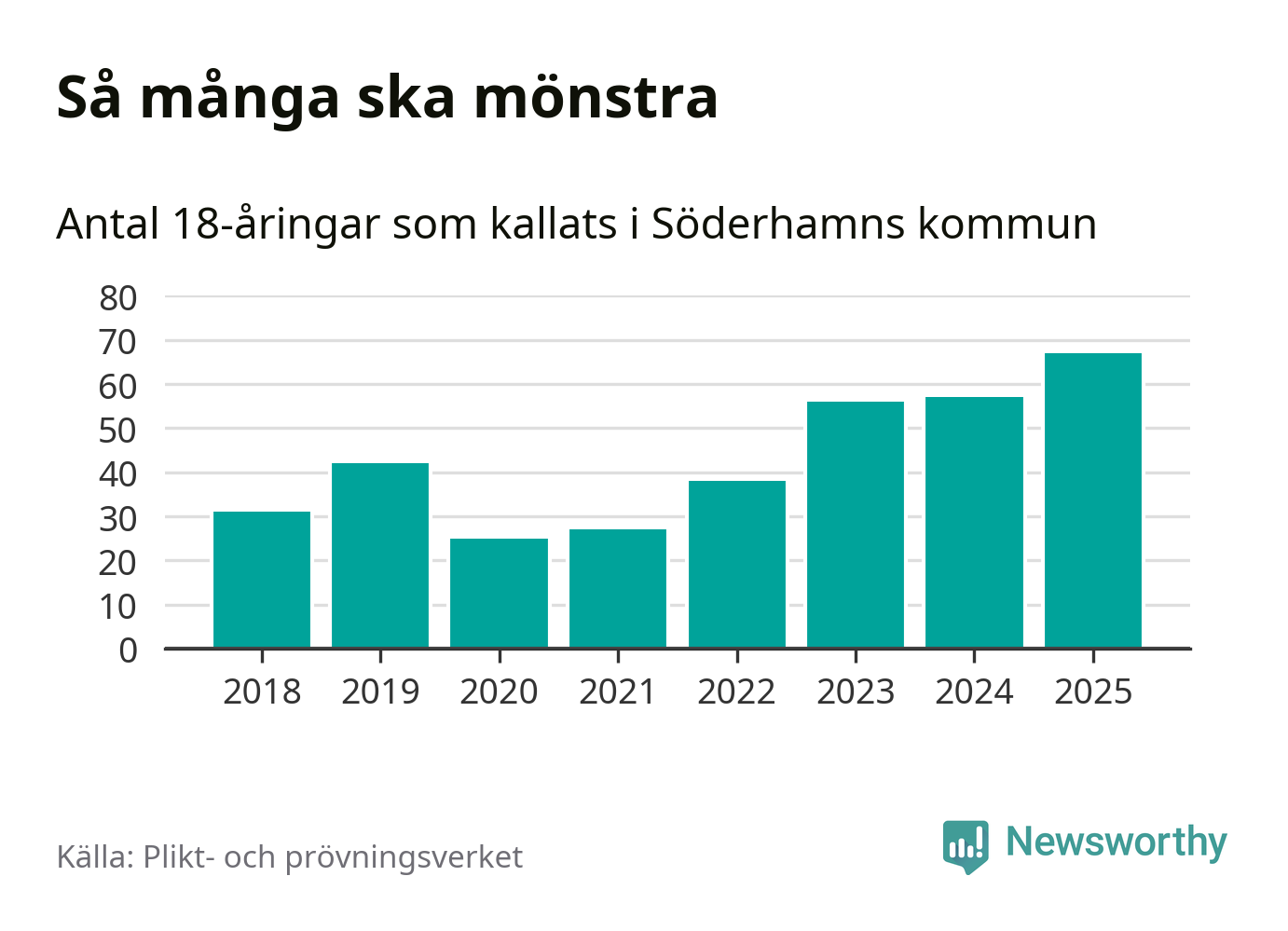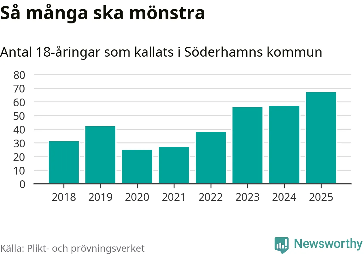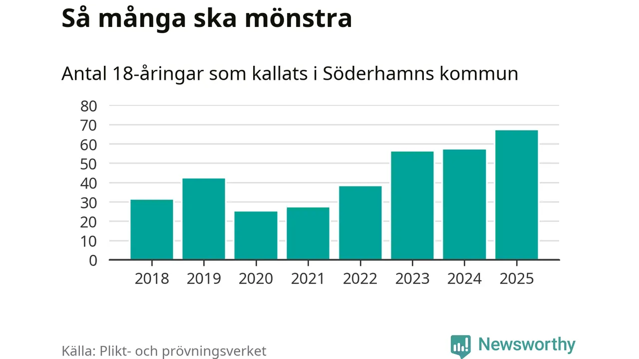 67 personer är det högsta antalet kallade i Söderhamn sedan 2018, som är första året med statistik på kommunnivå (värnplikten återinfördes 2017), och tio mönstrande fler än 2024. Totalt från Gävleborgs län kallas 710 personer i år.