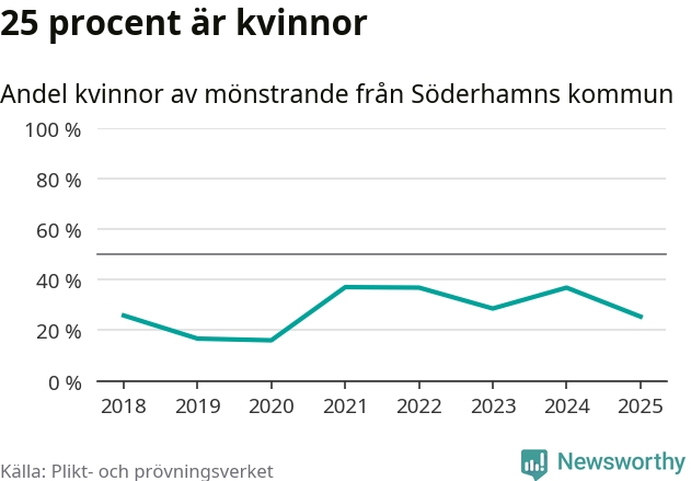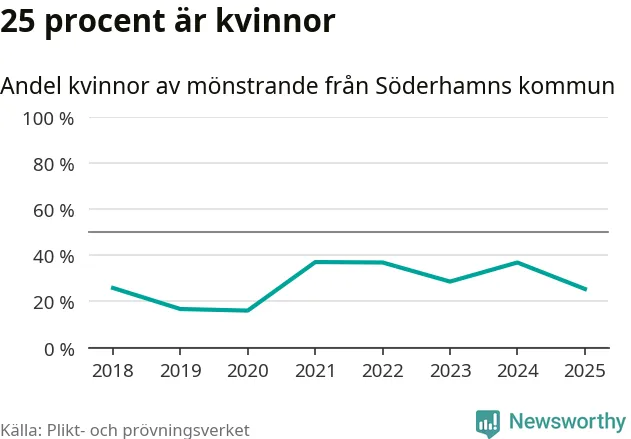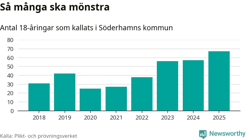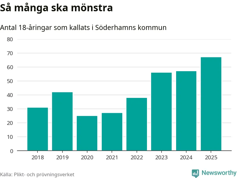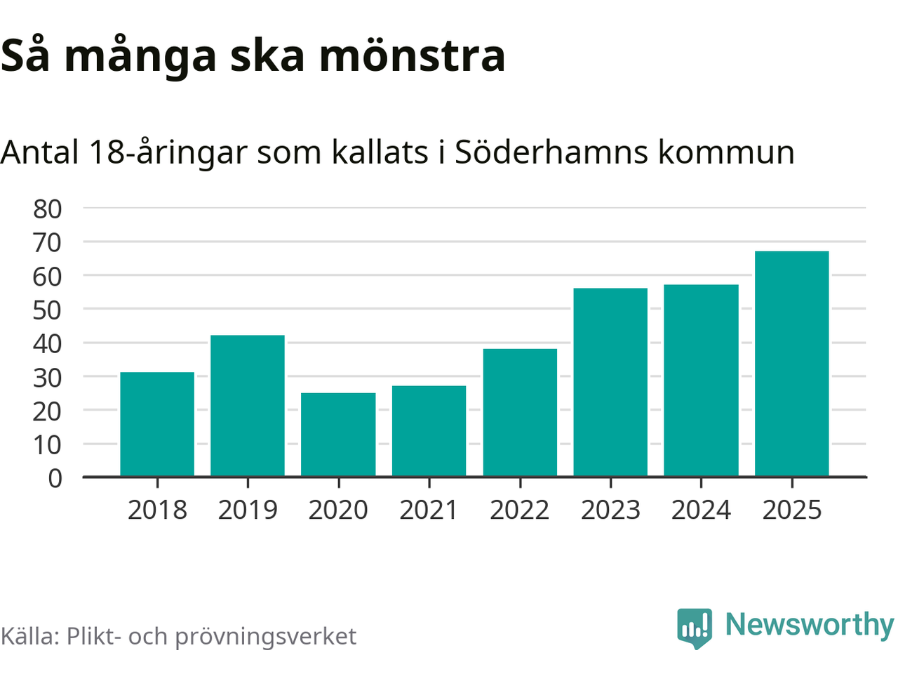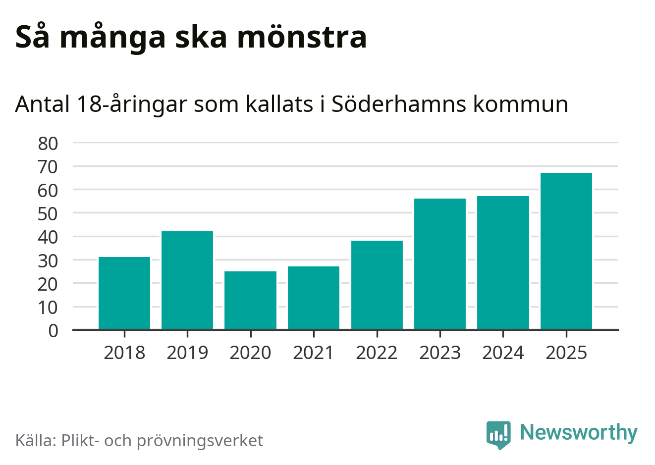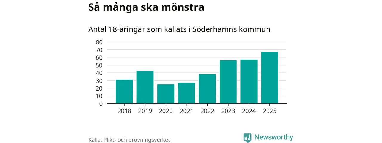 67 personer är det högsta antalet kallade i Söderhamn sedan 2018, som är första året med statistik på kommunnivå (värnplikten återinfördes 2017), och tio mönstrande fler än 2024. Totalt från Gävleborgs län kallas 710 personer i år.