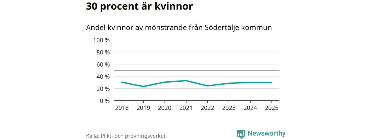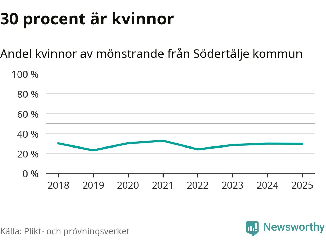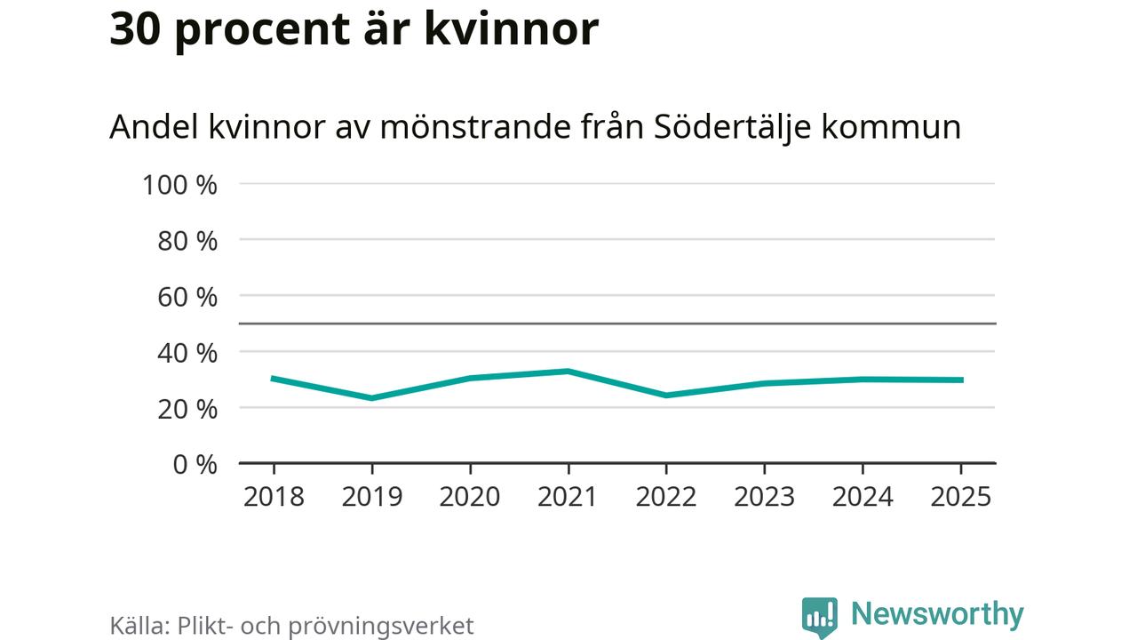 54 av de som kallats till mönstring från Södertälje är kvinnor, vilket motsvarar 30 procent av de mönstrande. I absoluta tal är det fler kvinnor än något år sedan värnplikten återinfördes, men 2021 var en större andel av de mönstrande från kommunen kvinnor (33 procent). I riket som helhet är 28 procent av de mönstrande tjejer.