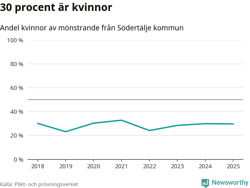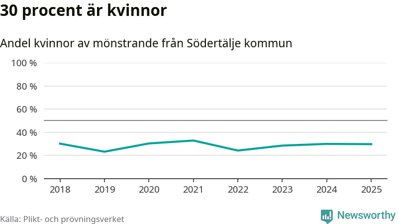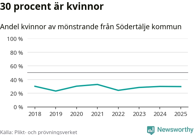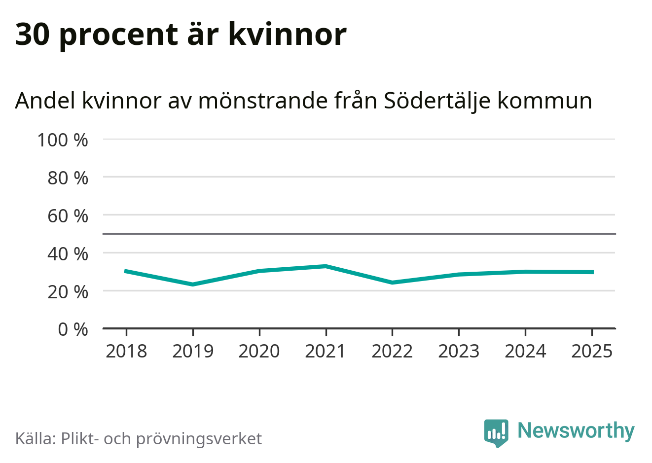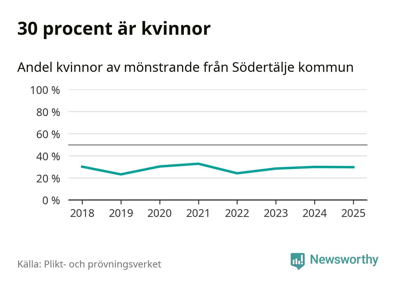 54 av de som kallats till mönstring från Södertälje är kvinnor, vilket motsvarar 30 procent av de mönstrande. I absoluta tal är det fler kvinnor än något år sedan värnplikten återinfördes, men 2021 var en större andel av de mönstrande från kommunen kvinnor (33 procent). I riket som helhet är 28 procent av de mönstrande tjejer.