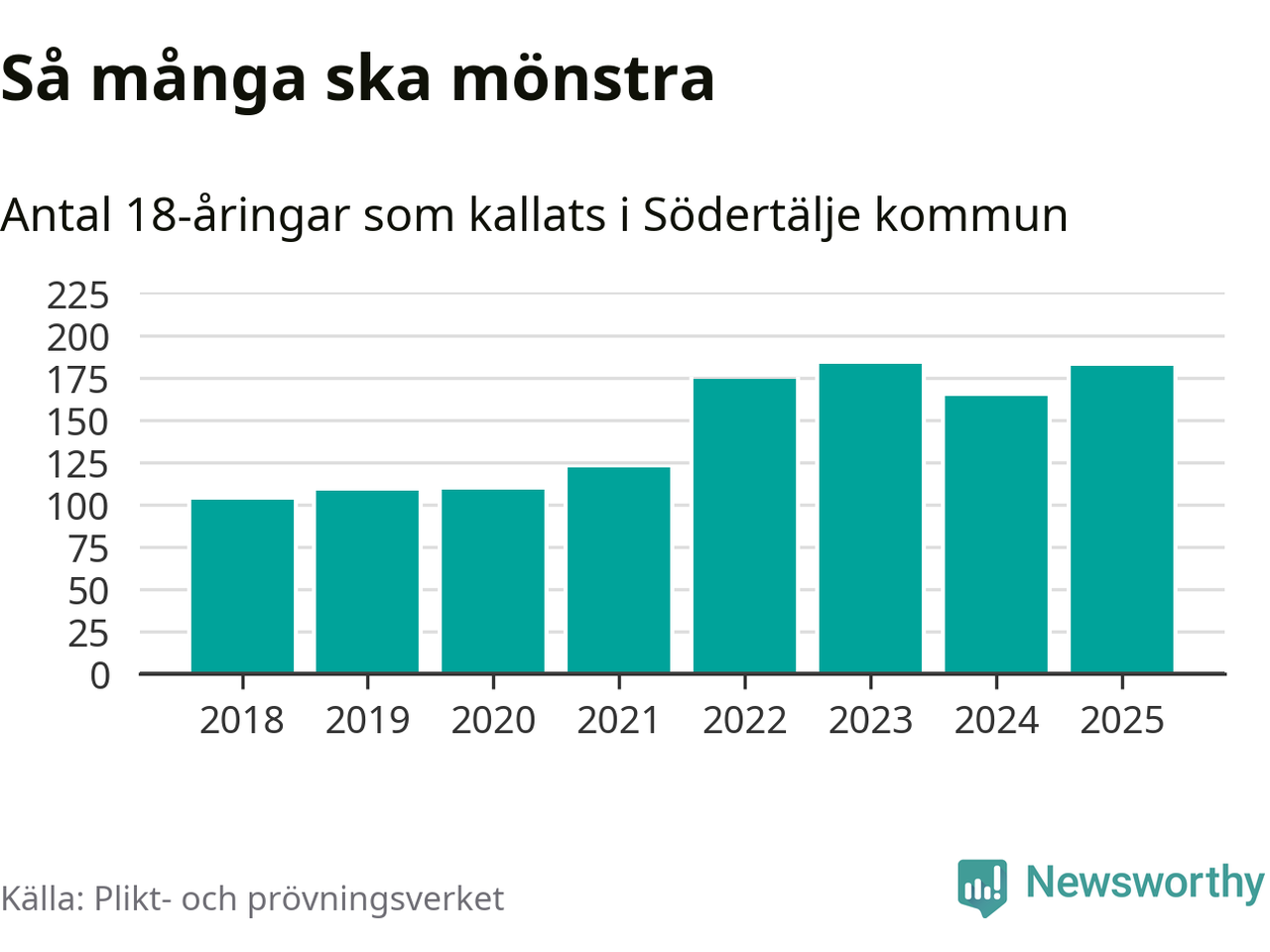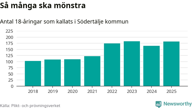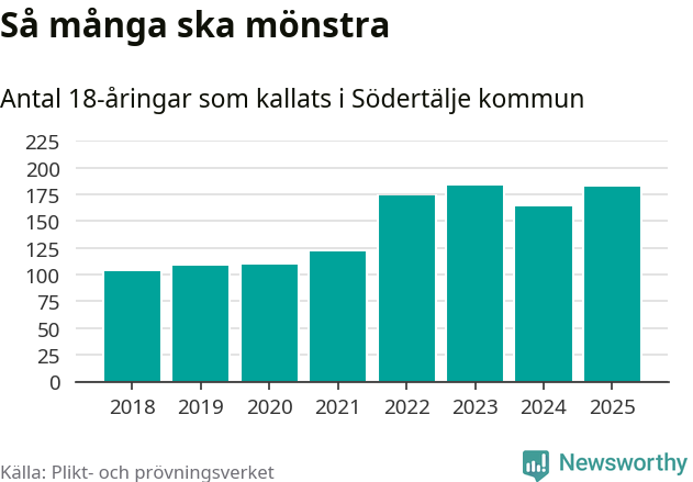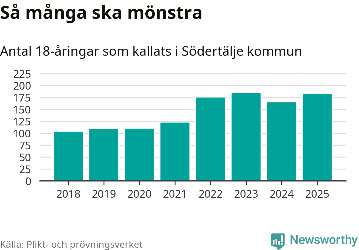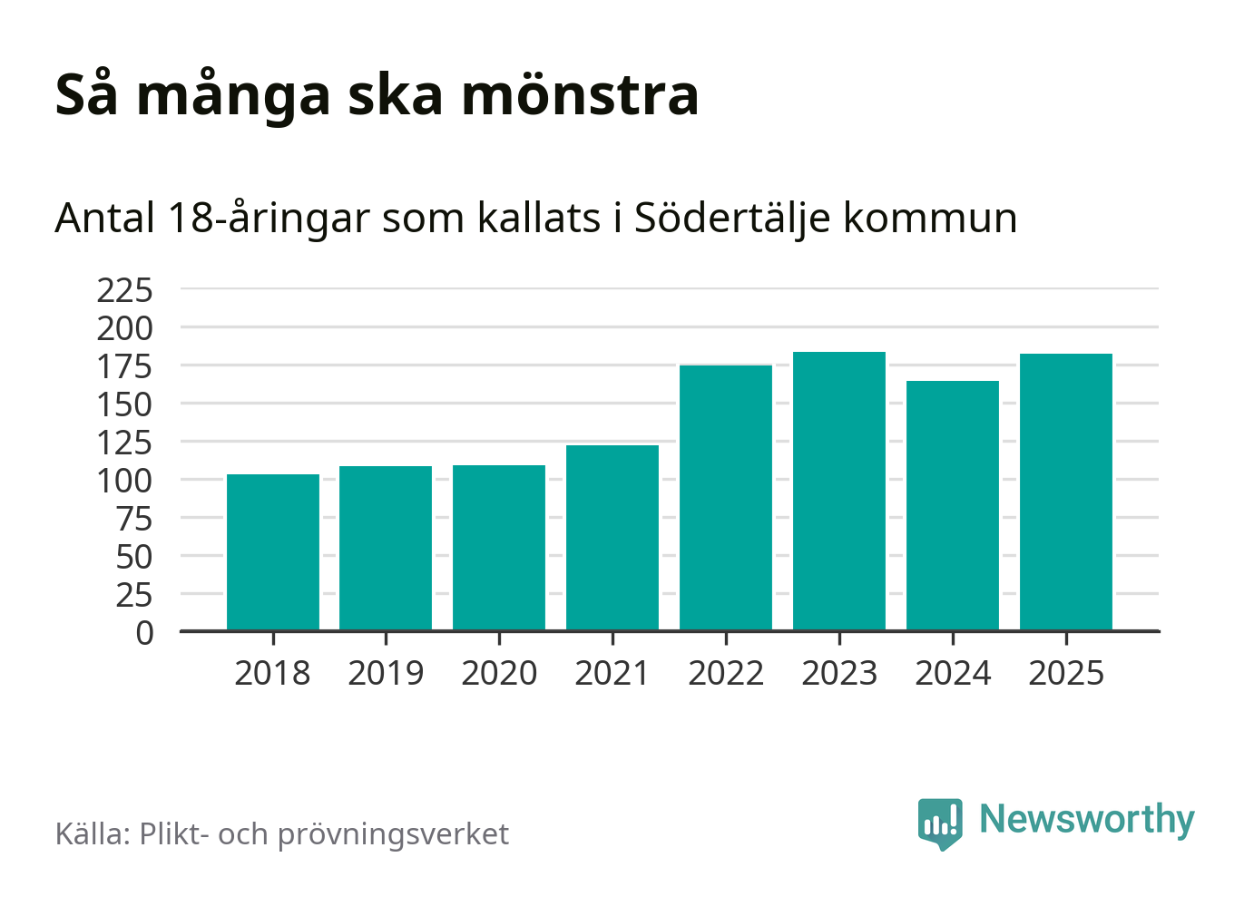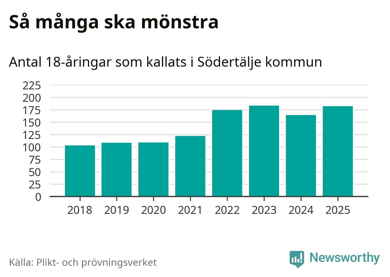 Nu kallas omkring 28 200 svenskar födda 2007 till mönstring. Och 182 av dem kommer från Södertälje, enligt ny statistik från Plikt- och prövningsverket. Det innebär att var sjunde invånare i åldersgruppen i kommunen kallas till mönstring. Det är en lägre andel än i Stockholms län totalt. I riket som helhet kallas nästan var fjärde person i årskullen.