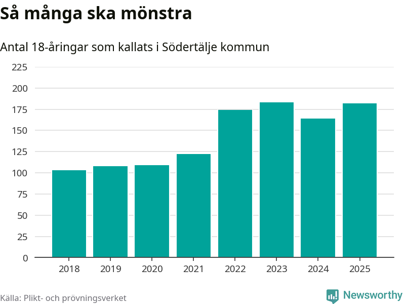 182 personer är 18 fler än 2024, men sett som andel av respektive åldersgrupp är skillnaden liten. Som mest har 183 personer från en årskull kommunen mönstrat (2023). Totalt från Stockholms län kallas 6 801 personer i år.