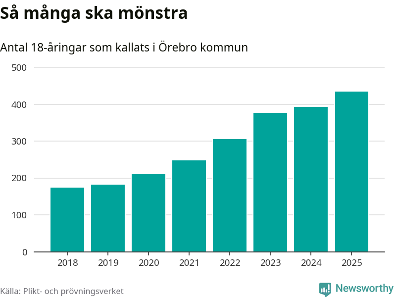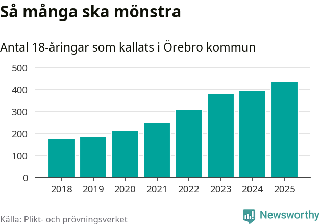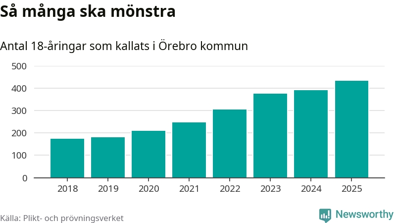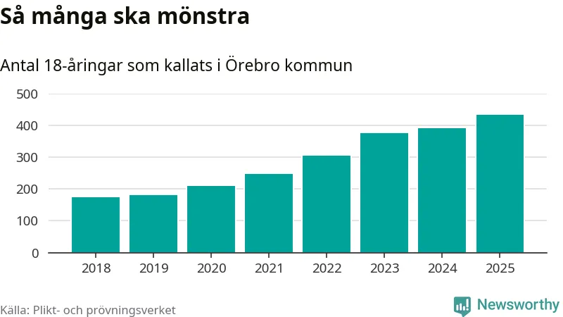 Antalet kallade i Örebro kommun har ökat varje år sedan 2018, som är första året med statistik på kommunnivå (värnplikten återinfördes 2017), och jämfört med 2024 är det 41 fler i år. Totalt från Örebro län kallas 828 personer i år.