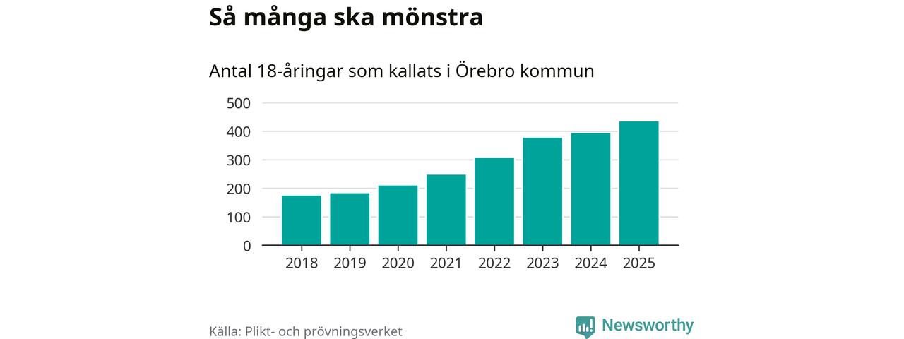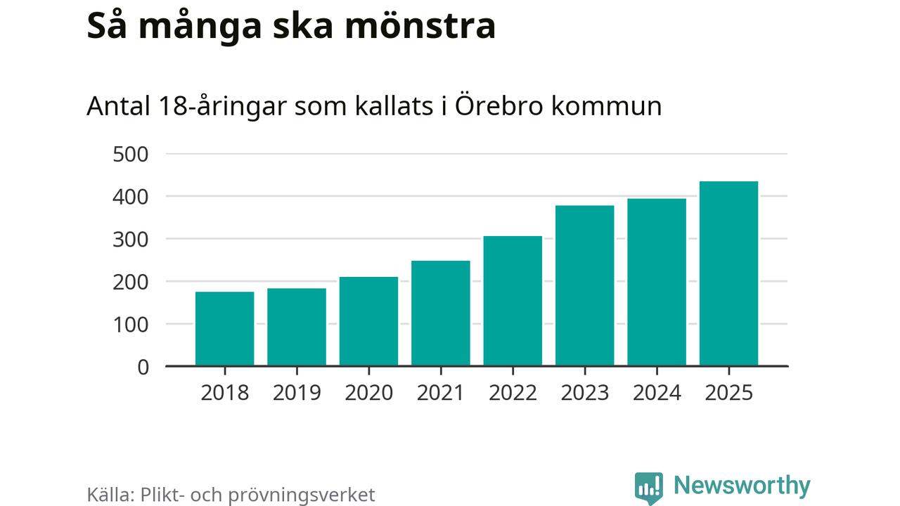 Nu kallas omkring 28 200 svenskar födda 2007 till mönstring. Och 434 av dem kommer från Örebro kommun, enligt ny statistik från Plikt- och prövningsverket. Det innebär att nästan var fjärde invånare i åldersgruppen i kommunen kallas till mönstring. Det är ungefär lika stor andel som i Örebro län totalt. Även i riket som helhet kallas nästan var fjärde person i årskullen.