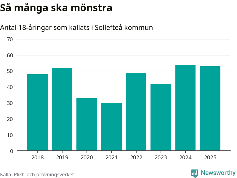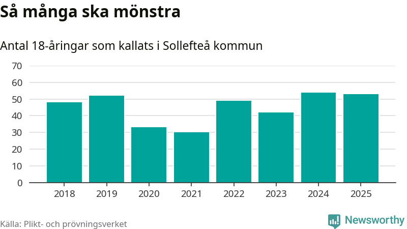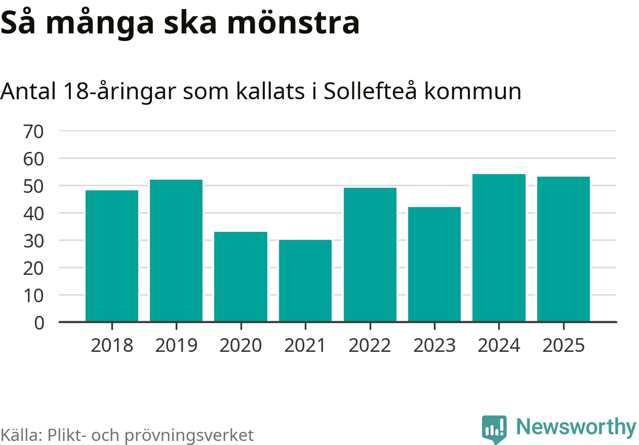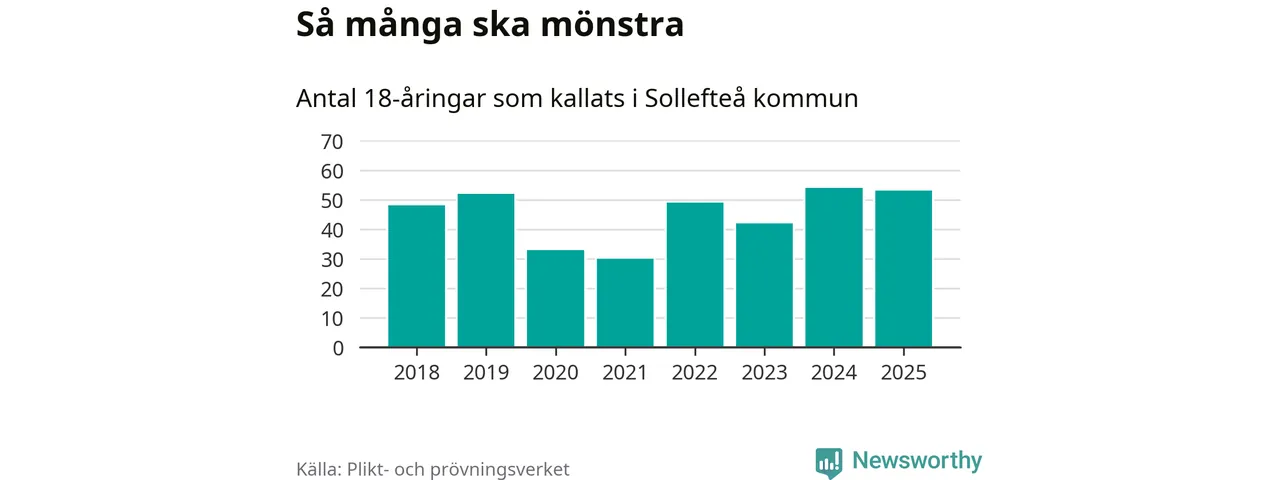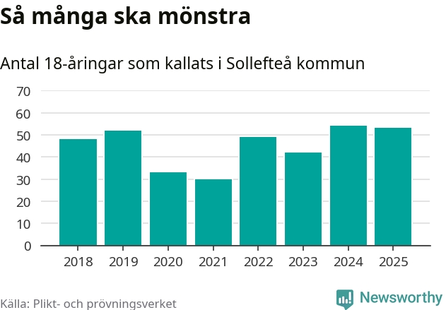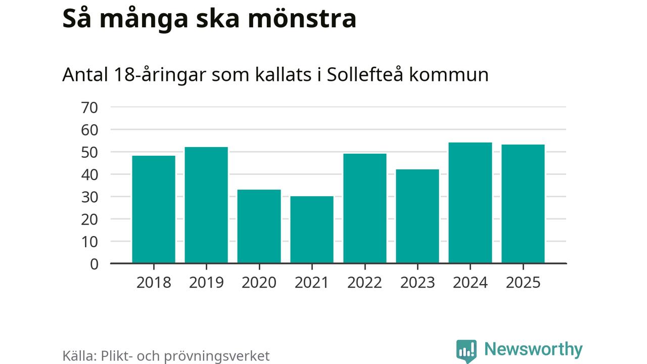 Nu kallas omkring 28 200 svenskar födda 2007 till mönstring. Och 53 av dem kommer från Sollefteå, enligt ny statistik från Plikt- och prövningsverket. Det innebär att mer än var fjärde invånare i åldersgruppen i kommunen kallas till mönstring. Det är en högre andel än i Västernorrland totalt. I riket som helhet kallas nästan var fjärde person i årskullen.