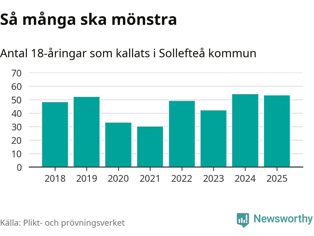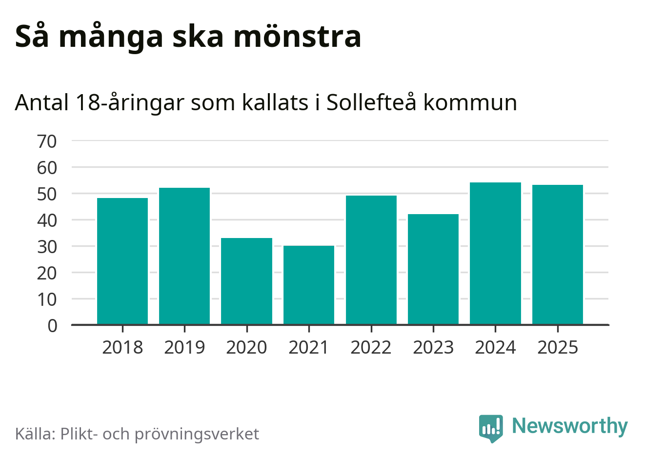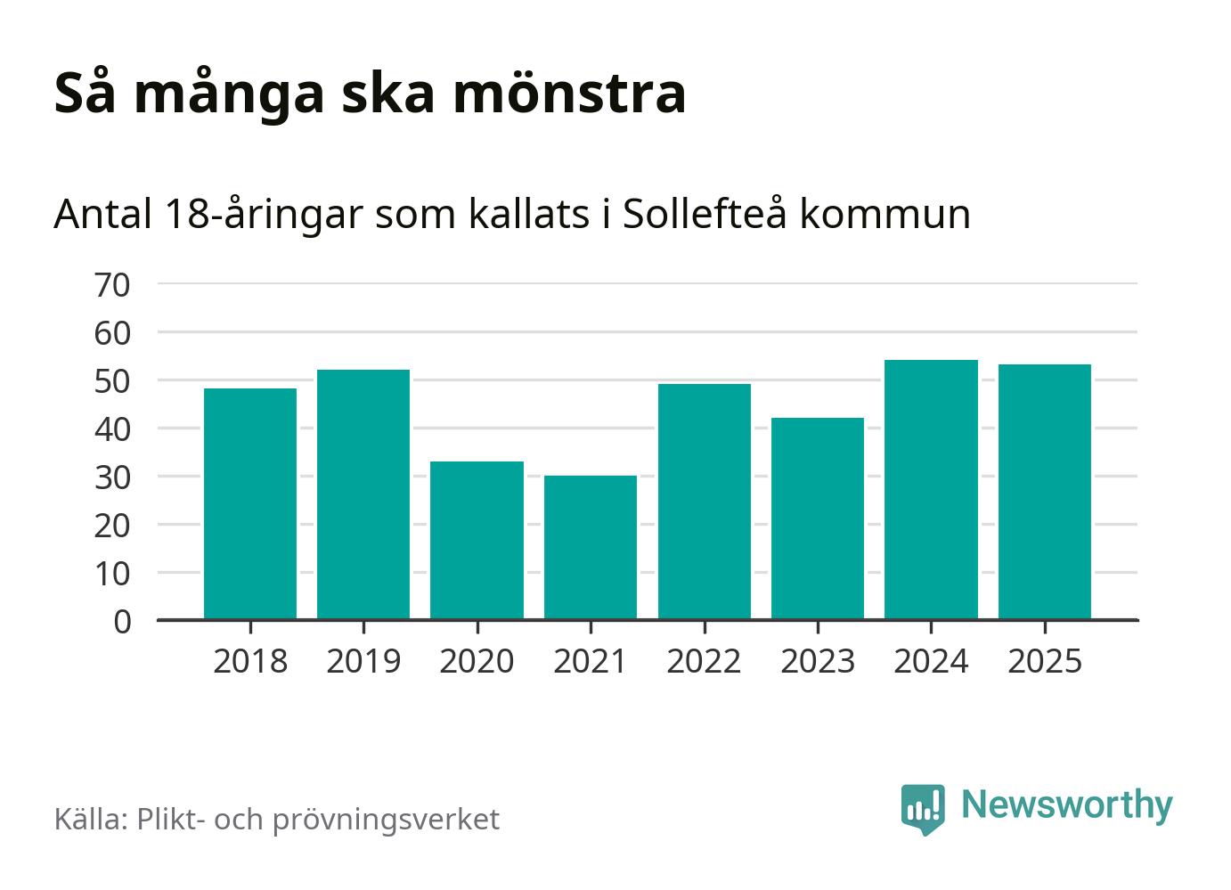 Nu kallas omkring 28 200 svenskar födda 2007 till mönstring. Och 53 av dem kommer från Sollefteå, enligt ny statistik från Plikt- och prövningsverket. Det innebär att mer än var fjärde invånare i åldersgruppen i kommunen kallas till mönstring. Det är en högre andel än i Västernorrland totalt. I riket som helhet kallas nästan var fjärde person i årskullen.